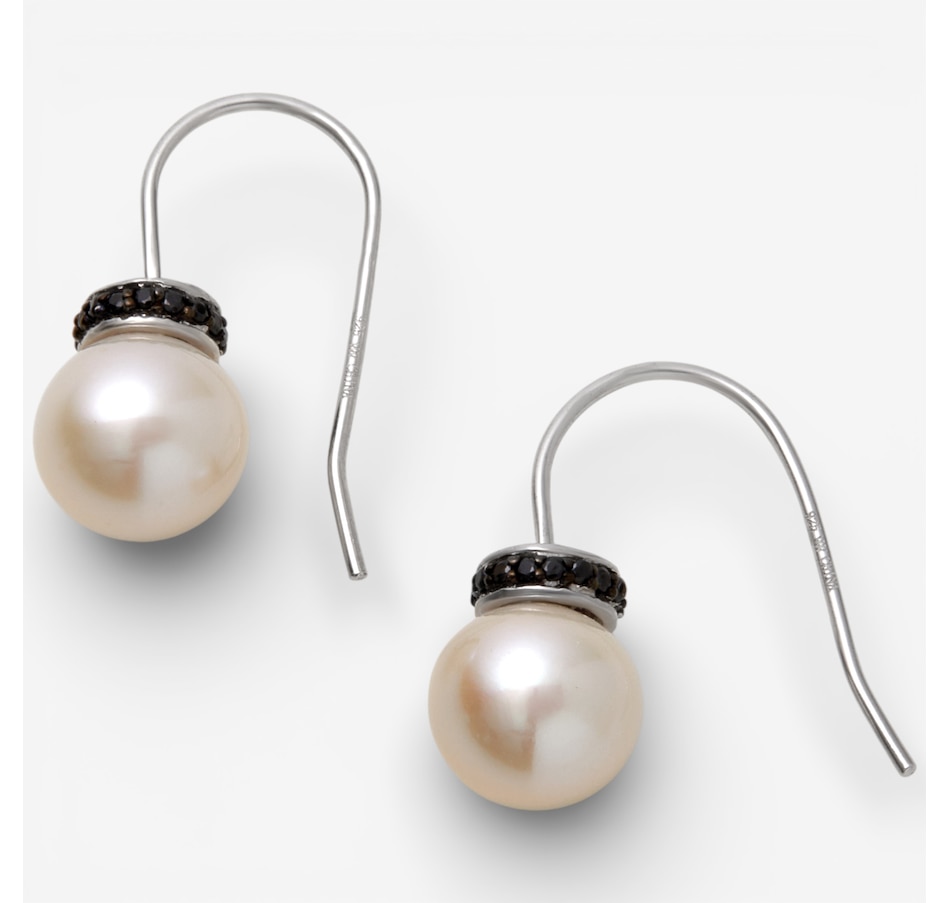 Roz Kwan Sterling Silver 8mm-8.5mm Round White Freshwater Pearl and Black Spinel Earrings