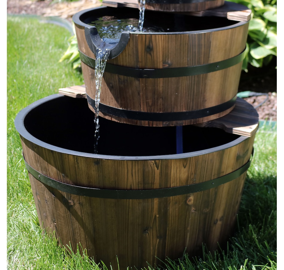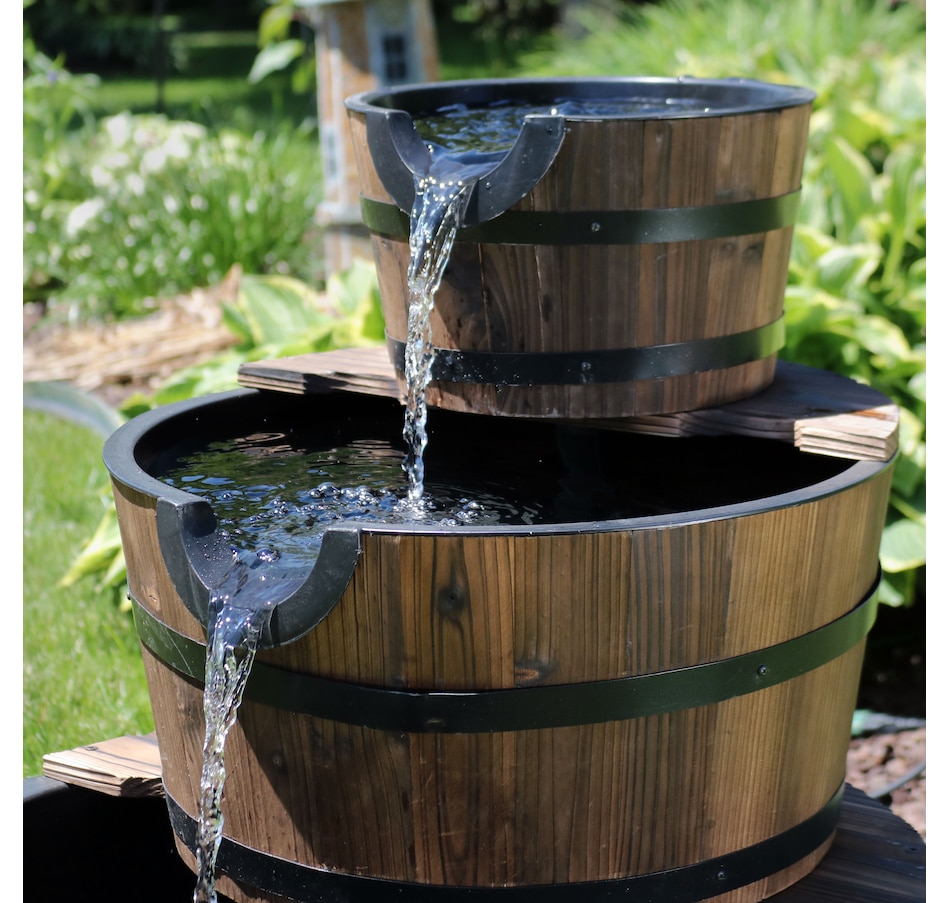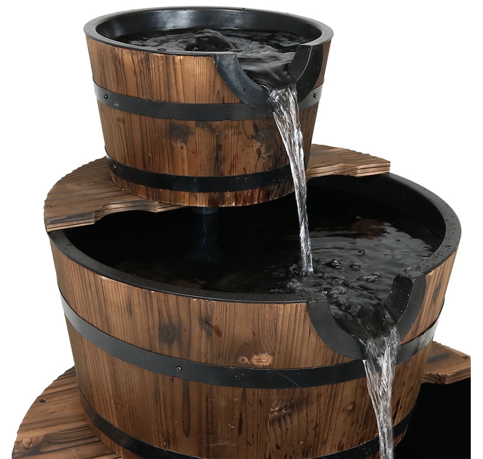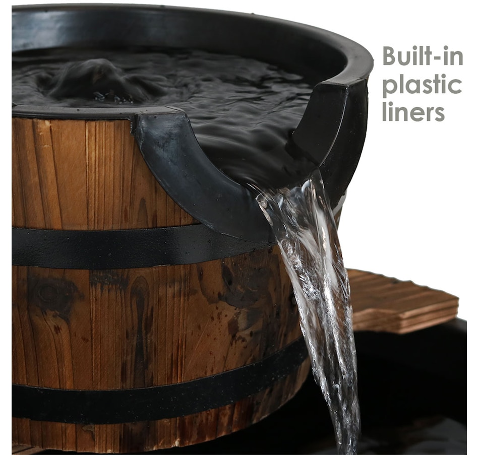 Give the backyard, garden, patio, deck, poolside, or yard a rustic appeal with this charming, outdoor patio water fountain. Each barrel is made of real fir and features metal rings, adding authentic details to this fountain. The durable plastic liners inside the barrels contain the gentle stream of water and ensure the longevity of this outdoor decor as it is not easily prone to rust or wear with extensive use. Water is circulated through the fountain with the included electric, submersible, JR-600 pump, making sure to keep quiet as the water sounds expand throughout the outdoor space. The JR-600 will pump up to 160 gallons per hour. No plumbing is required to set up this fountain. Simply fill it with water, plug it into a standard electric outlet, and watch the space transform. To minimize splashing, it is recommended to run the pump on the low setting and to fill the fountain with a maximum of 14 gallons of water.