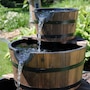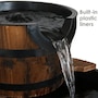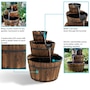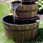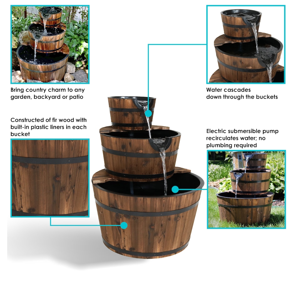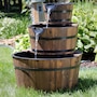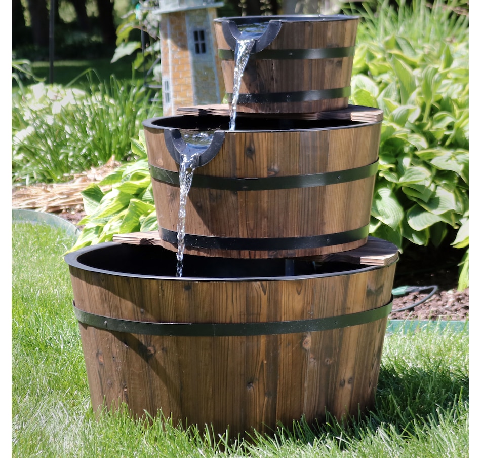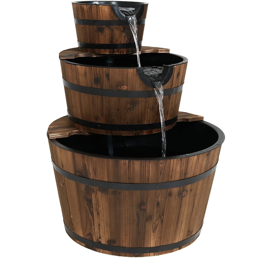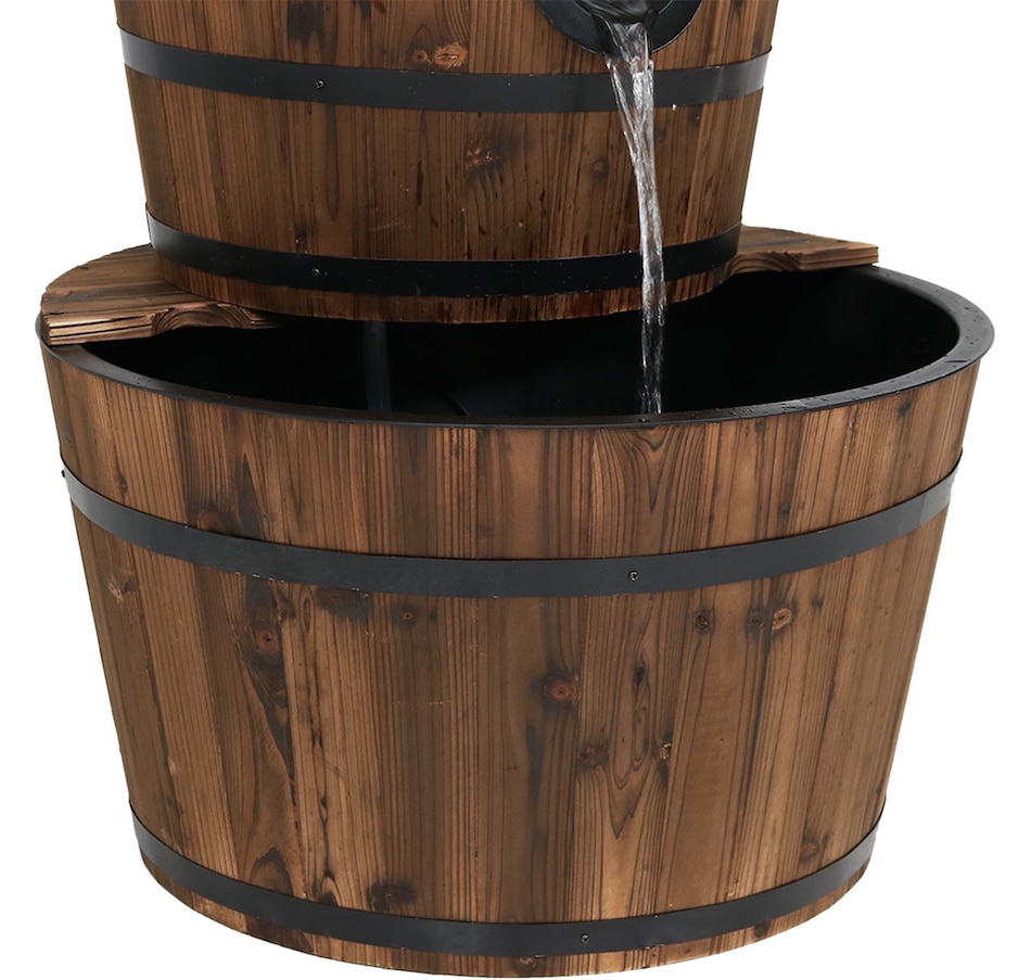 Give the backyard, garden, patio, deck, poolside, or yard a rustic appeal with this charming, outdoor patio water fountain. Each barrel is made of real fir and features metal rings, adding authentic details to this fountain. The durable plastic liners inside the barrels contain the gentle stream of water and ensure the longevity of this outdoor decor as it is not easily prone to rust or wear with extensive use. Water is circulated through the fountain with the included electric, submersible, JR-600 pump, making sure to keep quiet as the water sounds expand throughout the outdoor space. The JR-600 will pump up to 160 gallons per hour. No plumbing is required to set up this fountain. Simply fill it with water, plug it into a standard electric outlet, and watch the space transform. To minimize splashing, it is recommended to run the pump on the low setting and to fill the fountain with a maximum of 14 gallons of water.