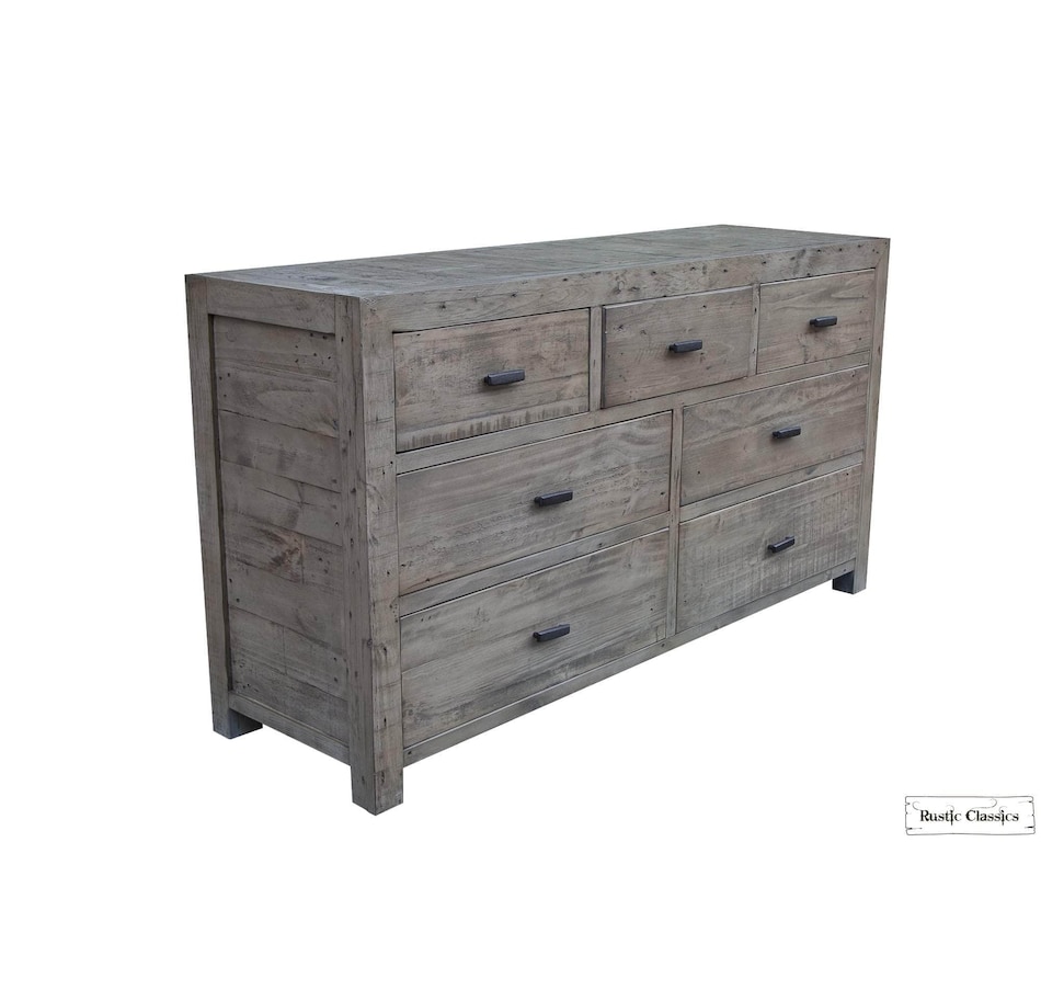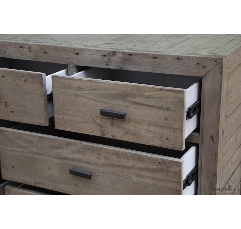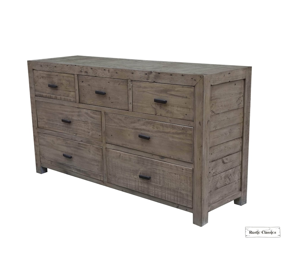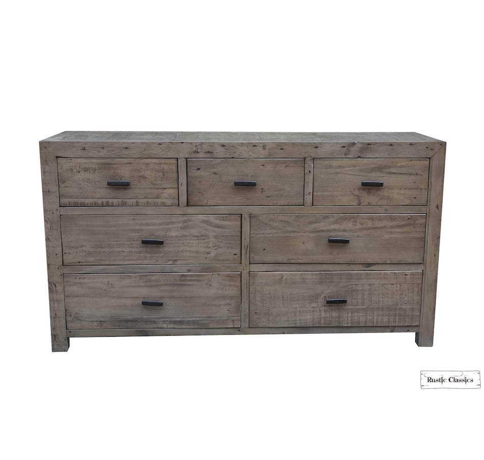 The Whistler dresser will add a rustic look to any bedroom with its grey finish and natural distressing from the reclaimed pine wood. The dresser matches perfectly with wooden or upholstered bed frames. Keep all your clothes and bedding organized in your bedroom with this dresser. The seven drawers are reinforced with butt joints for enhanced durability and feature metal ball bearing glides for smooth opening and closing. The Whistler collection is made from 100% FSC-certified recycled wood, making it one of our most environmentally-friendly products. Transform your bedroom into an eco-friendly sanctuary with the Whistler collection.