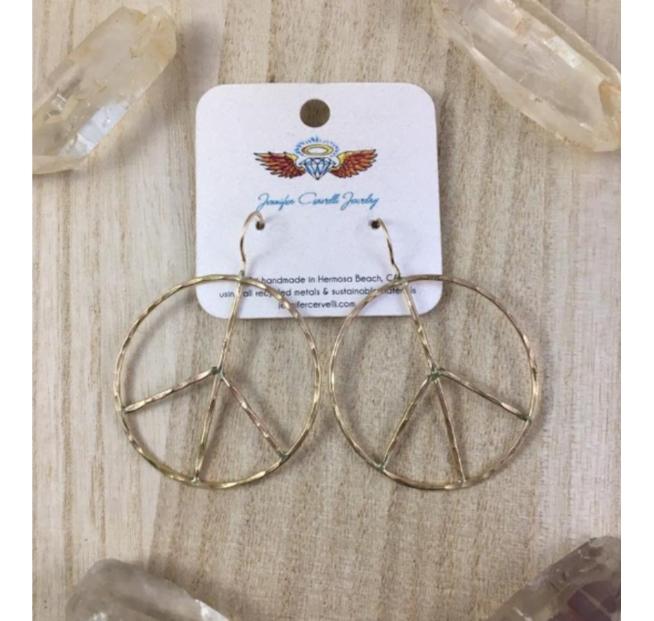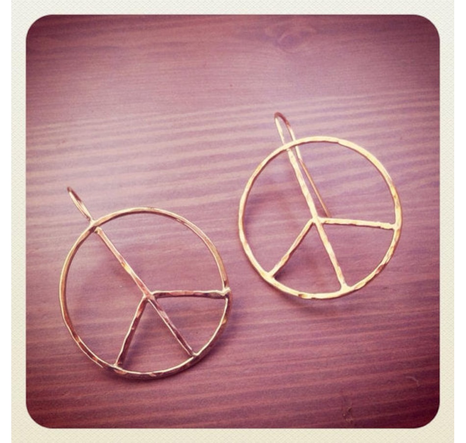 These gorgeous rustic, peace sign earrings are hand fabricated and hand formed, so each pair with vary slightly. They are a part of The Emergi Collection: Emergi - to rise up, emerge, free ones self. Adornment for those extra special moments in life, designed to celebrate life, love, and joy. Made of thick, hammered 16g wire these peace earrings are the perfect accessory for any outfit. Shiny, hammered texture create an organic, rustic feel. These hoops measure 1 inch.100% handmade in Hermosa Beach, California USA using recycled metals and sustainable materials. These are made to order, so please allow up to 1 week production before shipping. Thank you!