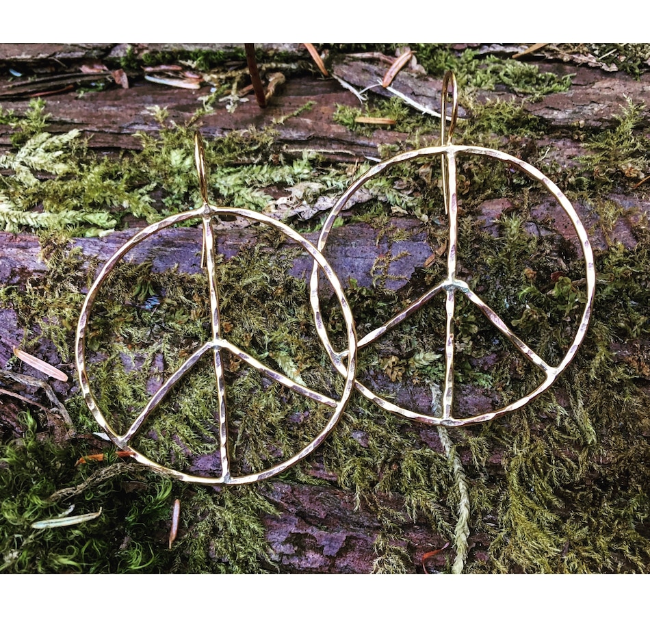 These gorgeous rustic, peace sign earrings are hand fabricated and hand formed, so each pair with vary slightly. They are a part of The Emergi Collection: Emergi - to rise up, emerge, free ones self. Adornment for those extra special moments in life, designed to celebrate life, love, and joy. Made of thick, hammered 16g wire these peace earrings are the perfect accessory for any outfit. Shiny, hammered texture create an organic, rustic feel. These hoops measure 1 inch.100% handmade in Hermosa Beach, California USA using recycled metals and sustainable materials. These are made to order, so please allow up to 1 week production before shipping. Thank you!