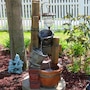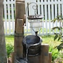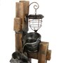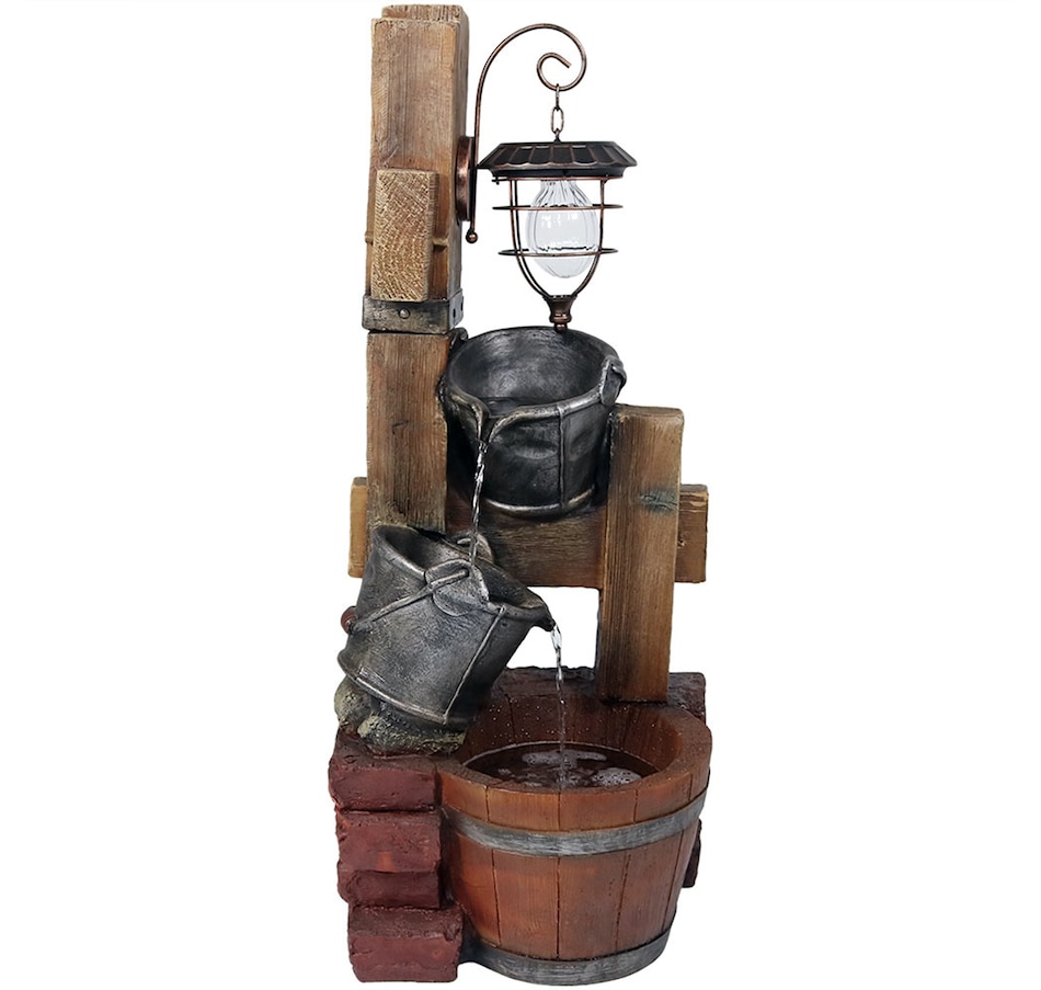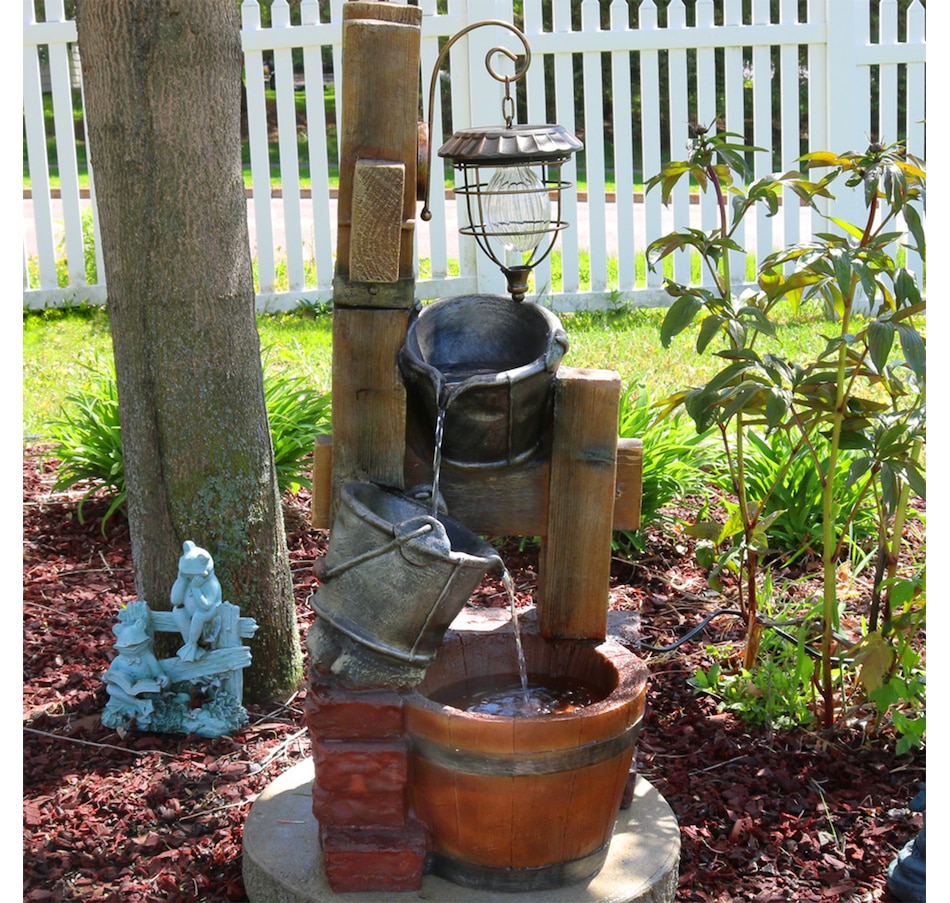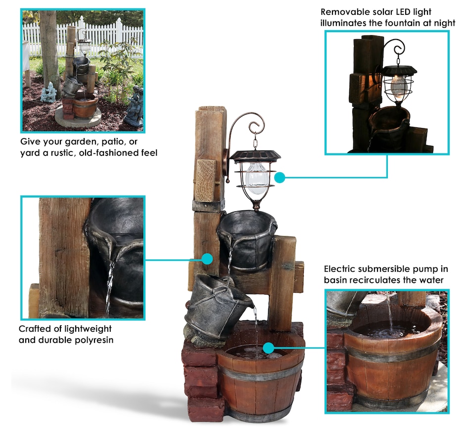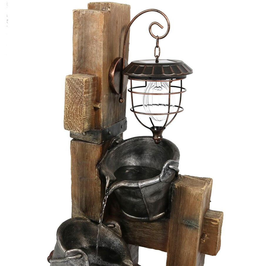 Experience ultimate relaxation with this rustic, pouring buckets design, outdoor water fountain featuring a solar lantern. Listen to the peaceful pour of water cascade from one bucket to the next, collecting at the bottom "wooden" basin where it is then circulated to the top to start again. The continuous flow creates a tranquil atmosphere for any outdoor space and makes a wonderful centerpiece in the garden. The swirled metal hook holding the solar lantern easily lifts and detaches from the side of the "wooden" post. The solar light is energy efficient and simply requires the power of the sun to illuminate the fountain well into the dark hours of the night. A solar panel is located at the top of the lantern. With its electric submersible pump, this fountain is easy to maintain and use. Simply set this fountain wherever desired, fill the bottom basin with water, plug in to the nearest electrical outlet, and transform any outdoor area with soothing sounds.