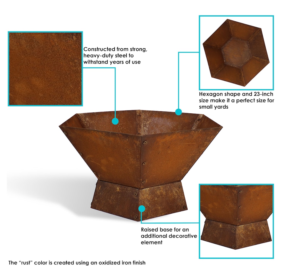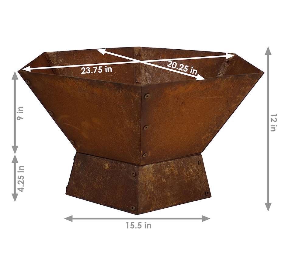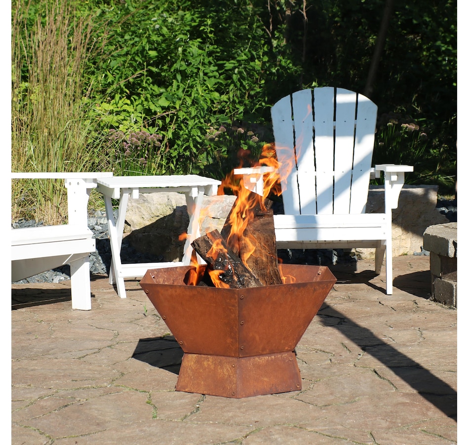 Bring balance, harmony, and warmth to the backyard, cabin, or campground with this rustic wood-burning firepit for outside. The small outdoor fireplace features a rustic oxidized finish to give it an aged, classic look that is sure to complement any modern or farmhouse-style home. The smaller 23.75" size is great for smaller yards or intimate outdoor gatherings like camping and snuggling by the fire with a loved one. This fire pit is constructed from strong, heavy-duty steel to naturally resist the elements outdoors and become a long-lasting feature for years to come. The unique coloration and design make this fire pit a modern, fun focal point to any space. And, with the open fire design, easily tend to the fire with a poker or a log clamp (not included) to keep the embers from flying away and the fire burning all night long.