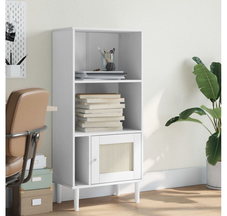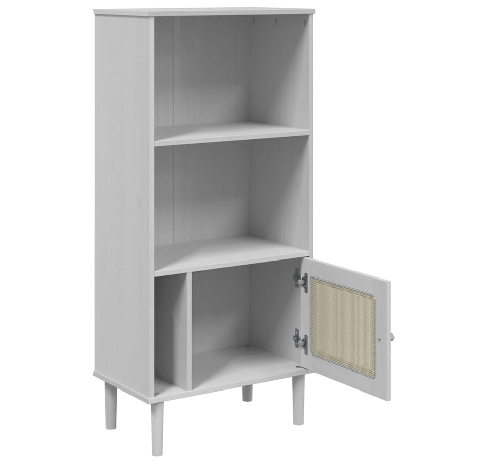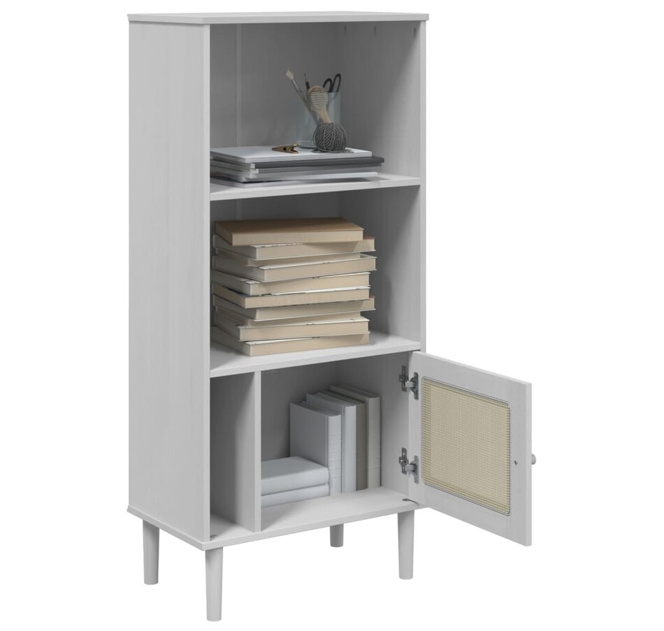 This wooden bookcase offers an ideal solution for organizing your books and will be a decorative yet practical addition to your interior decor. Solid Pine Wood: Solid pine wood is a beautiful natural material. Pine wood has a straight grain and the knots give the material its characteristic, rustic look. UV varnish: UV varnish is a special type of varnish that is finished using an ultraviolet dryer. It creates a more vibrant, luxurious and tactile finish compared to non-UV varnishes. Plenty of Storage Space: The bookcase with door provides ample storage space to keep your magazines, books, decorative items and other essentials in the kitchen. daily life well organized and within reach.Rattan Look Surface: The surface of the book shelf door is handcrafted from resin wicker, a two-tone blend of mid-century modern and bohemian that adds a touch to both cozy and elegant in your space. Caution: To prevent it from being knocked over, this product must be used with the wall mounting device provided.