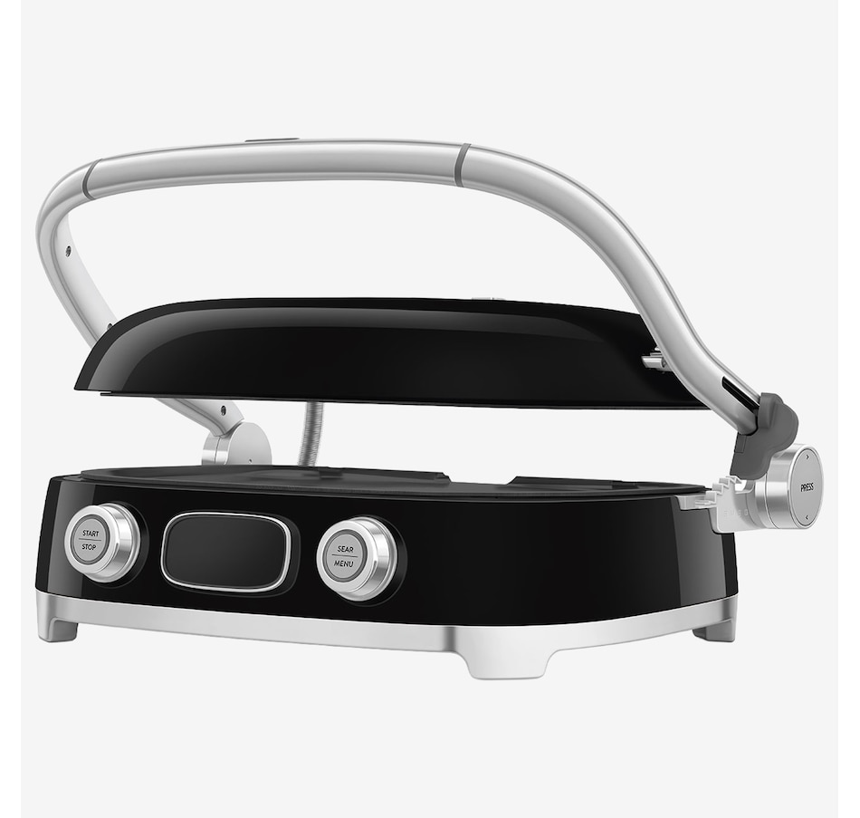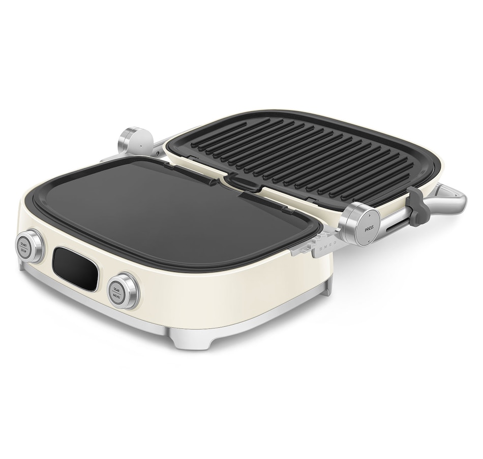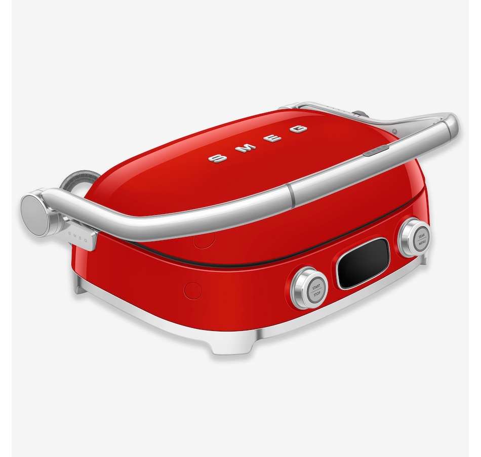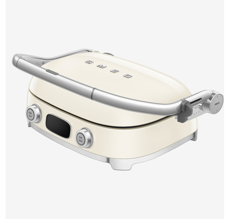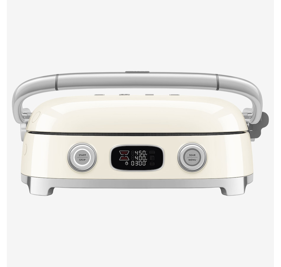 This grill from SMEG offers 2,000 watts of power along with three presets (panini, waffle, burger) and three plate positions (contact, oven, grill) to cover multiple cooking needs and recipes. It also features independent temperature controls for the plates and a sear function, a non-stick ceramic coating and dishwasher-safe plates.