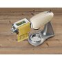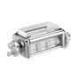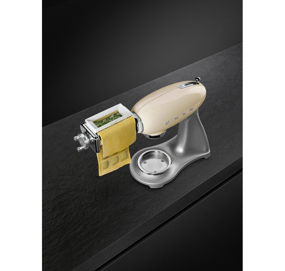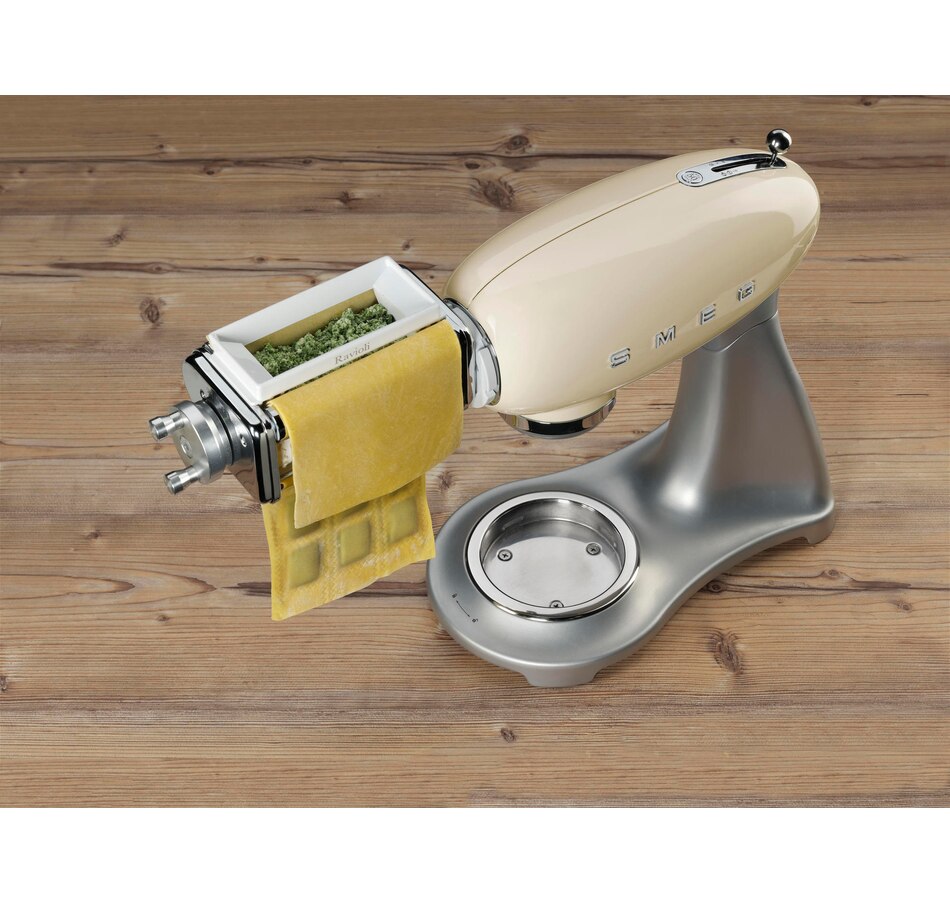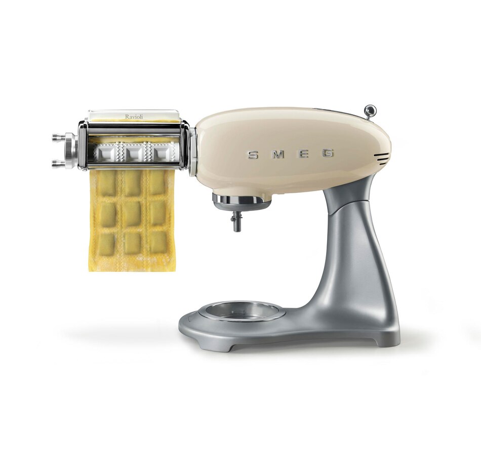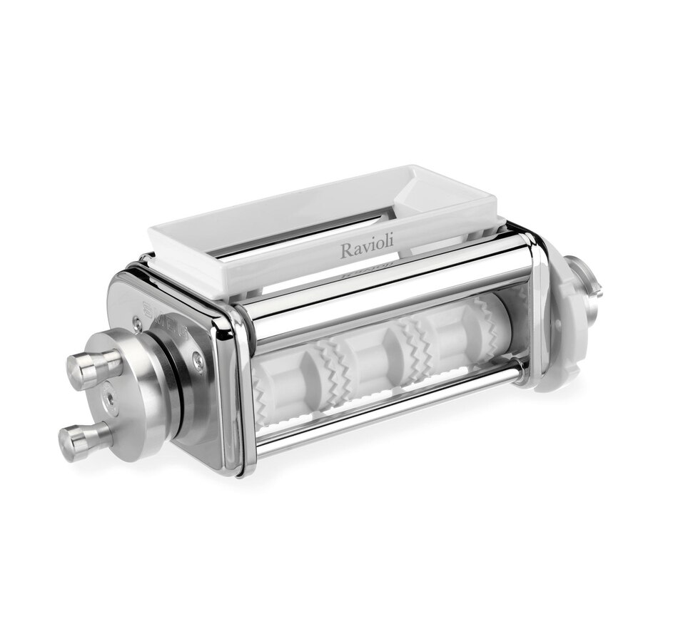 This fettucine cutter accessory from SMEG features a chrome steel body, an adonized aluminum two-knob handle, and plastic rollers to shape three wide stripes of ravioli.