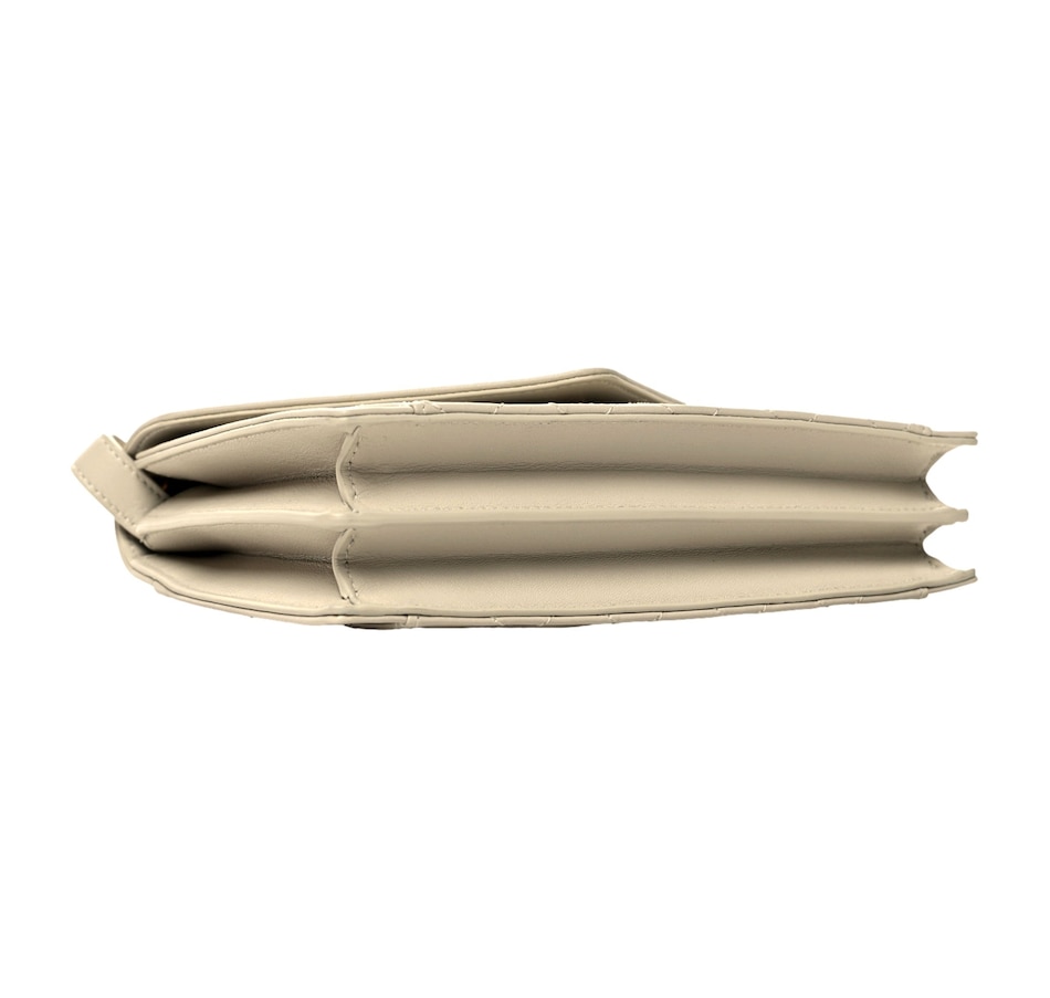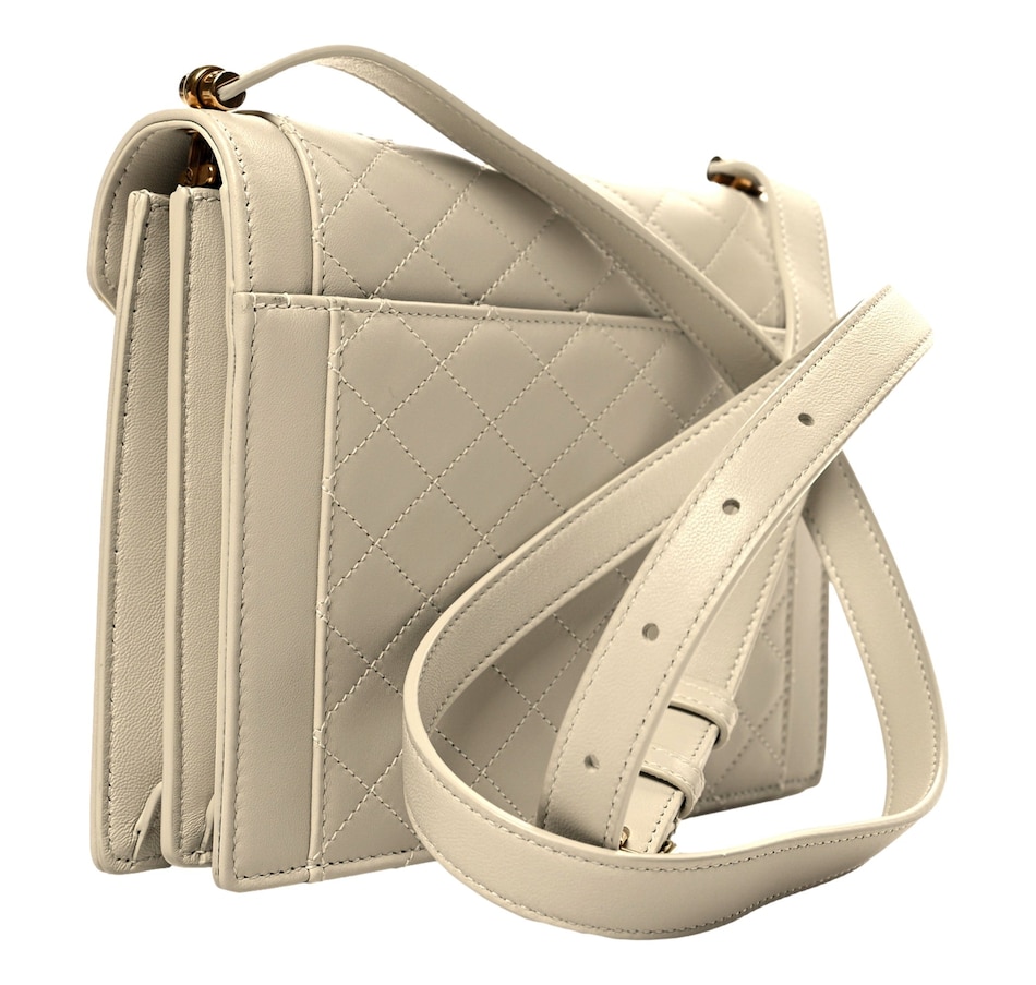 This Saint Laurent Gabby Medium Crema Shoulder Bag exudes elegance with its chic quilted lambskin leather in white. The aged gold tone YSL monogram adds a touch of sophistication, while the two compartments and zipper pocket provide practicality. Indulge in luxury with this authentic piece.