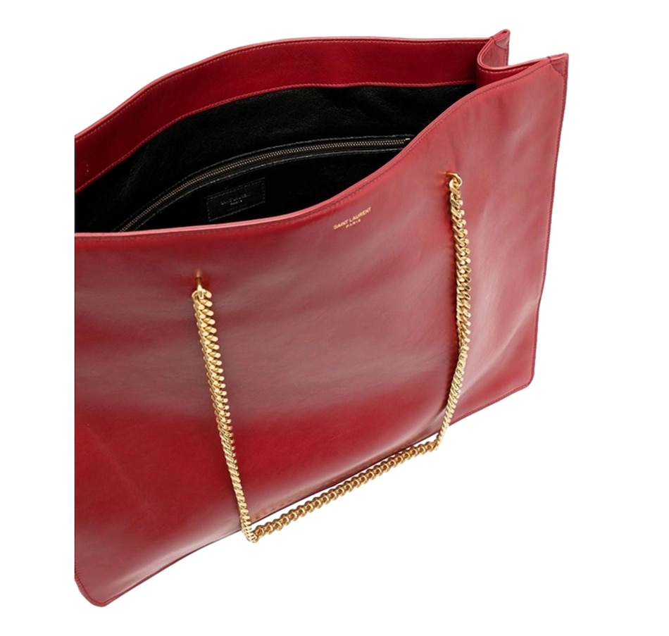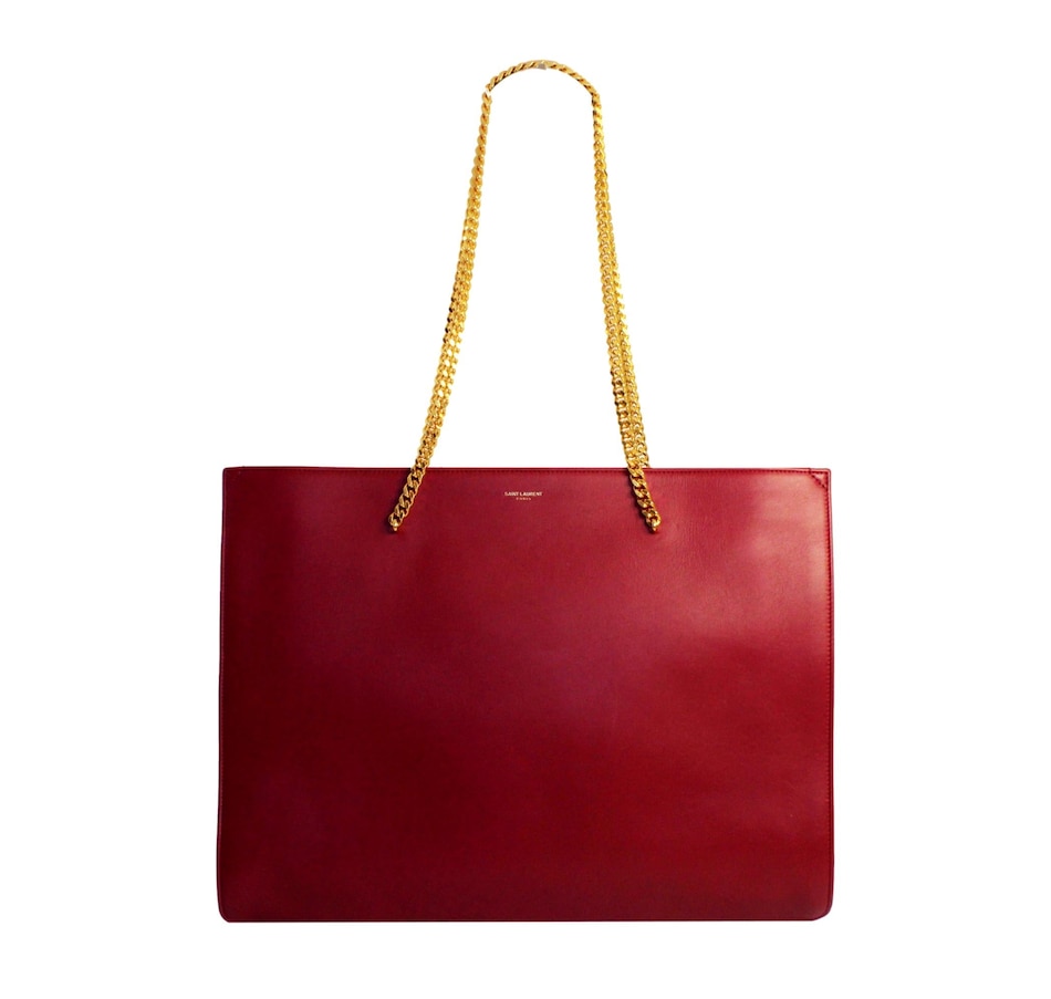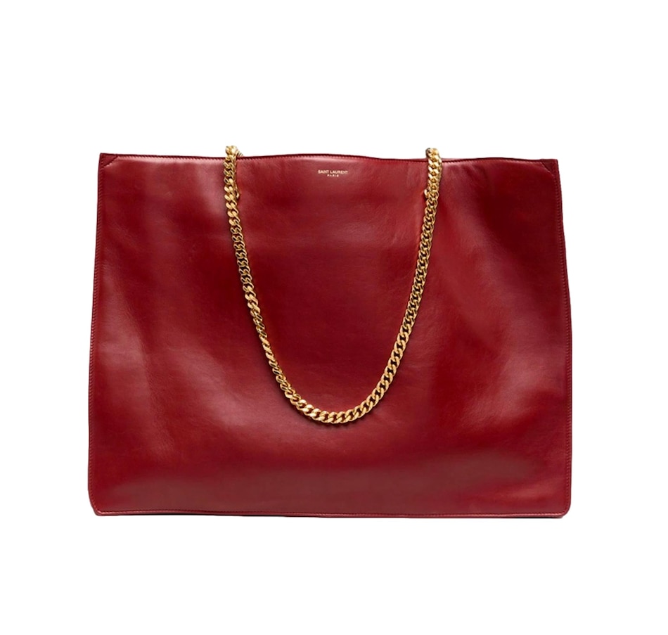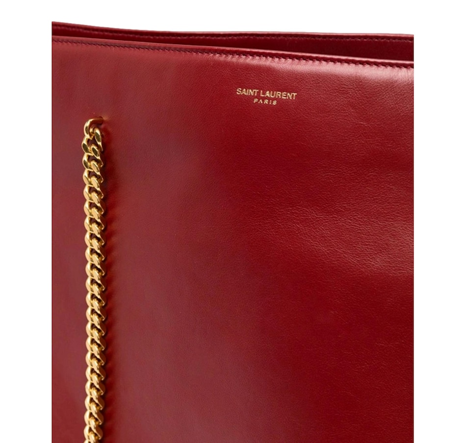 This chic shoulder bag from Saint Laurent is constructed from red calf leather and features gold-tone hardware and a double chain shoulder straps. The interior of this spacious handbag is lined with black leather and includes one interior zipper pocket. Add this iconic piece from Saint Laurent to your collection for a minimal and sophisticated look. Model: 634799 Red calf leather Printed Saint Laurent logo Gold-tone hardware Black leather lining One interior zip pocket Gold chain straps, Drop: 11.5" Measurements: 16.3 x 4.25 x 12 (LWH) Includes authenticity cards and Saint Laurent dust bag Made in Italy