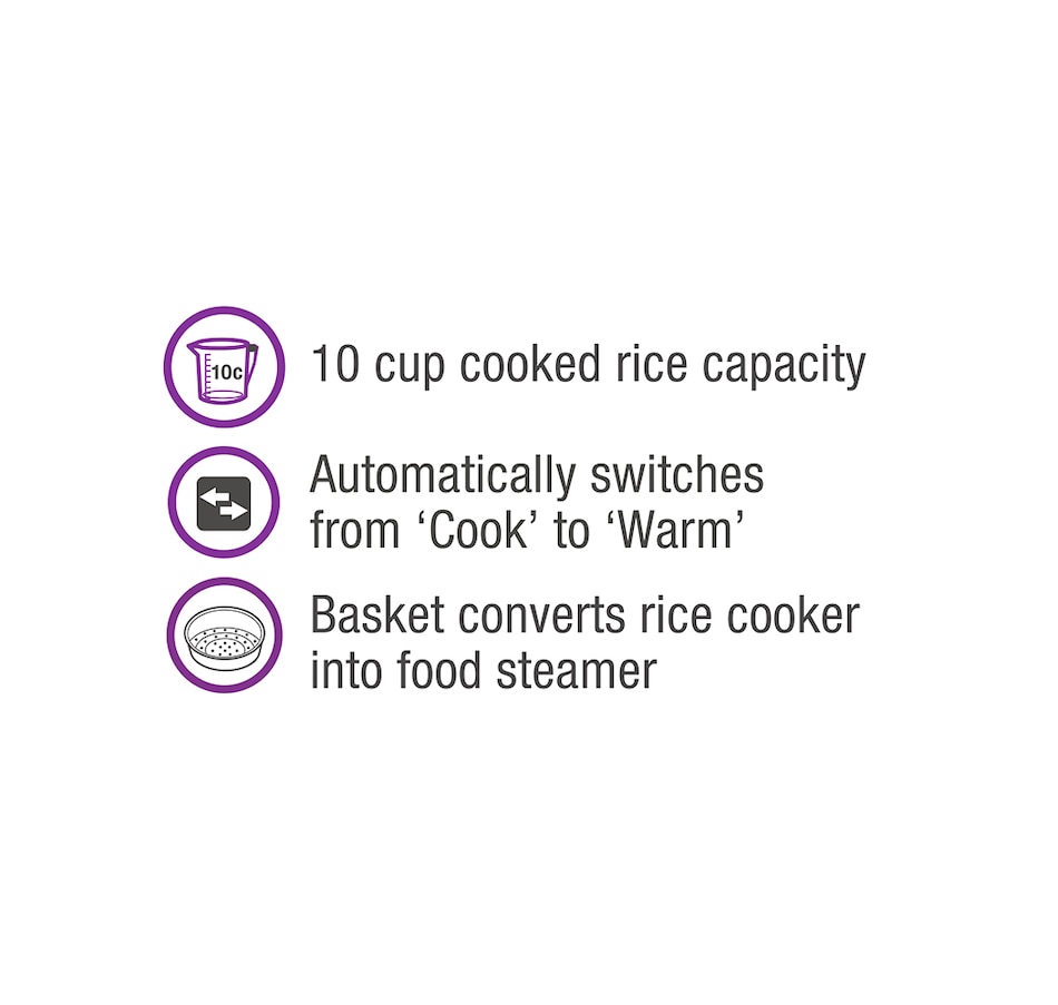 • Rice cooker automatically switches from ‘Cook’ to ‘Warm’ for perfect rice every time
