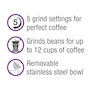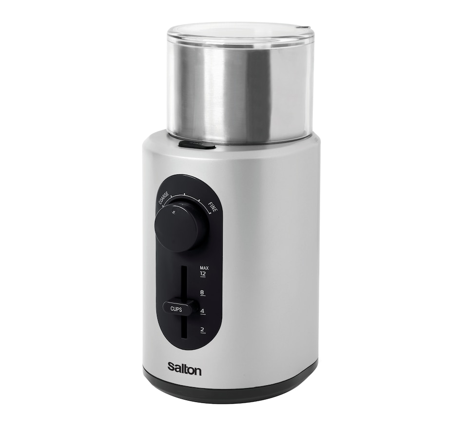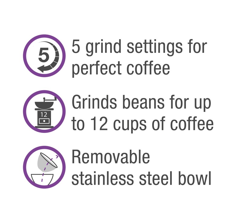 This Salton grinder has five precision grind settings: Drip, Espresso, French press, Percolator & Turkish Coffee so you can enjoy some of your coffee shop favourites at home.