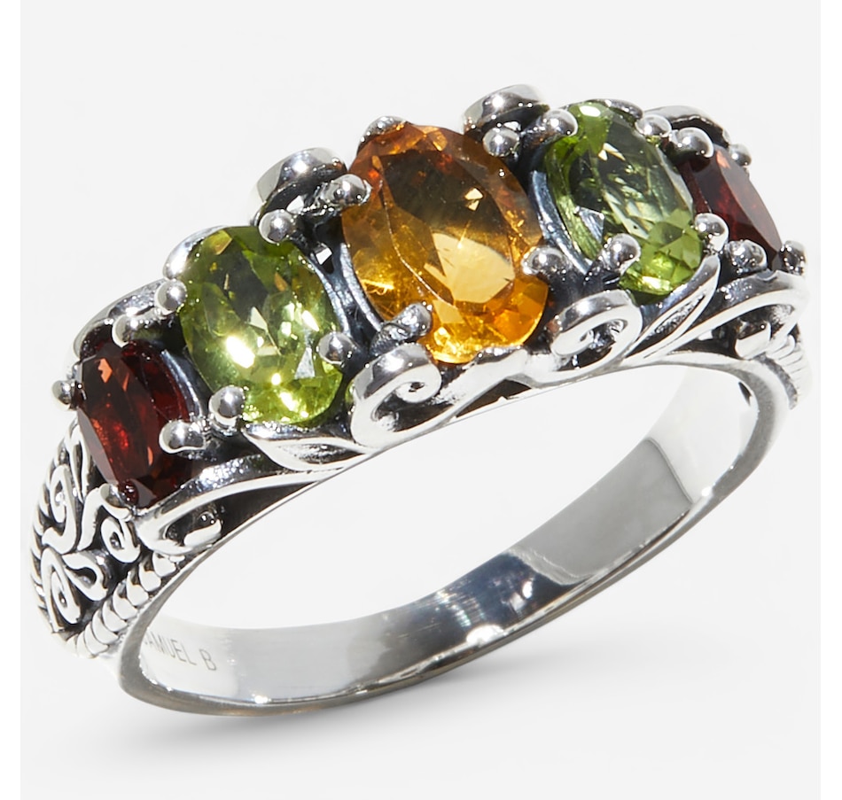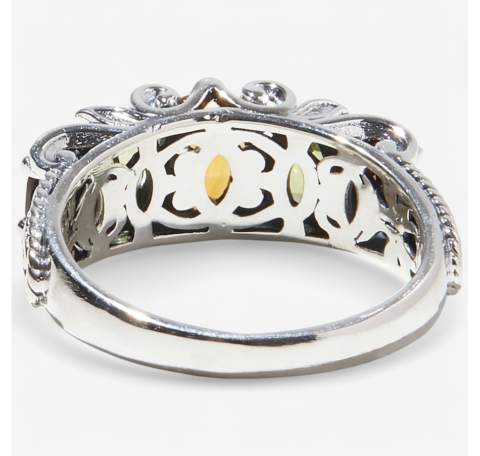 • (2) 3mm x 5mm citrine (0.50 ctw), 4mm x 6mm peridot (1.00 ctw) and (1) 5mm x 7mm garnet (0.90 ctw) prong set and faceted