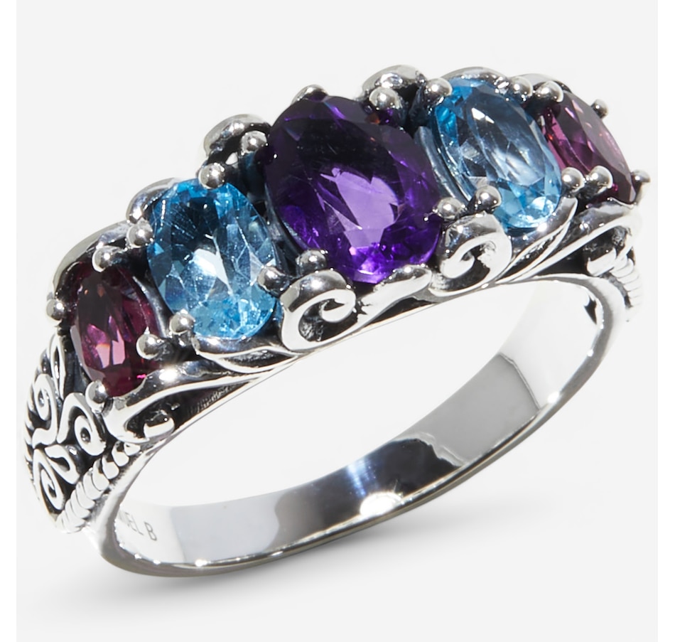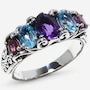 • (2) 3mm x 5mm rhodolite (0.30 ctw), 4mm x 6mm blue topaz (1.00 ctw), (1) 5mm x 7mm amethyst (0.70 ctw) prong set and faceted