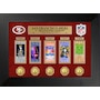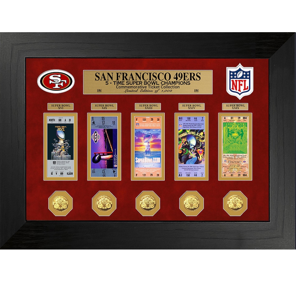 Limited Edition of only 1000, five tickets and five coins in an exquisite frame. The History of the San Francisco 49ers Super Bowl tickets and game coins from each of their world titles are featured in this beautiful wood frame with 2.5" wide molding and protected under a plexi glass front panel. Laser cut red suede matting with a gold mat prominently displays the five replica Super Bowl tickets and five 39mm gold plated “game or “Flip” coins as well as the engraved nameplates and die cut team logos. This is a true collectible considering the history of the Super bowl, the evolution of the tickets and the gold Super Bowl game coins. Each frame is accompanied by an individually numbered certificate of authenticity. Officially licensed by the NFL. Proudly made in the USA by The Highland Mint!