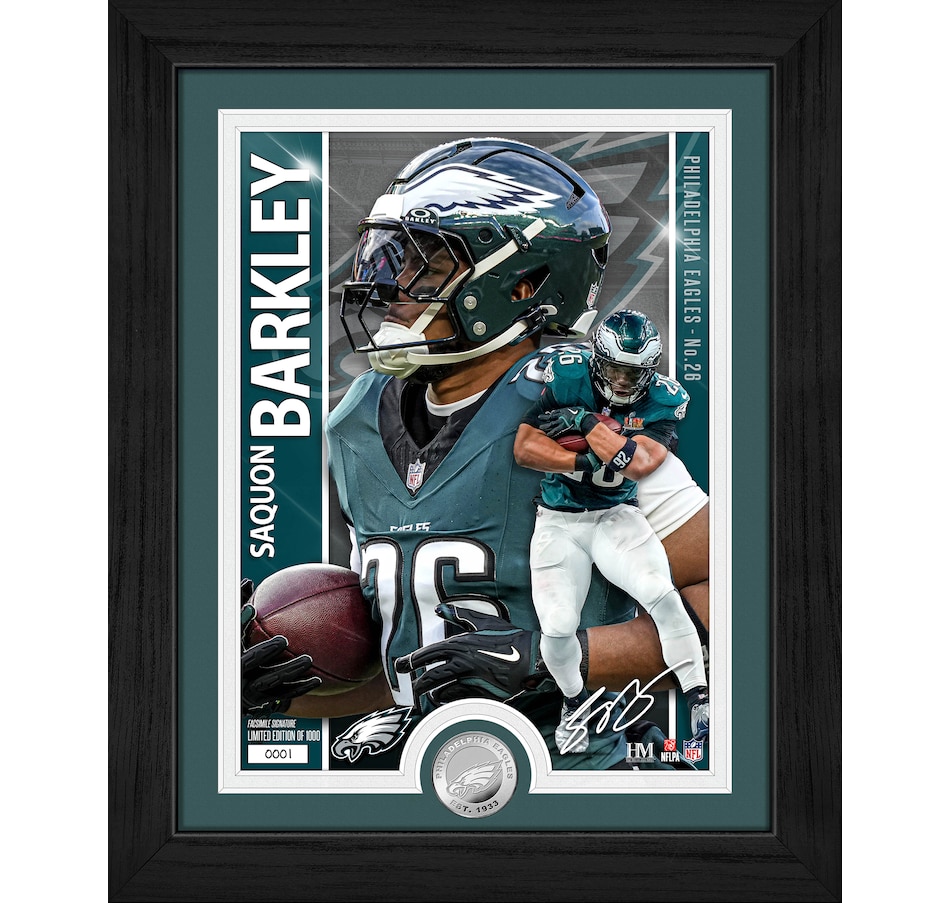 The Philadelphia Eagles' Saquon Barkley is featured in this limited edition 13" x 16" framed collectible that includes a stunning 8" x 11" custom-designed artist print and a minted 39mm Philadelphia Eagles silver-plated coin. Elegantly double-matted and protected under acrylic glass, this premium display piece is a must-have for NFL fans and collectors. Only 1,000 individually numbered pieces exist, and each officially licensed by the NFL and NFLPA. Each frame includes a certificate of authenticity. Proudly made in the U.S.A. by The Highland Mint, this collectible arrives ready to hang and ready to impress.