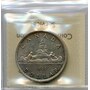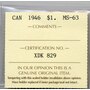 This scarce-date low-mintage 1946 Canadian silver dollar is a rare coin that has survived in very choice uncirculated condition. It has been authenticated and graded as MS-63 by International Coin Certification Service (ICCS) and comes protected in a tamper-proof holder. The coin is primarily brilliant and lustrous.