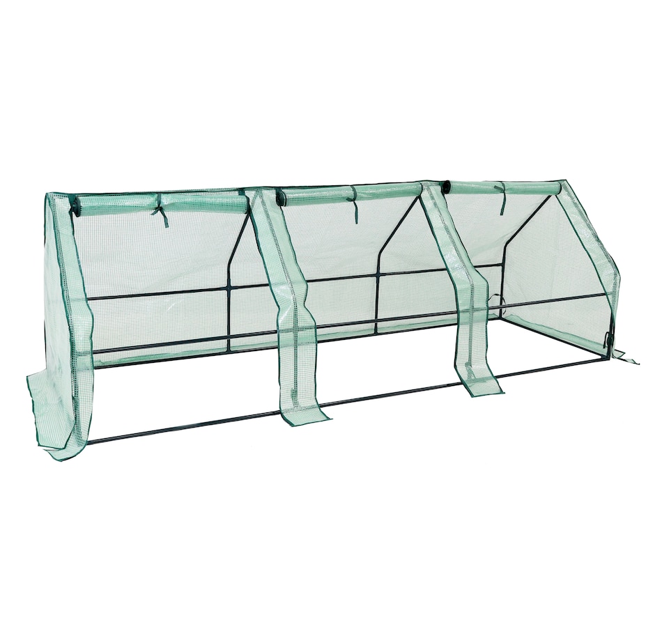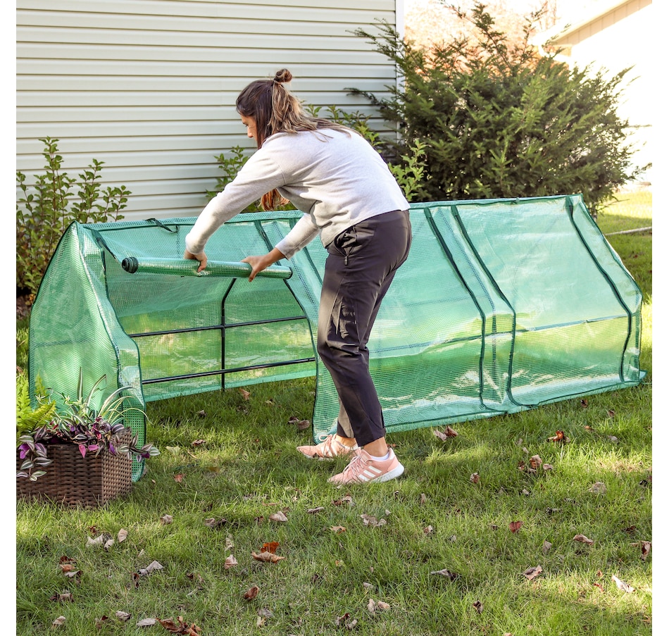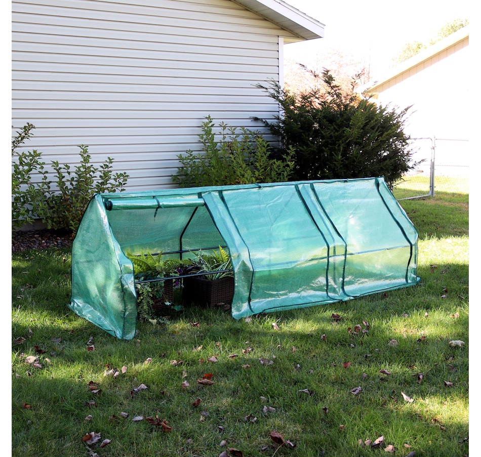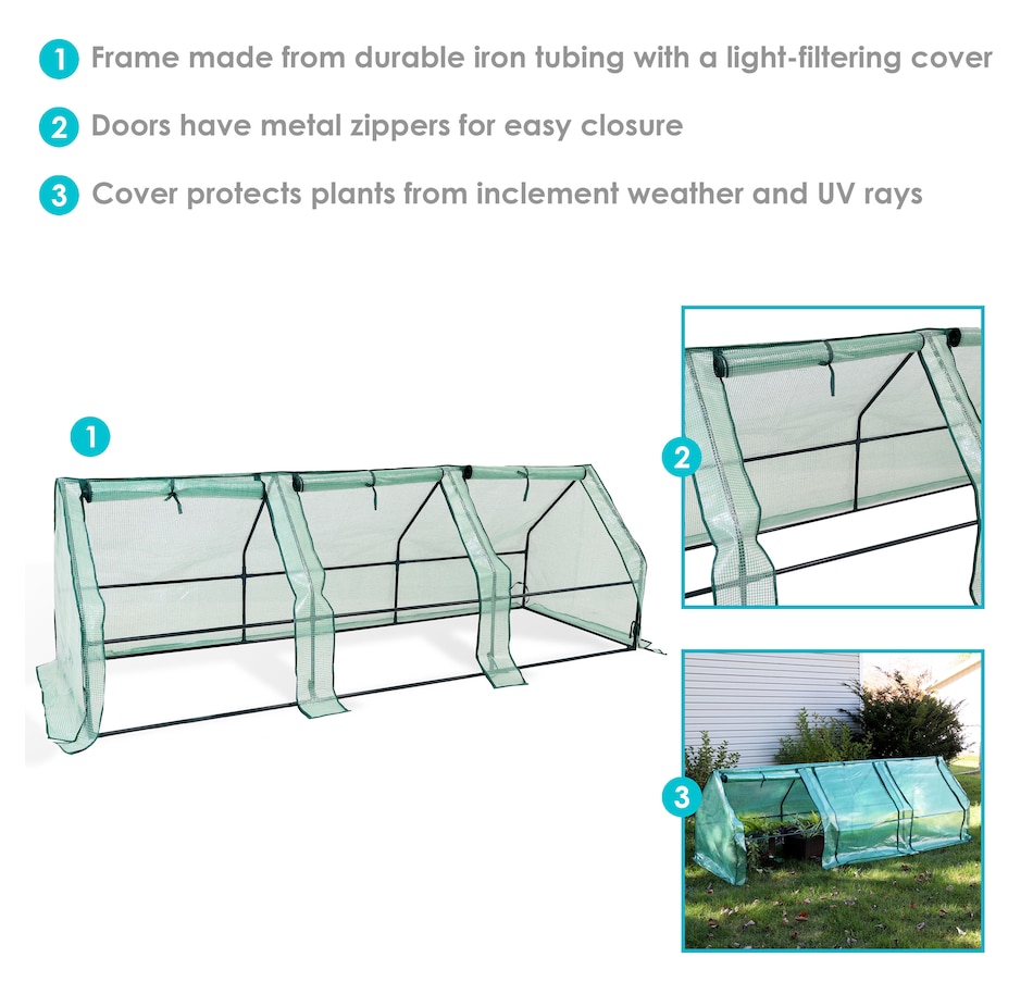 Protect plants from harsh weather and create the right conditions for their growth at home in the garden, patio, deck, yard, or other landscaping area with this easy-to-use mini greenhouse. With a frame made from strong iron tubing and a durable polyethylene covering coated with a UV ray protective finish, this portable seedling cloche greenhouse is great for growing vegetables, fruits, plants, and flowers. The cover protects plants from UV rays and inclement weather like frost, excessive heat, and moisture. In addition, this mini greenhouse is transparent to ensure plants receive the right amount of sunlight. Zippered doors allow for airflow control in and out of the greenhouse and allows easy access to plants. This mini greenhouse can be used in a variety of places outdoors to create and nurture any dream garden anywhere desired. Use this greenhouse over garden beds and have a successful growing season year-round!