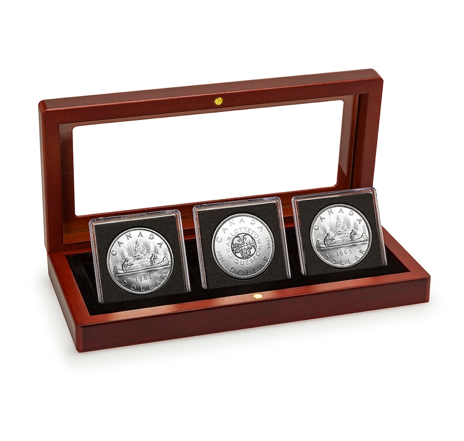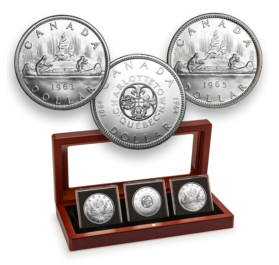 • 1963 and 1965: The main design on these dollar coins is the same that was on Canada's first dollar coin, issued in 1935. It features a Native Canadian and a Voyageur (a travelling agent for a fur company) paddling a canoe past a small island with two wind swept trees. The vertical lines in the background represent the northern lights.