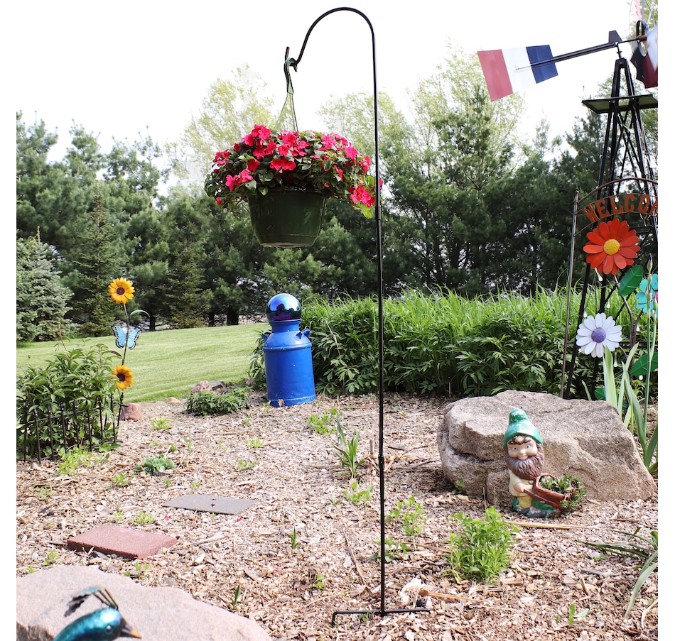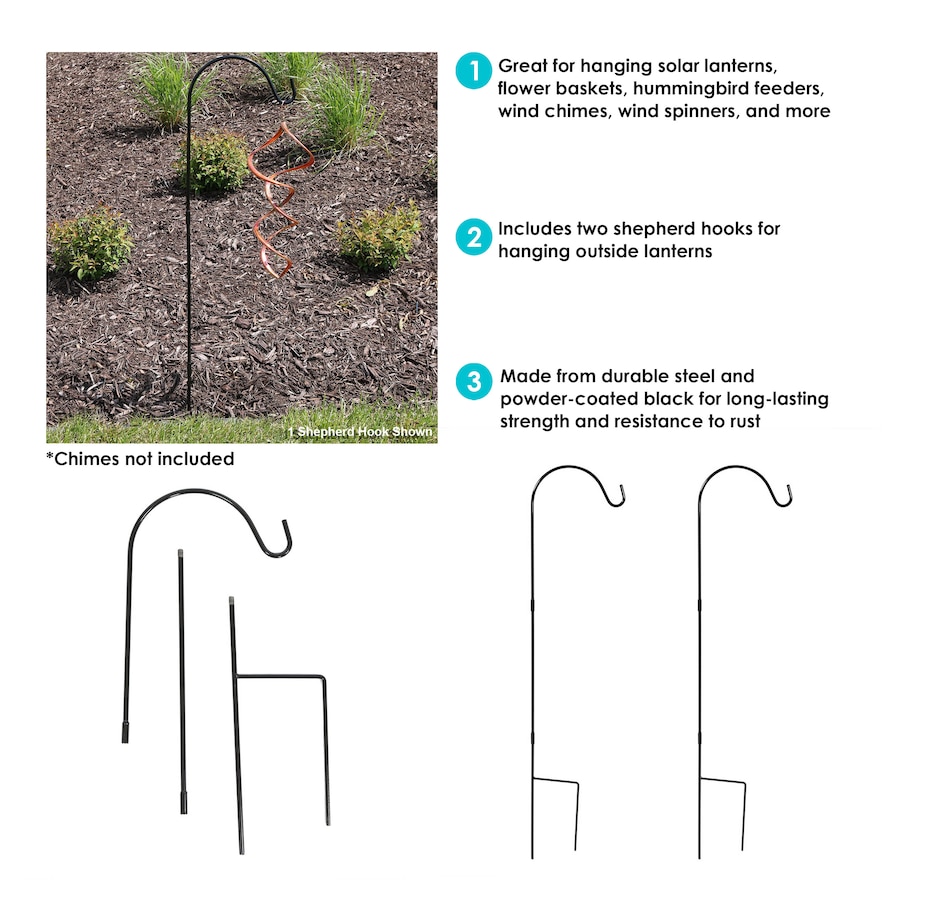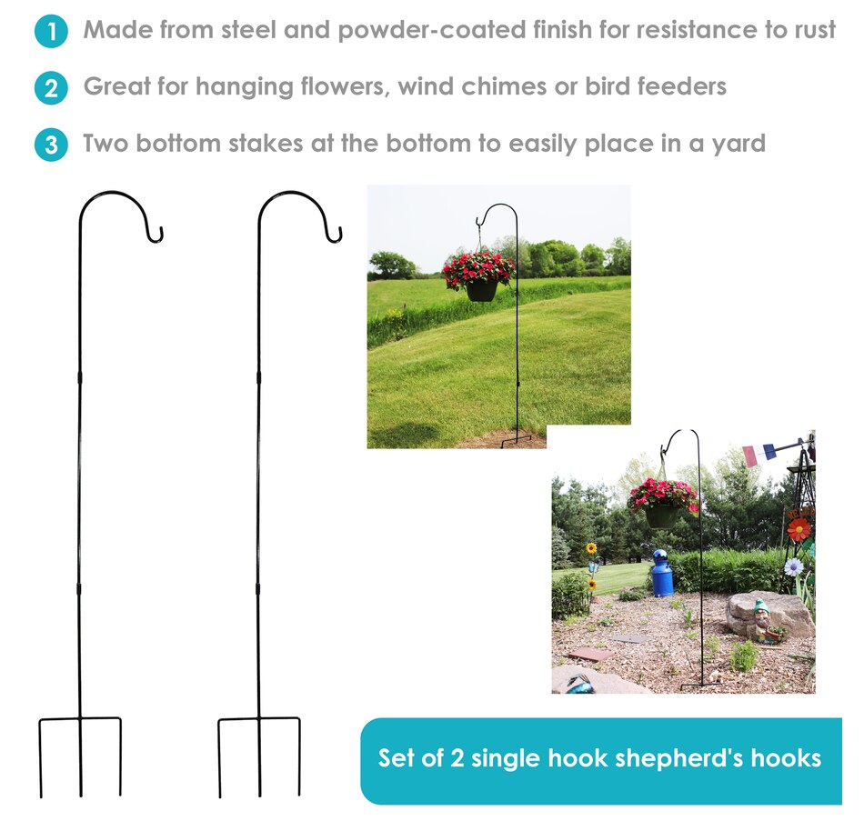 - Set includes two tall shepherds hooks for outdoor use