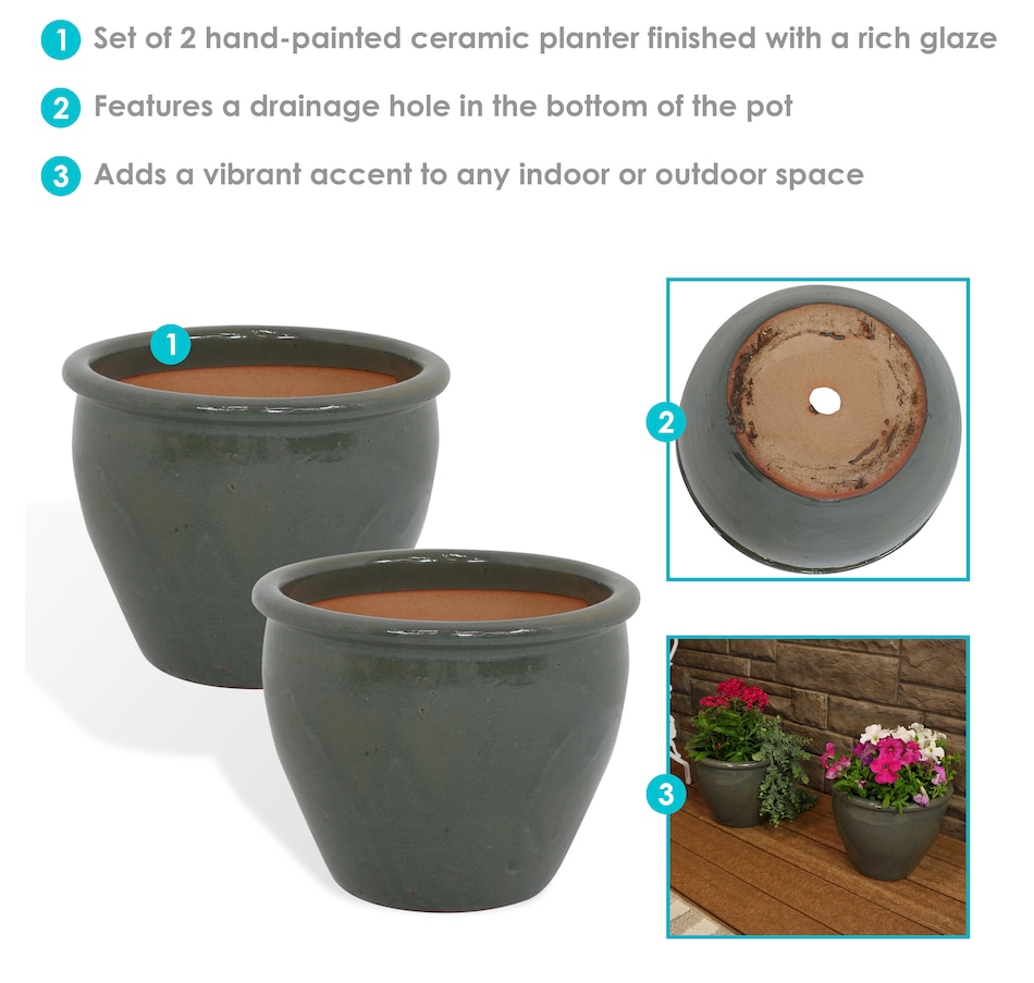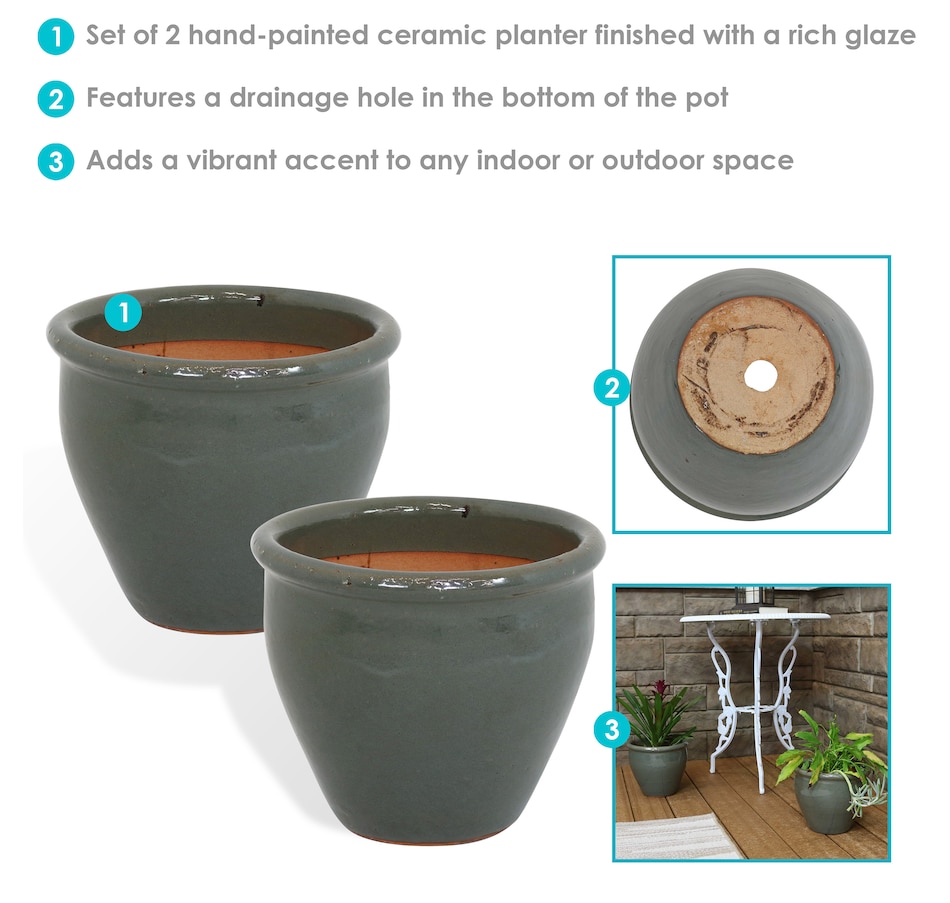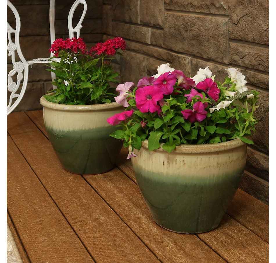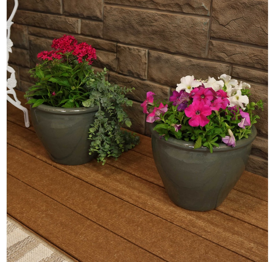 • Set includes two matching round ceramic planters