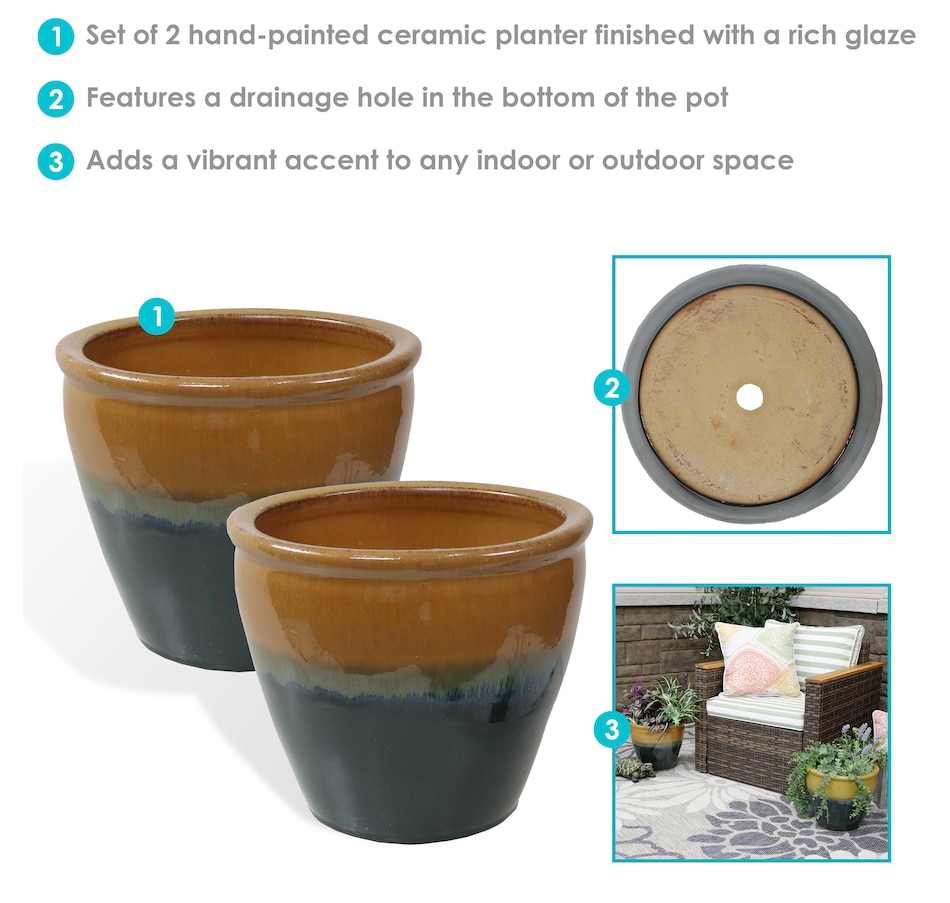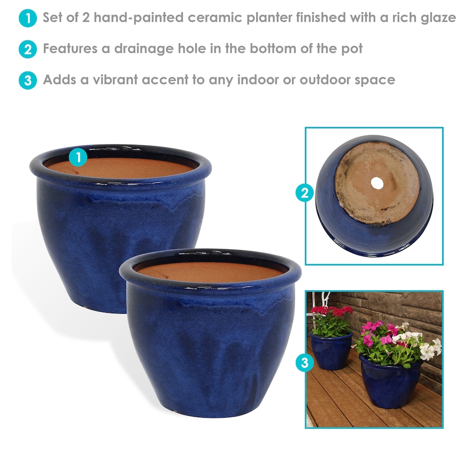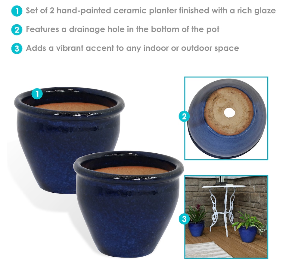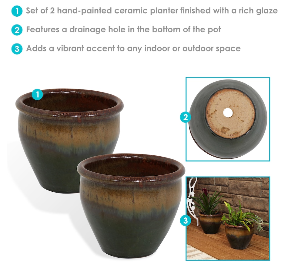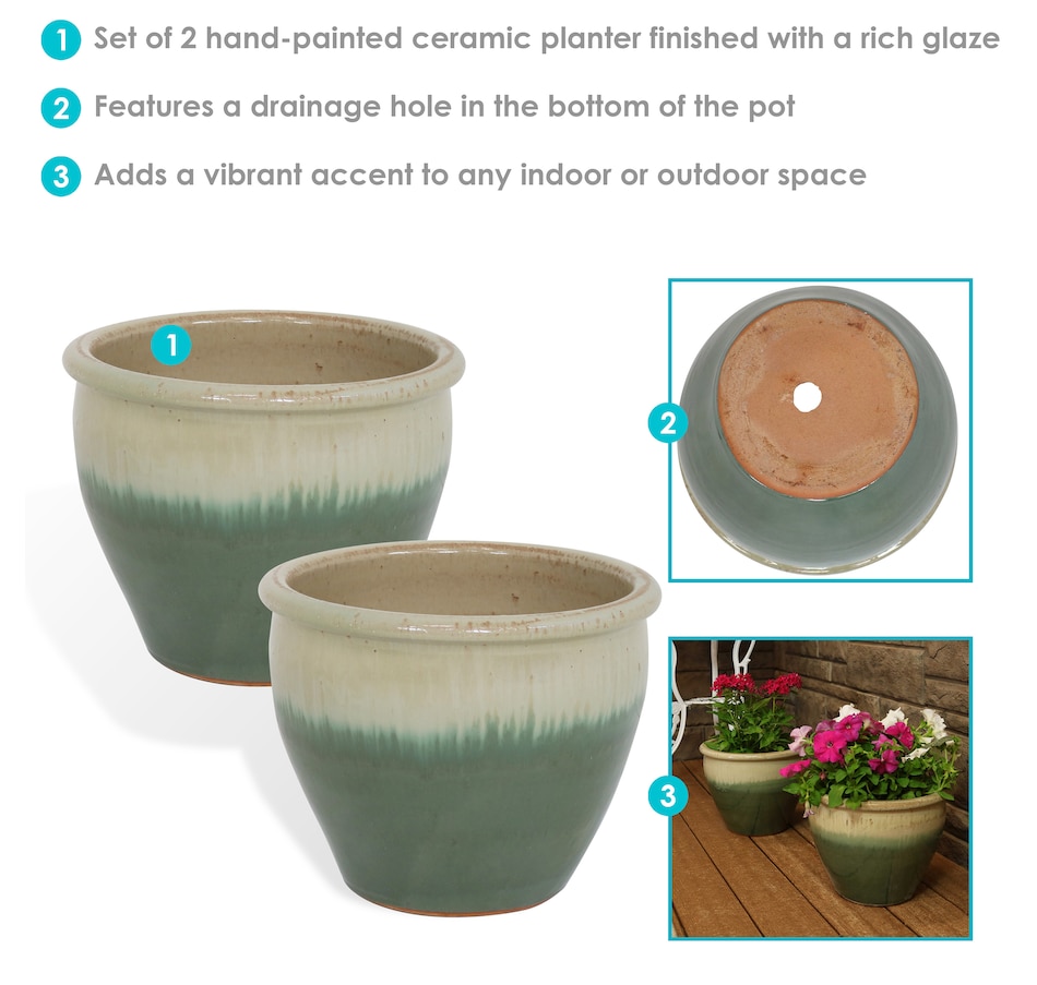 • Set includes two matching round ceramic planters