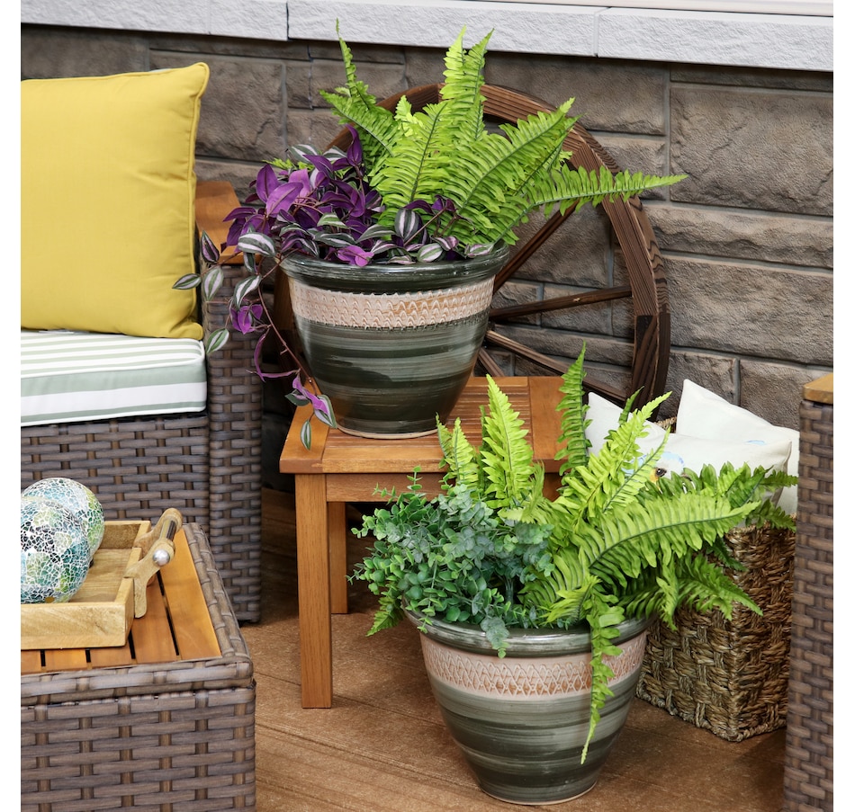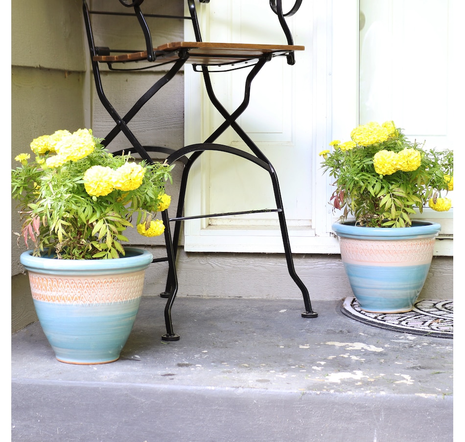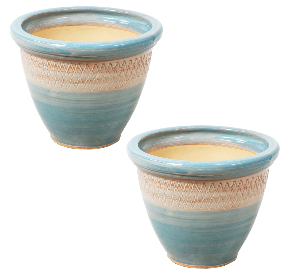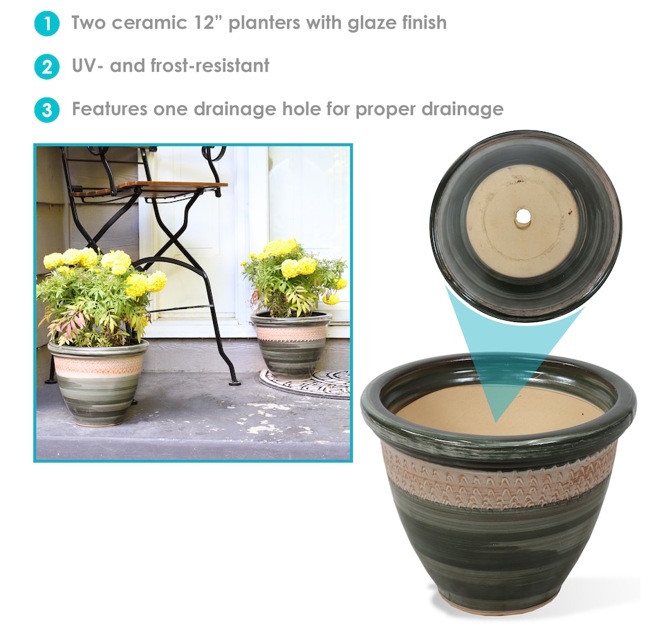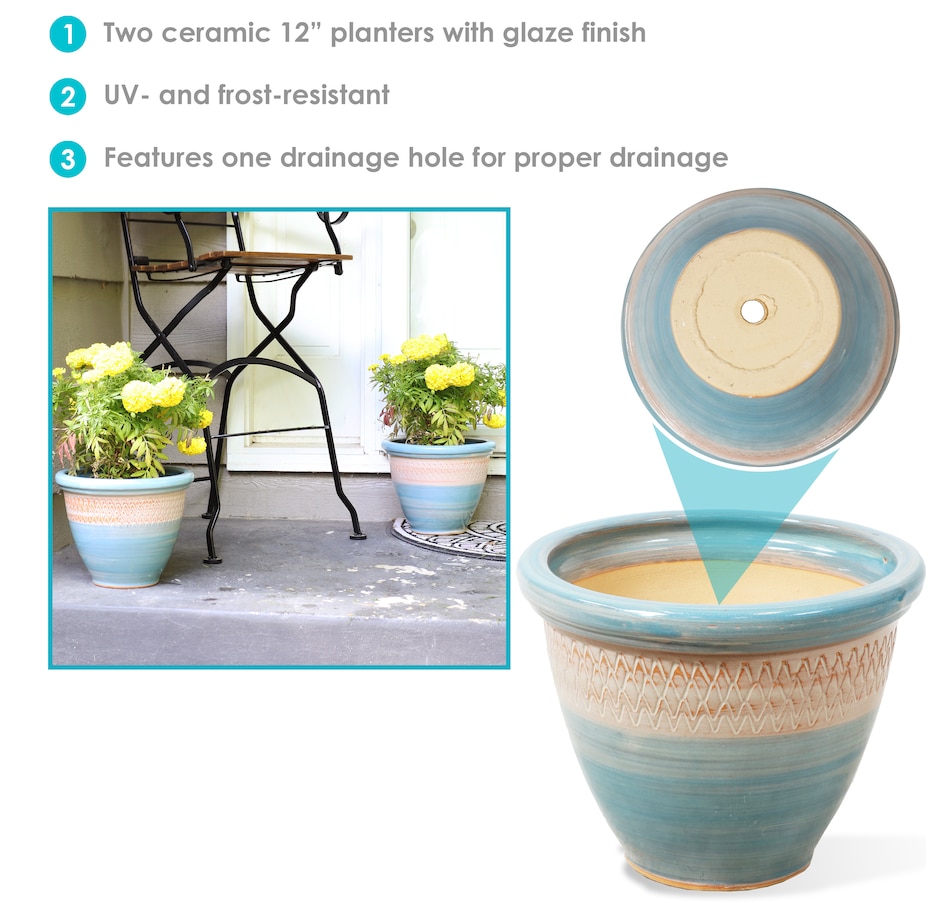 Display vibrant flowers, luscious greenery, or any kind of plant, and add a vibrant, decorative touch to the porch, patio, yard, or living room with this set of two beautiful ceramic planters. With two identical pots, it's easy to create a cohesive look anywhere. Set the planters on the front step or porch for some symmetry, or place them at different heights on a plant stand (stand not included) in the living room. Designed for indoor and outdoor use, these planters are great for growing flowers, greenery, or herbs anywhere. This planter pot set is made from durable ceramic clay with a mineral glaze finish for added resistance to the elements and long-lasting beauty. These ceramic planters have 1 drainage hole in the bottom to allow excess water to drain out. Always use a saucer (saucer not included) beneath the planter when placing them indoors to avoid spilling excess water on the floor.