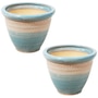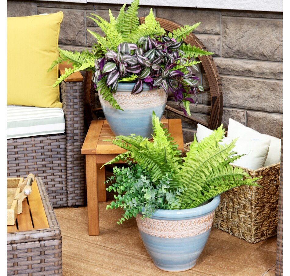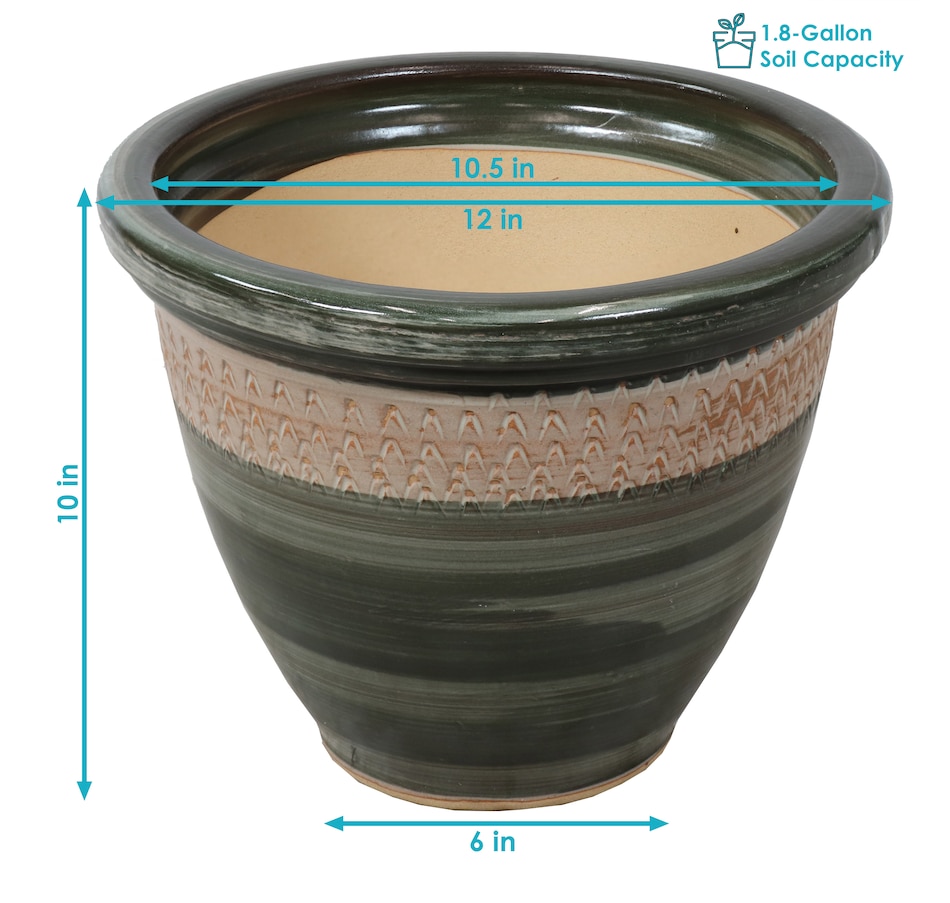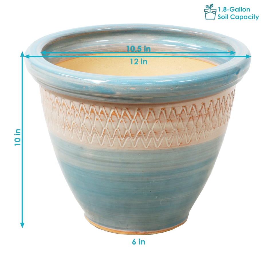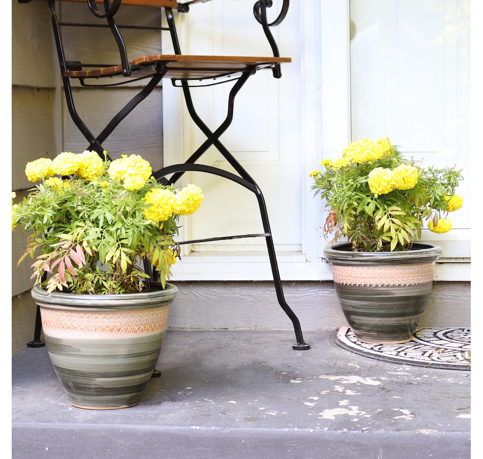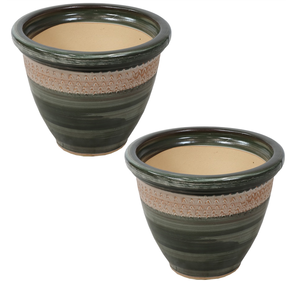 Display vibrant flowers, luscious greenery, or any kind of plant, and add a vibrant, decorative touch to the porch, patio, yard, or living room with this set of two beautiful ceramic planters. With two identical pots, it's easy to create a cohesive look anywhere. Set the planters on the front step or porch for some symmetry, or place them at different heights on a plant stand (stand not included) in the living room. Designed for indoor and outdoor use, these planters are great for growing flowers, greenery, or herbs anywhere. This planter pot set is made from durable ceramic clay with a mineral glaze finish for added resistance to the elements and long-lasting beauty. These ceramic planters have 1 drainage hole in the bottom to allow excess water to drain out. Always use a saucer (saucer not included) beneath the planter when placing them indoors to avoid spilling excess water on the floor.