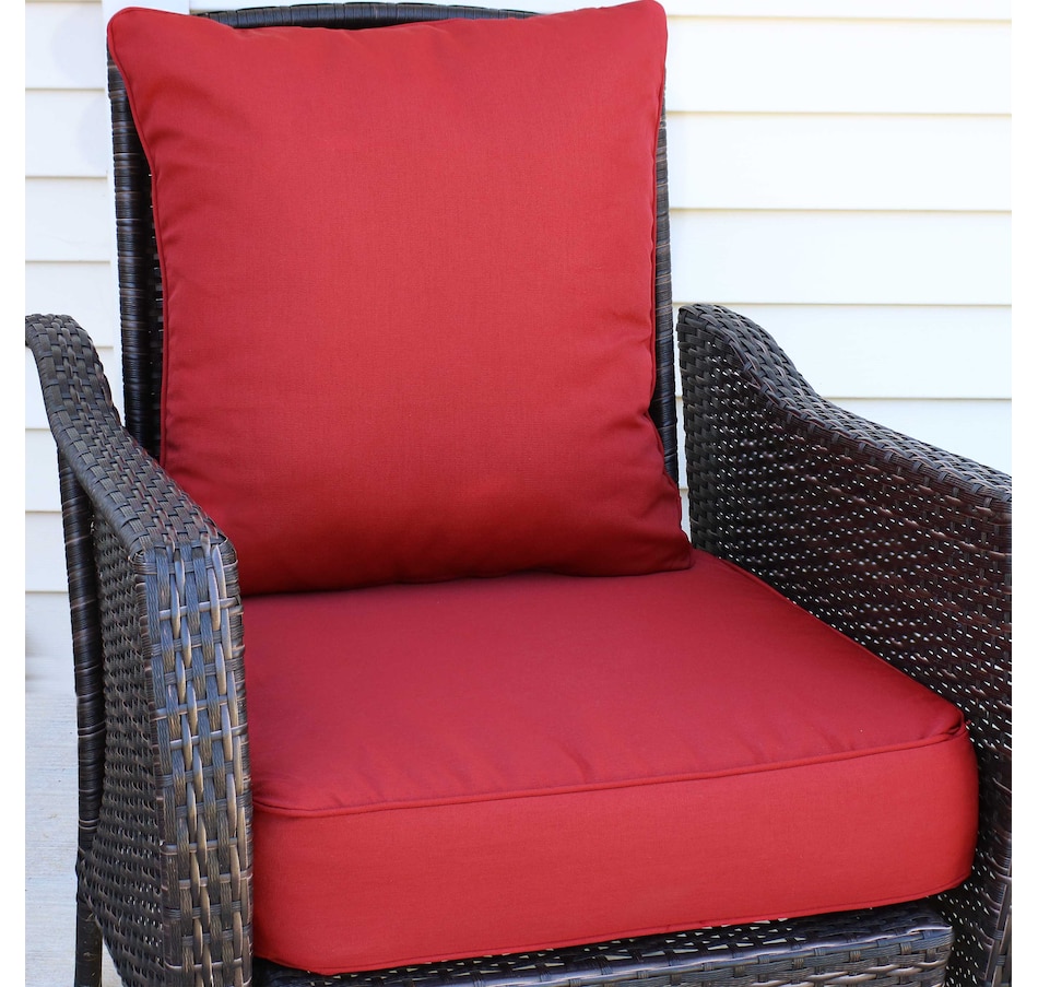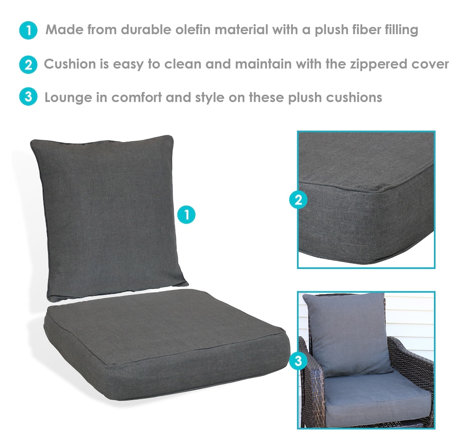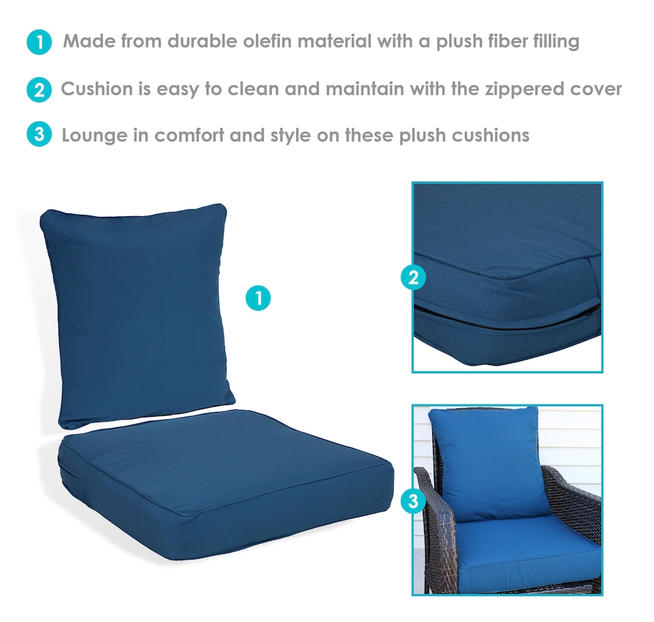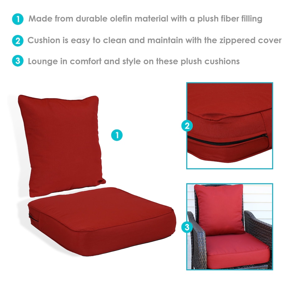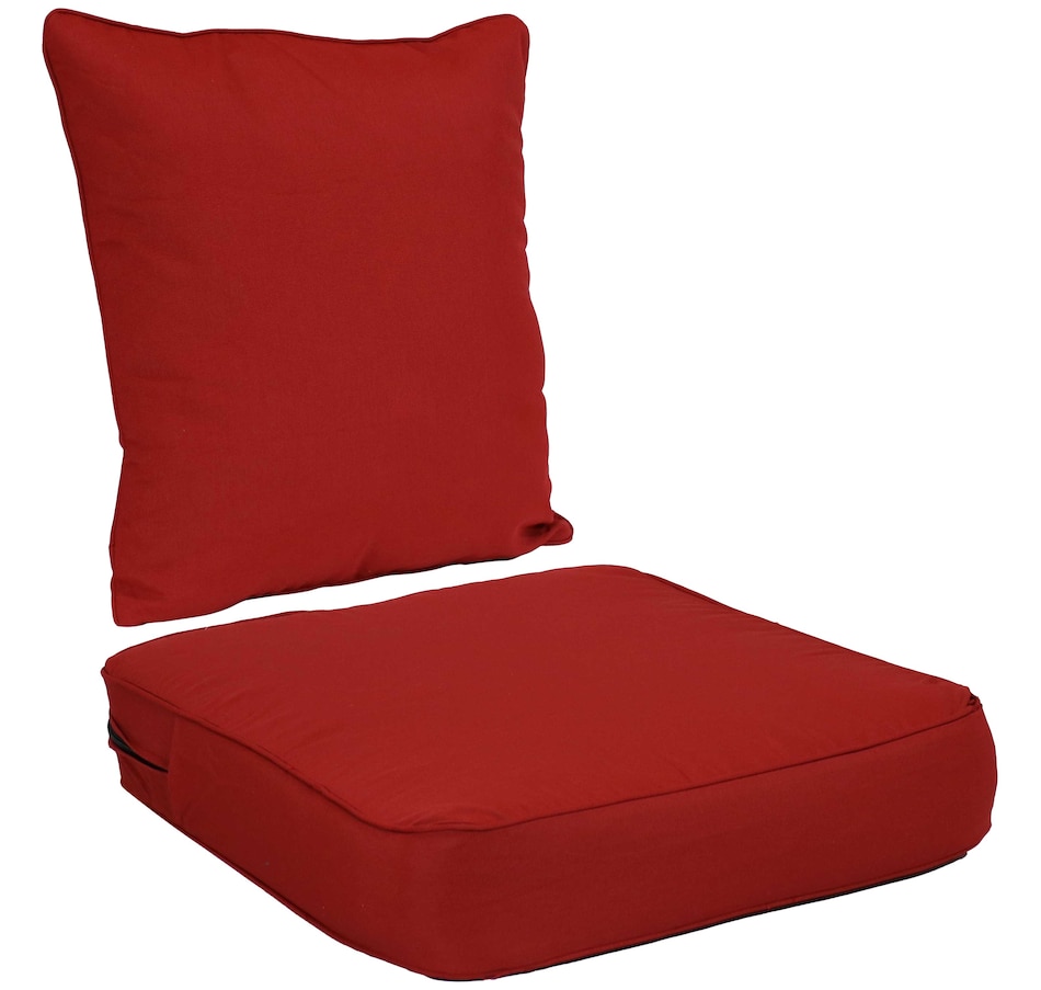Make chairs on the patio, deck, or in the yard even more comfortable with this back and seat cushion set. Designed for deep seating, these plush cushions provide a cushy place to sit and sink into while relaxing after a long day. These cushions are constructed from a durable and easy-to-maintain fabric. The material is also durable against the elements, so they make a great addition to a variety of indoor or outdoor spaces no matter the weather! Ideal for replacing old, worn cushions or for enhancing brand-new patio furniture, these cushions are sure to be a welcome addition to any living space. They are available in several vibrant shades to give any space a pop of color or for complementing any modern, contemporary, or colorful home aesthetic. These versatile pillows are wonderful accessories to make the porch, garden, patio and indoor living areas a comfortable place to unwind and relax.