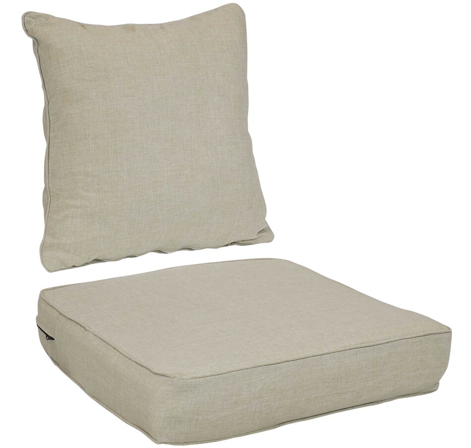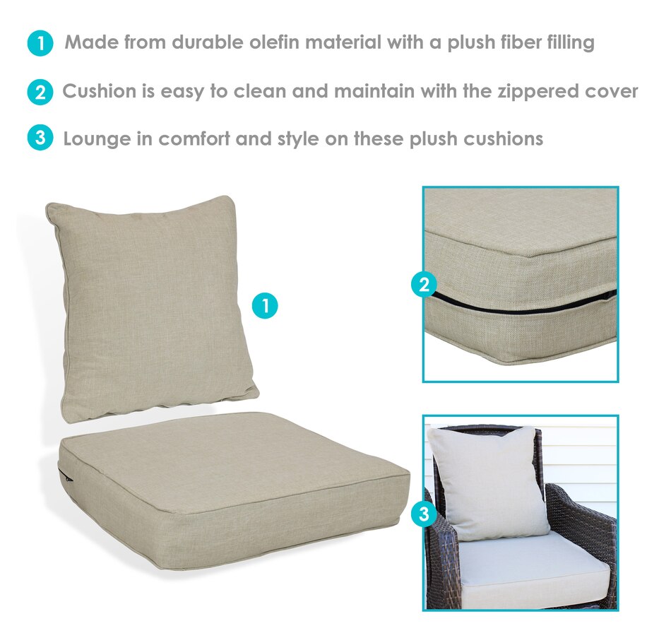 Make chairs on the patio, deck, or in the yard even more comfortable with this back and seat cushion set. Designed for deep seating, these plush cushions provide a cushy place to sit and sink into while relaxing after a long day. These cushions are constructed from a durable and easy-to-maintain fabric. The material is also durable against the elements, so they make a great addition to a variety of indoor or outdoor spaces no matter the weather! Ideal for replacing old, worn cushions or for enhancing brand-new patio furniture, these cushions are sure to be a welcome addition to any living space. They are available in several vibrant shades to give any space a pop of color or for complementing any modern, contemporary, or colorful home aesthetic. These versatile pillows are wonderful accessories to make the porch, garden, patio and indoor living areas a comfortable place to unwind and relax.