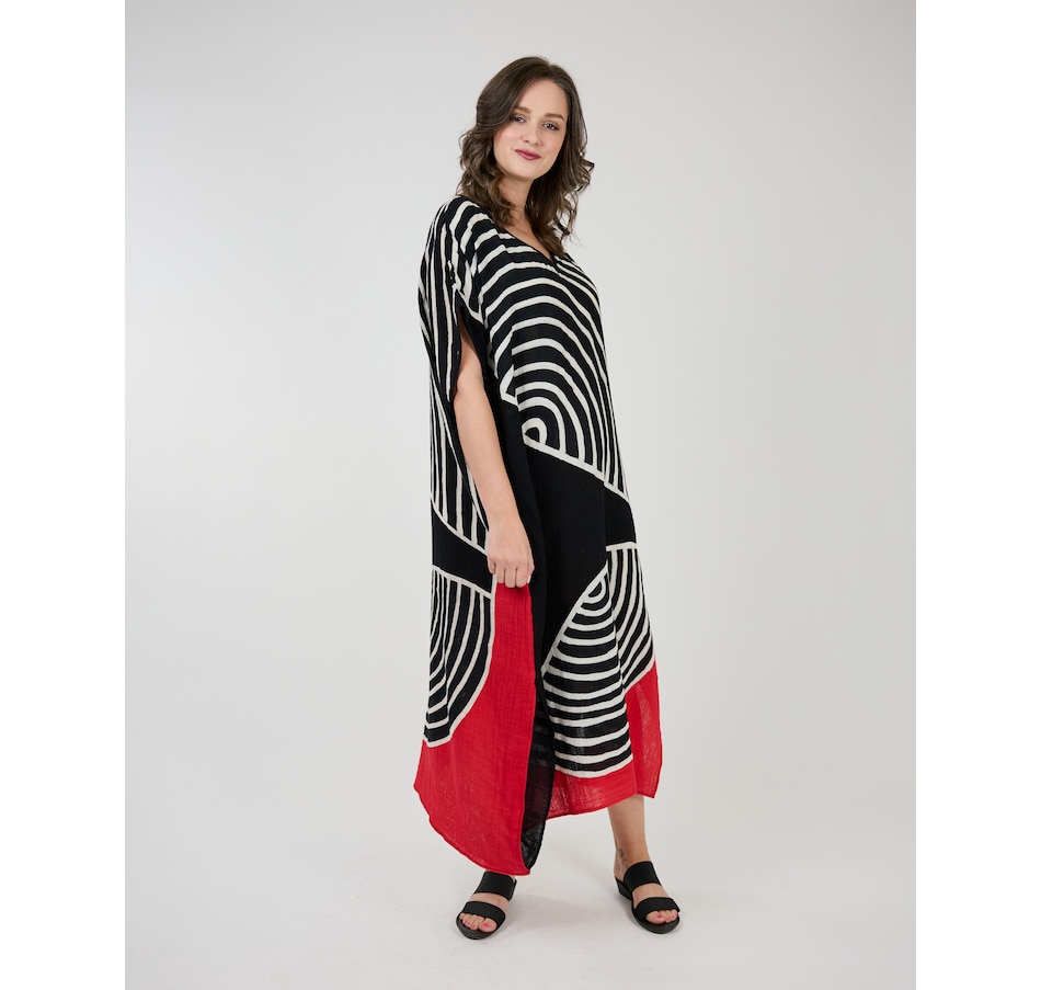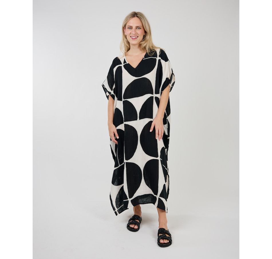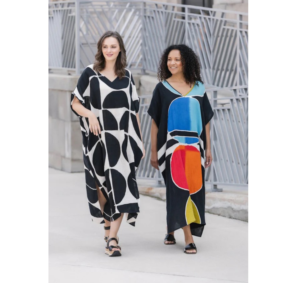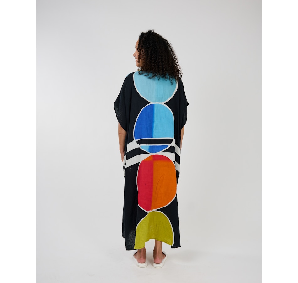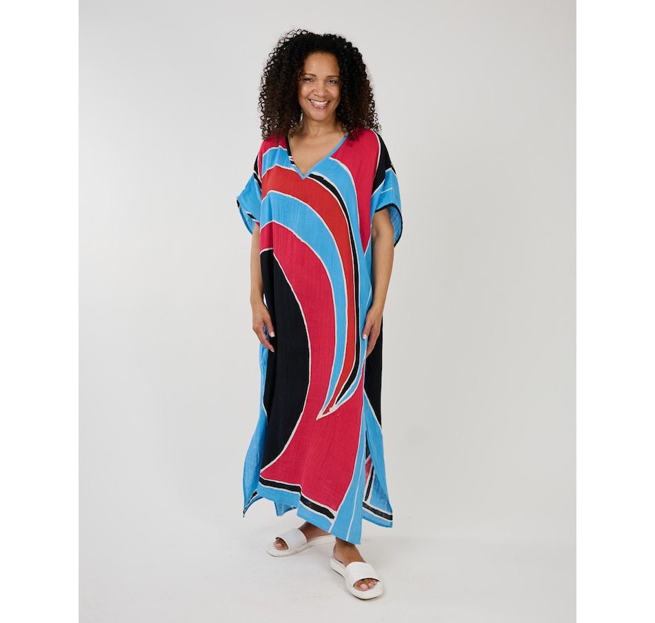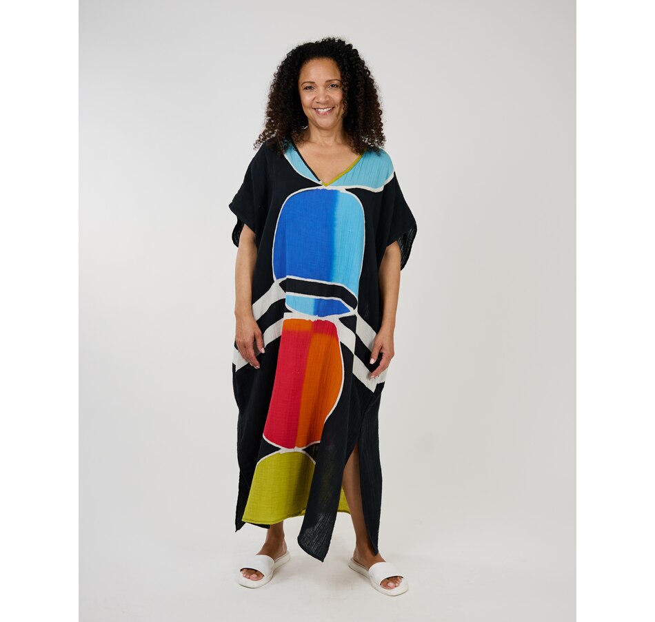 Experience runway elegance in your own closet with this stunning caftan from Shannon Passero. These new modern hand drawn Batik prints are created one by one by artisans in Chiang Mai, Thailand using traditional techniques.