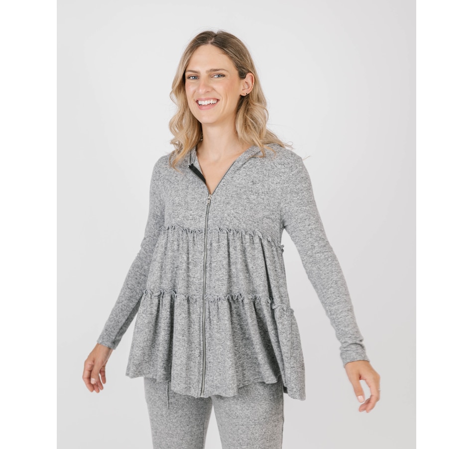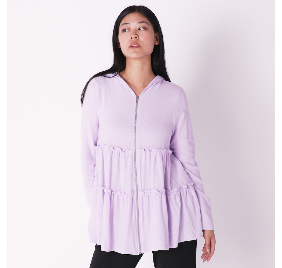 Seize the style and immerse yourself in comfort in this tiered Babydoll knit hooded cardigan. It offers a luxurious, tasteful option for any season. The ultrasoft tiger brush fabric provides superior comfort, a soft drape and the perfect weight for year-round wear.