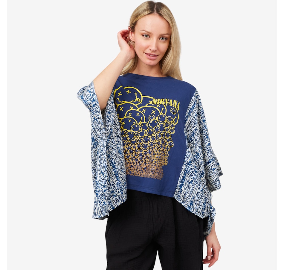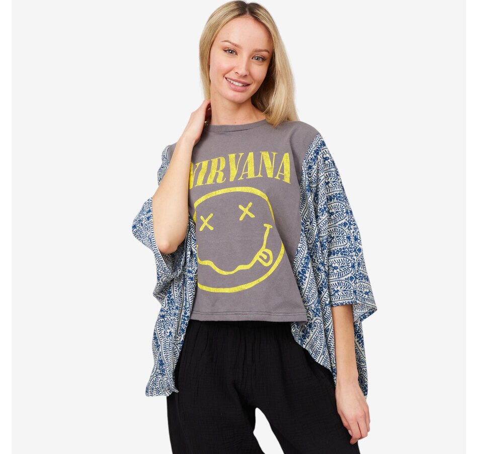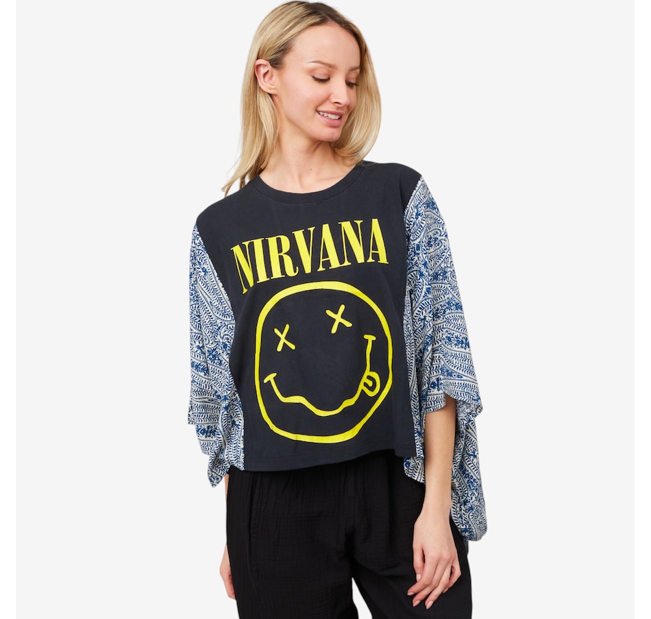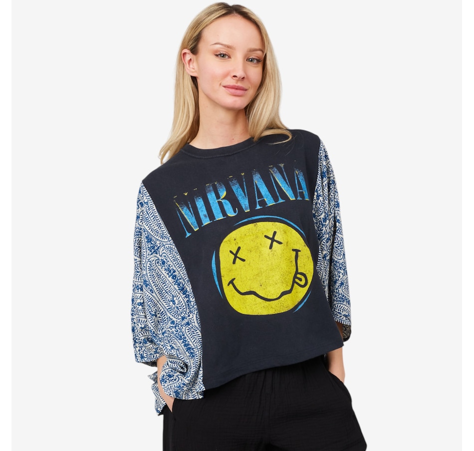 Introducing the banded pullover from Shannon Passero, a must-have addition for any wardrobe! Crafted from upcycled vintage band tees and rayon, this unique piece effortlessly blends edgy fashion with sustainability. Featuring bold graphics, raw details, and a one-of-a-kind design, it's ideal for making a statement. With its relaxed fit and standout features, this pullover fuses artistry, fashion, and individuality, making it a must-have for rock music lovers, especially fans of iconic bands like The Nirvana.