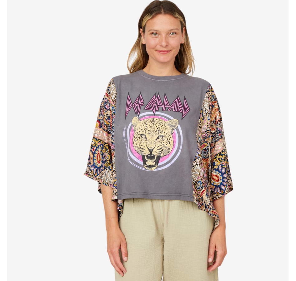 This exciting banded pullover is a must-have for any wardrobe! Crafted from upcycled vintage band tees and rayon, this unique and stylish piece wonderfully blends edgy fashion with sustainability. Featuring bold graphics, raw details, and a one-of-a-kind design, you'll love rocking this new style!