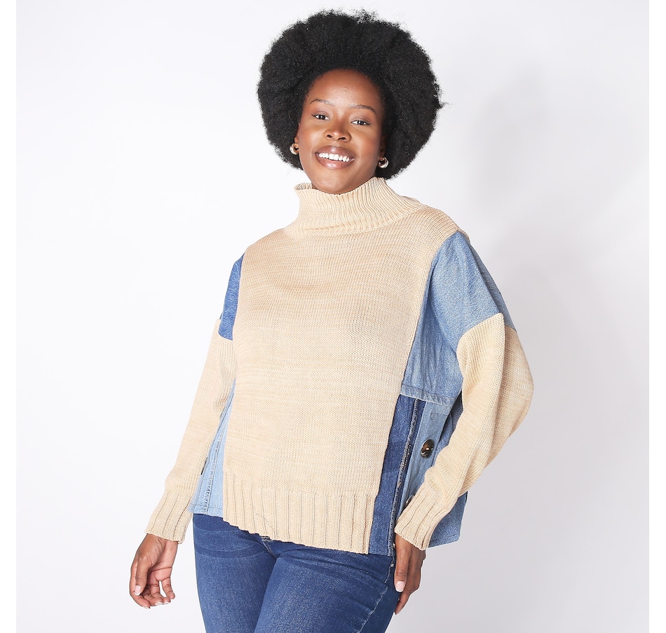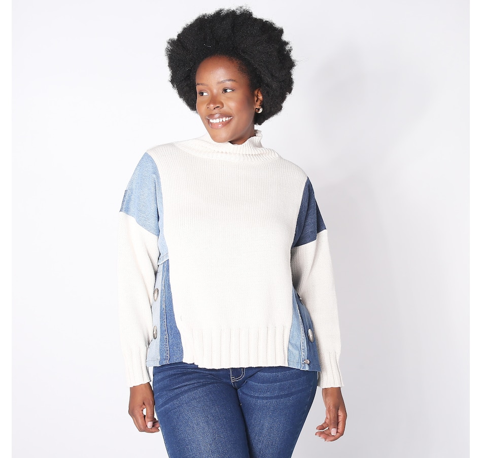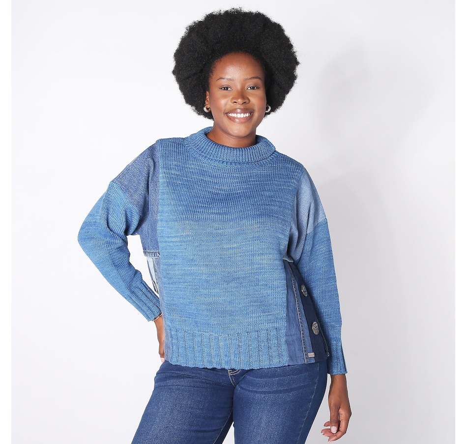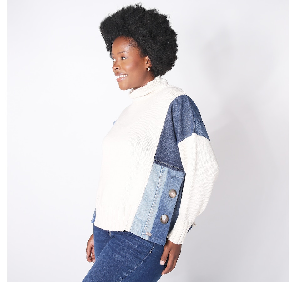 Get ready to fall in love with the Charlie pullover from Shannon Passero! This unique piece features chic upcycled denim panels with stylish button accents, and a trendy funnel neckline that elevates any outfit. With its relaxed, boxy silhouette and hand-knitted charm, this sweater is crafted from plush cotton yarn with chunky rib knit details on the cuffs, and playful side slits for extra flair. Embrace sustainable style and supreme coziness with this standout piece!