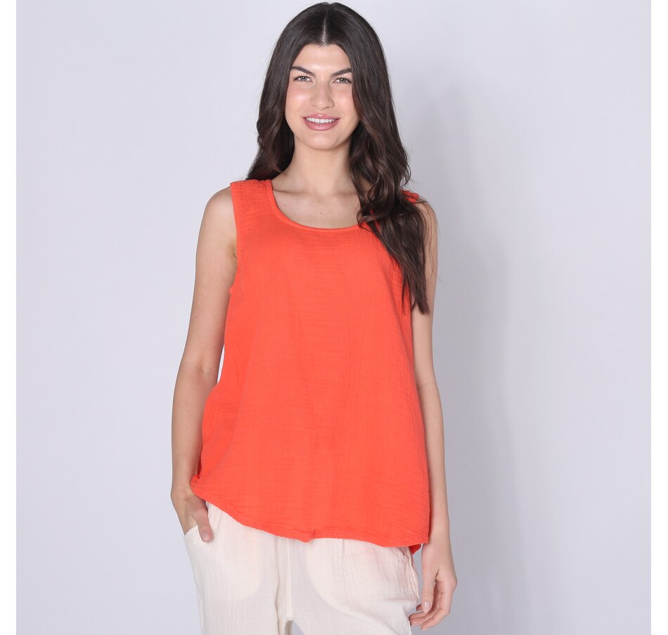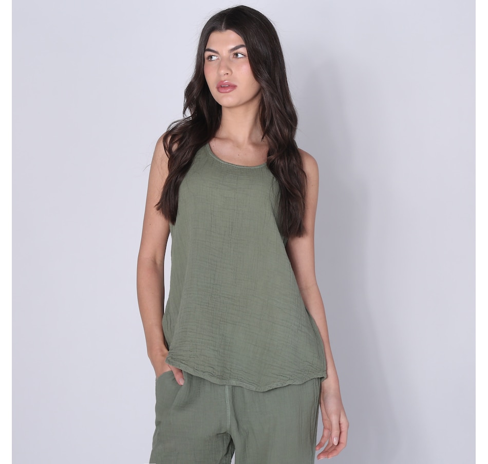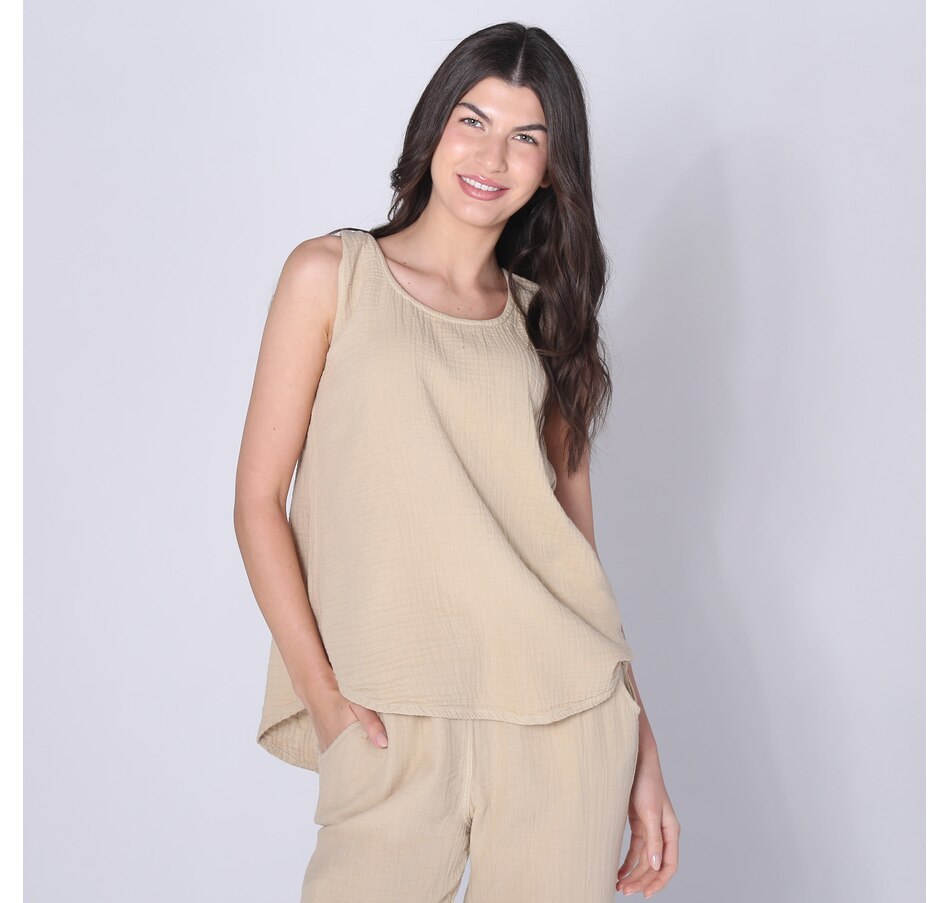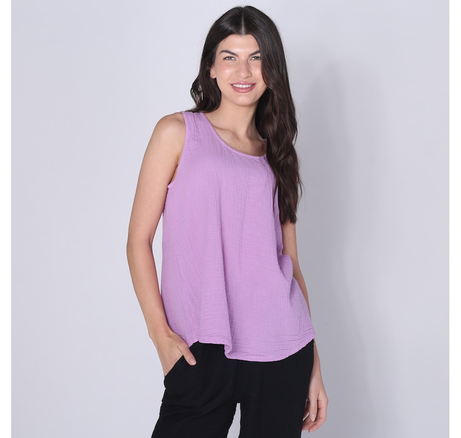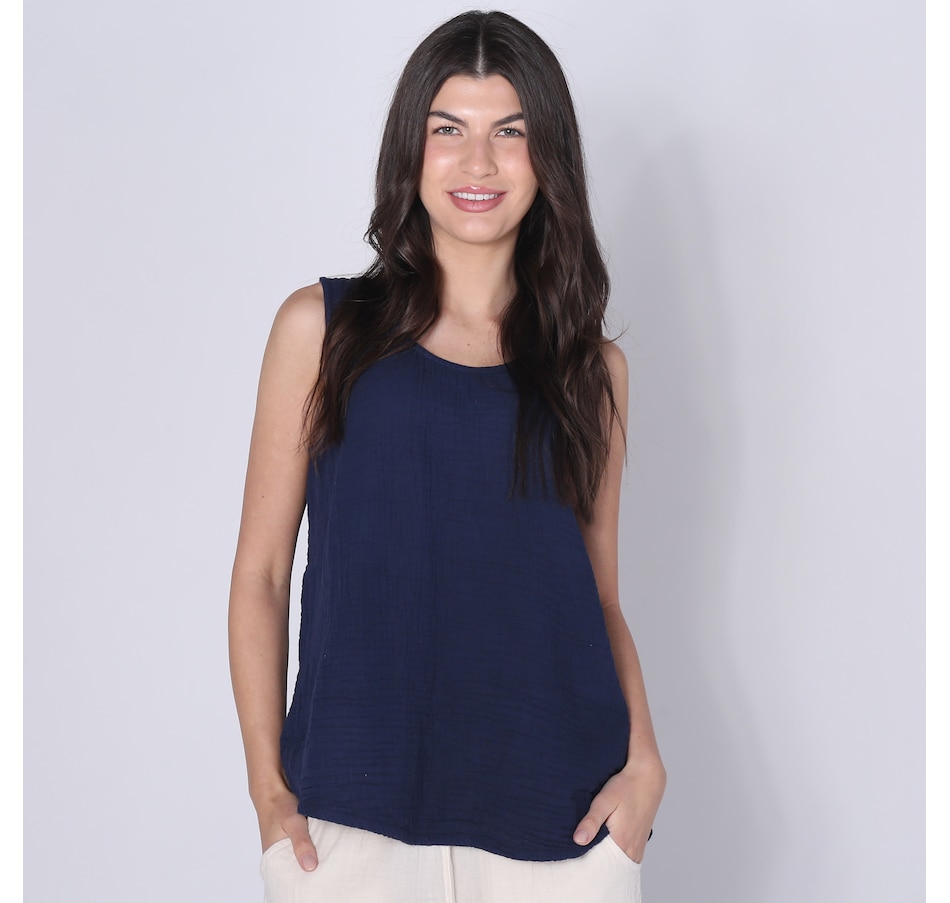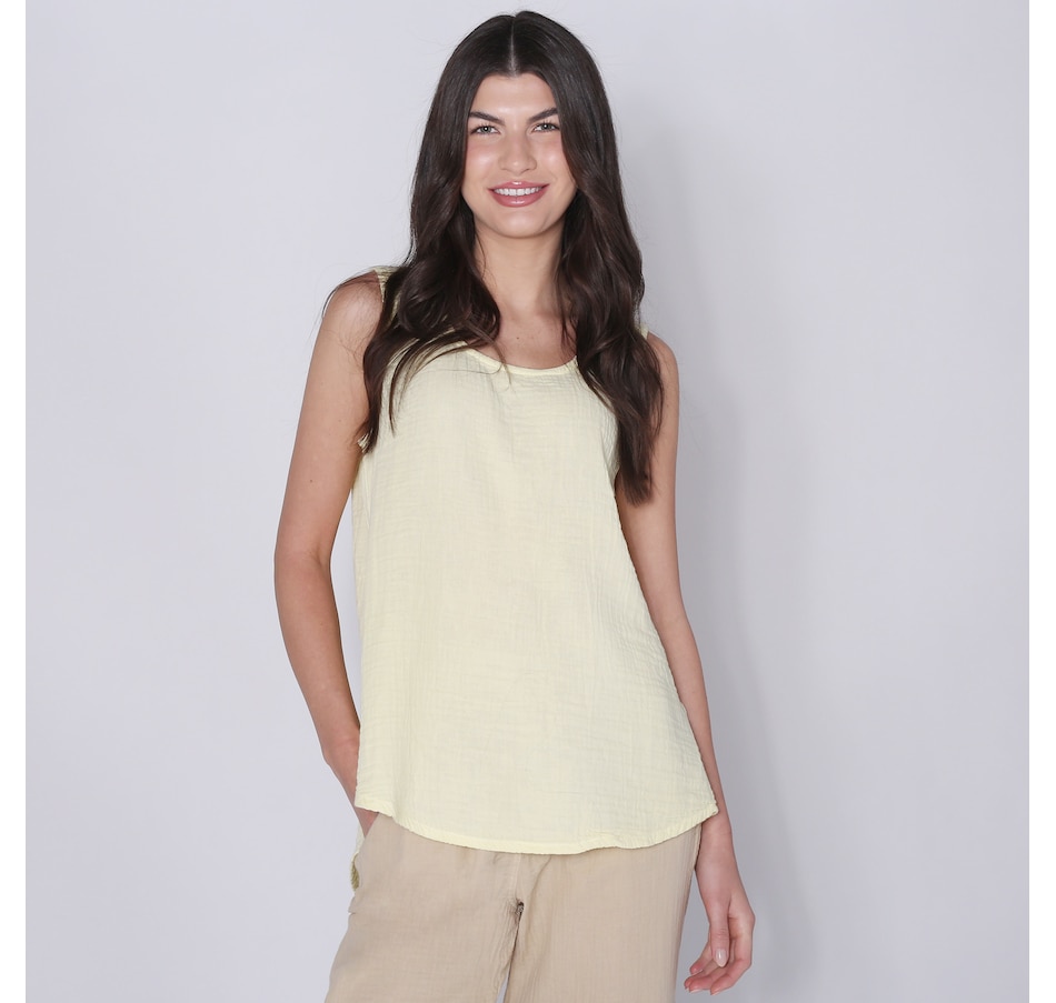 The Katy tank has the visual texture of cotton gauze, which gives a simple style added interest. The bra-friendly shoulder strap makes this piece extremely versatile, and offers a silhouette that fits the body with ease.