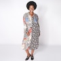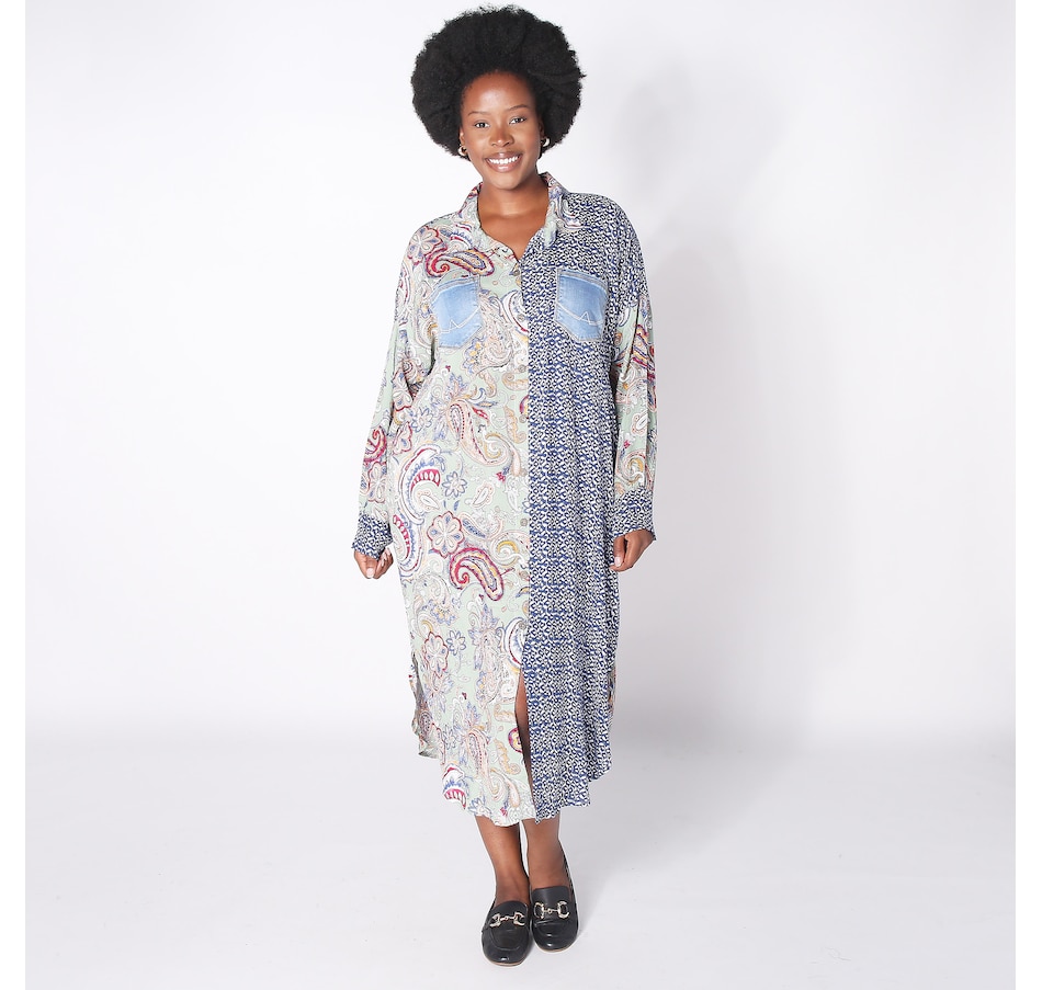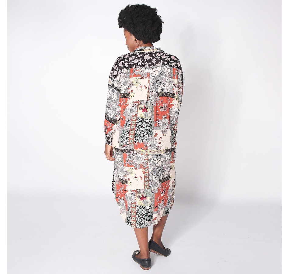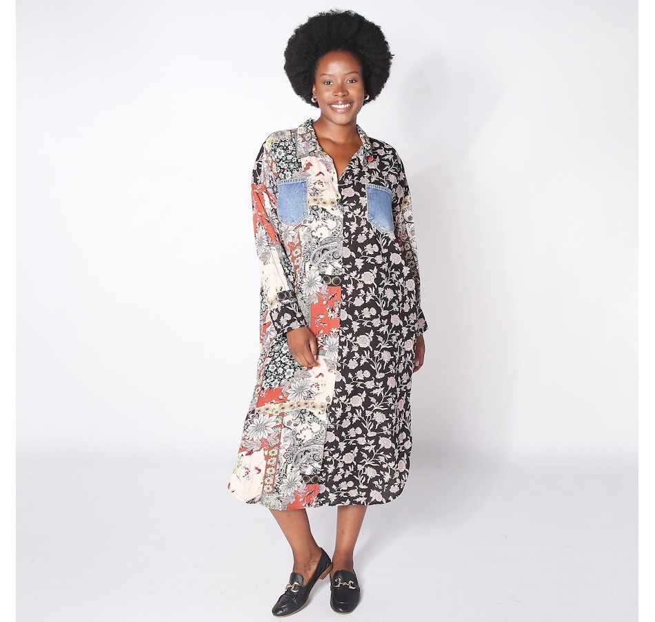 Featuring a playfully mixed print design and functional denim front pockets, this versatile piece can be worn as a dress or open as a duster. With its button front closure and upcycled vintage denim, it's a fashion-forward choice that helps reduce waste. Make a statement and embrace eco-chic with the Davina!
