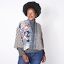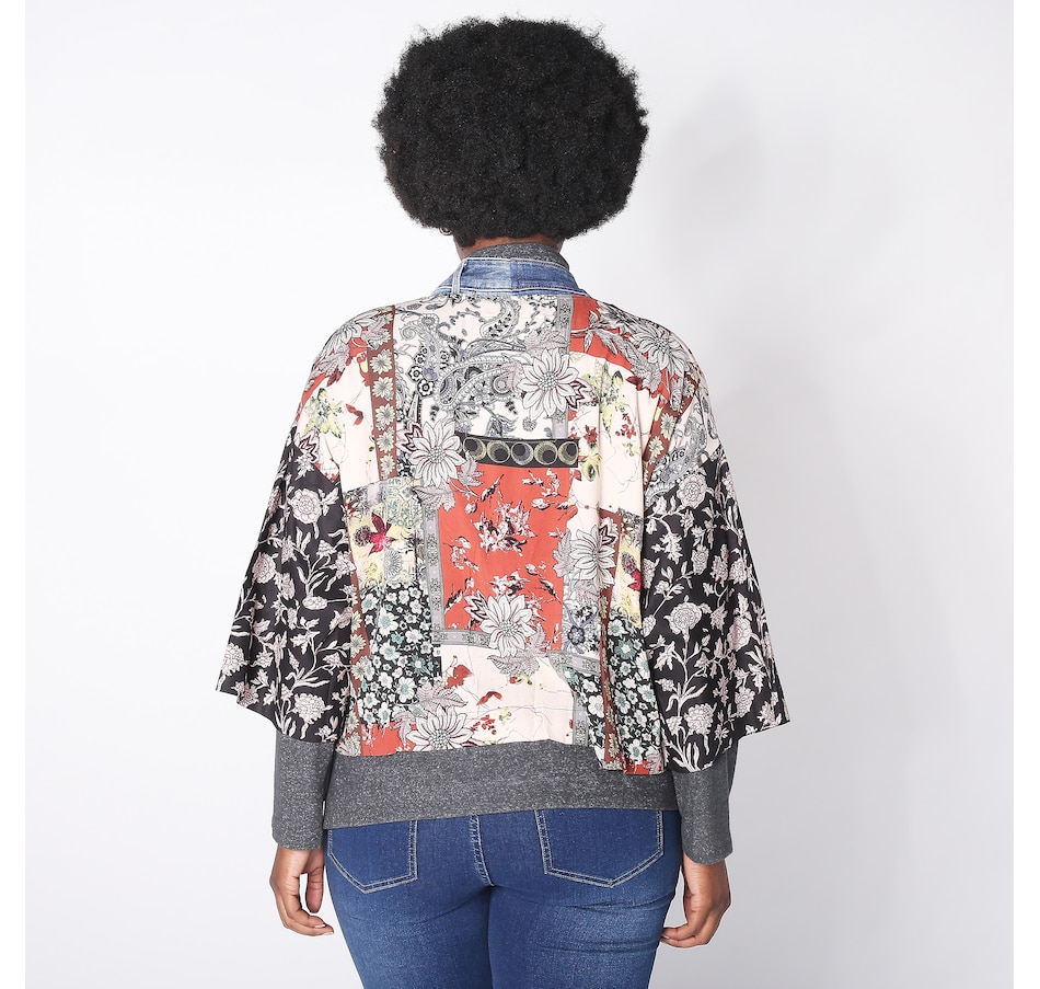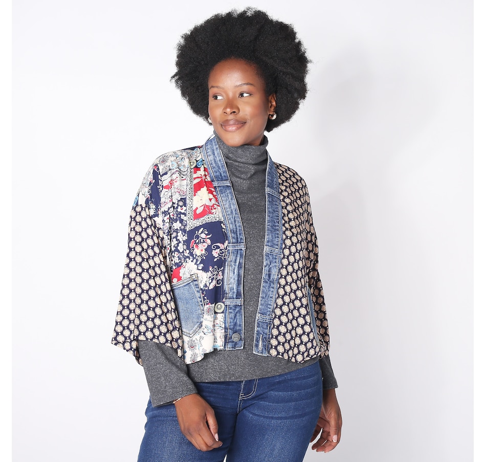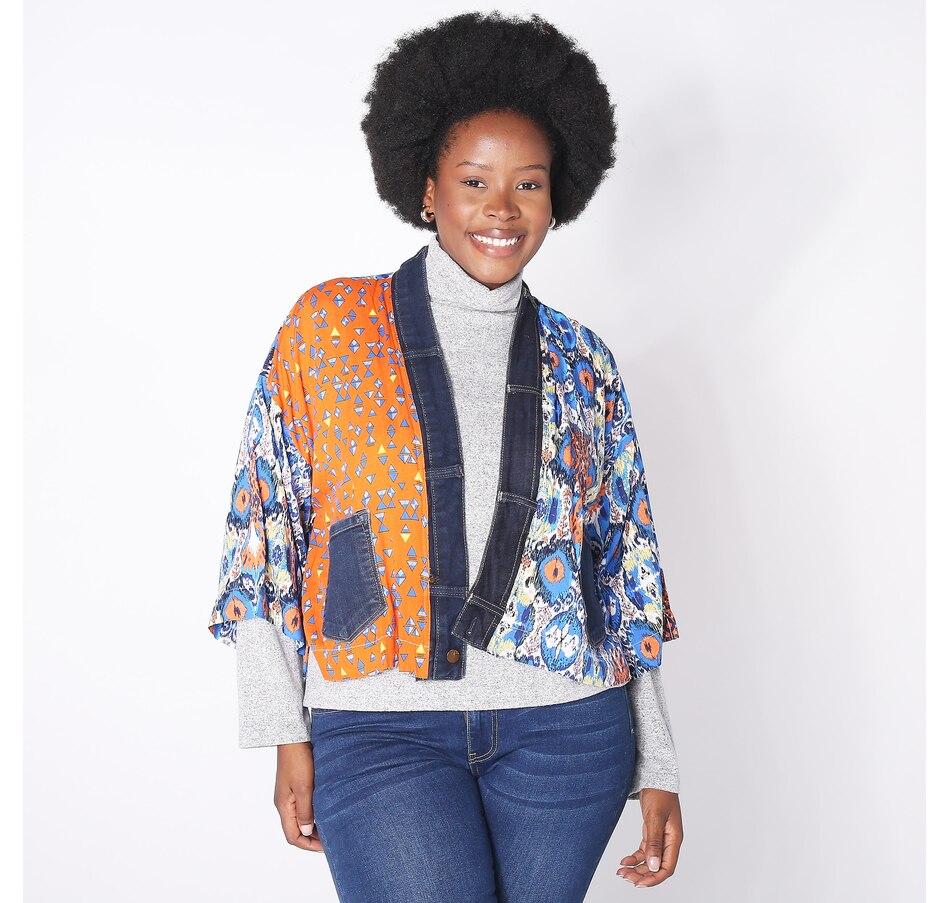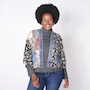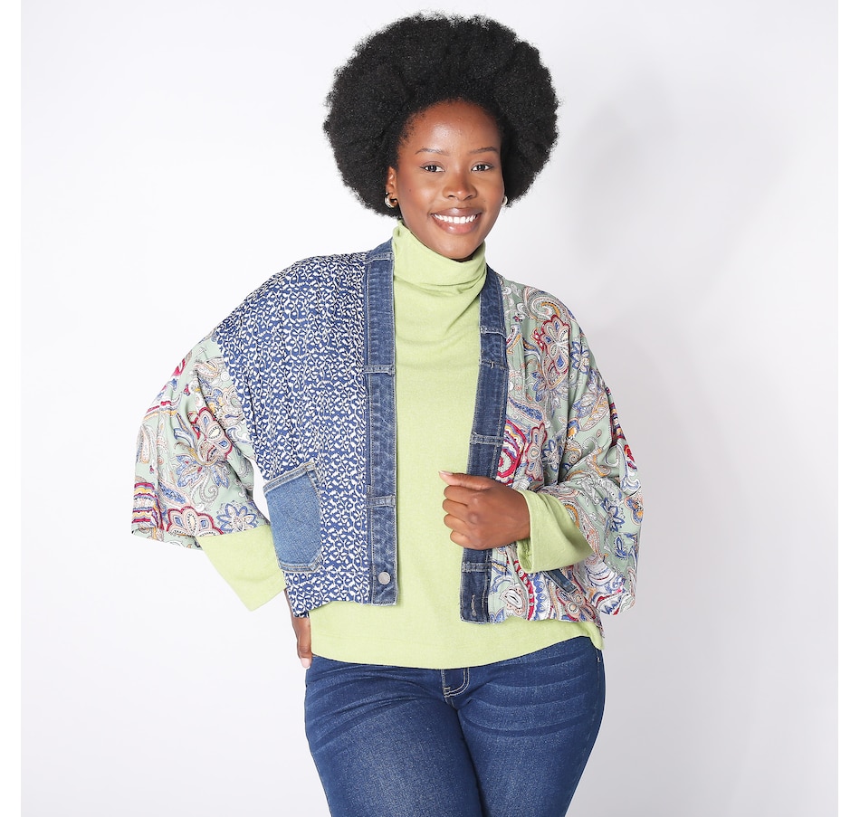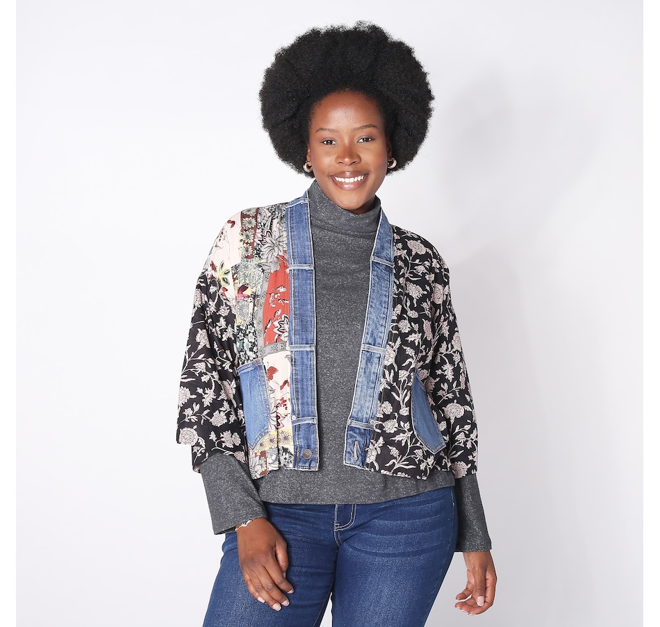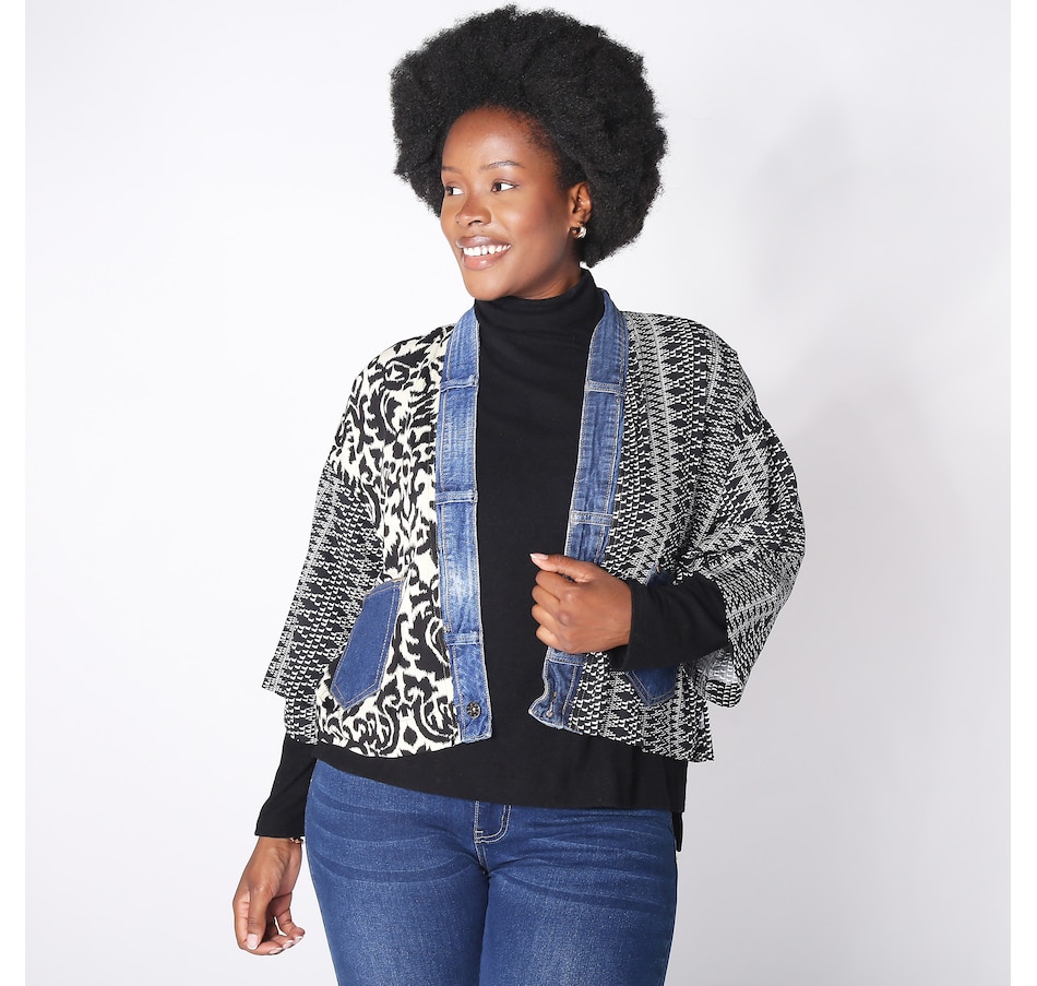 Adorned with elegant prints lovingly crafted by Shannon Passero's woman's co-op in Thailand and featuring deconstructed vintage upcycled denim, this cardigan is a true fashion statement. It's not just a piece of clothing; it's a story of artistry and sustainability that will garner attention wherever you go!