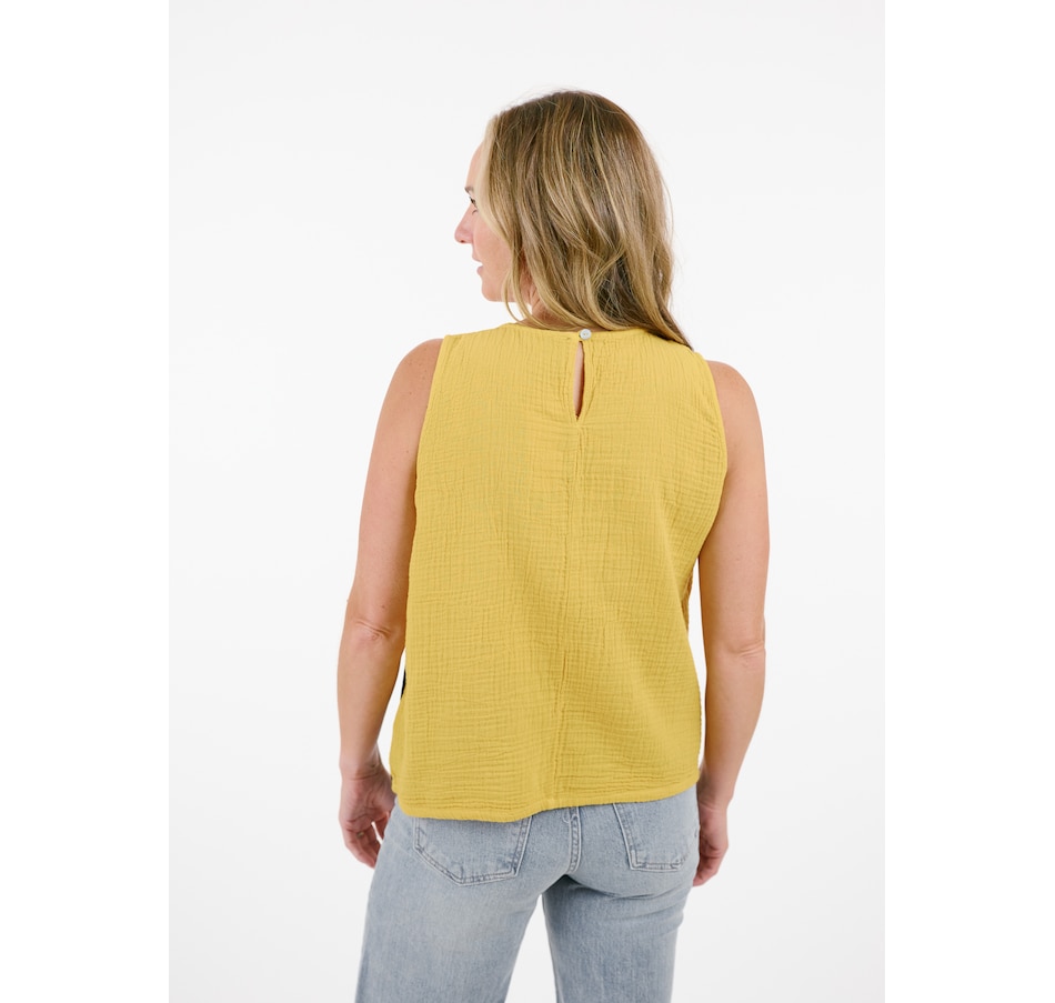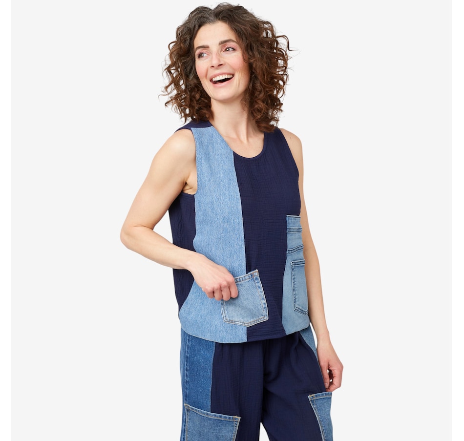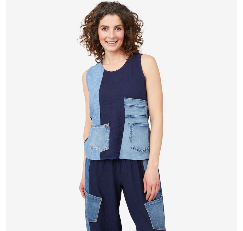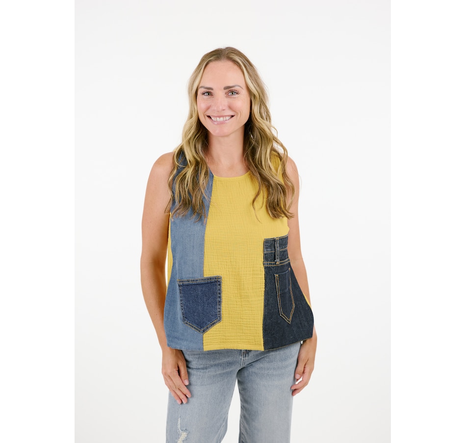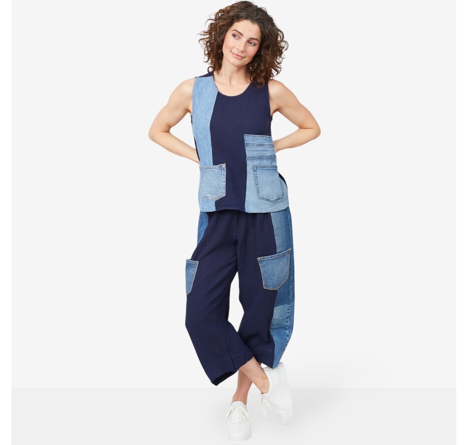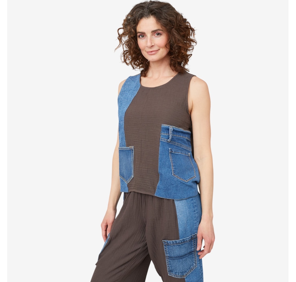 Introducing the Mirabella tank top, where soft, breezy cotton gauze meets unique upcycled denim details, giving it a fresh and effortlessly stylish vibe. Crafted for warmer days, this tank is lightweight and comfortable, while the denim accents add an edgy touch. By reusing denim, Shannon Passero helps reduce landfill waste, making it an eco-friendly choice. Whether paired with shorts or layered for a cooler look, the Mirabella is a versatile must-have for everyday style.
