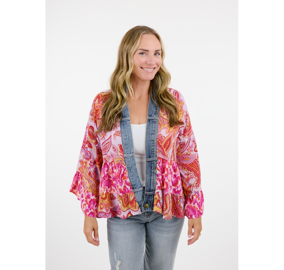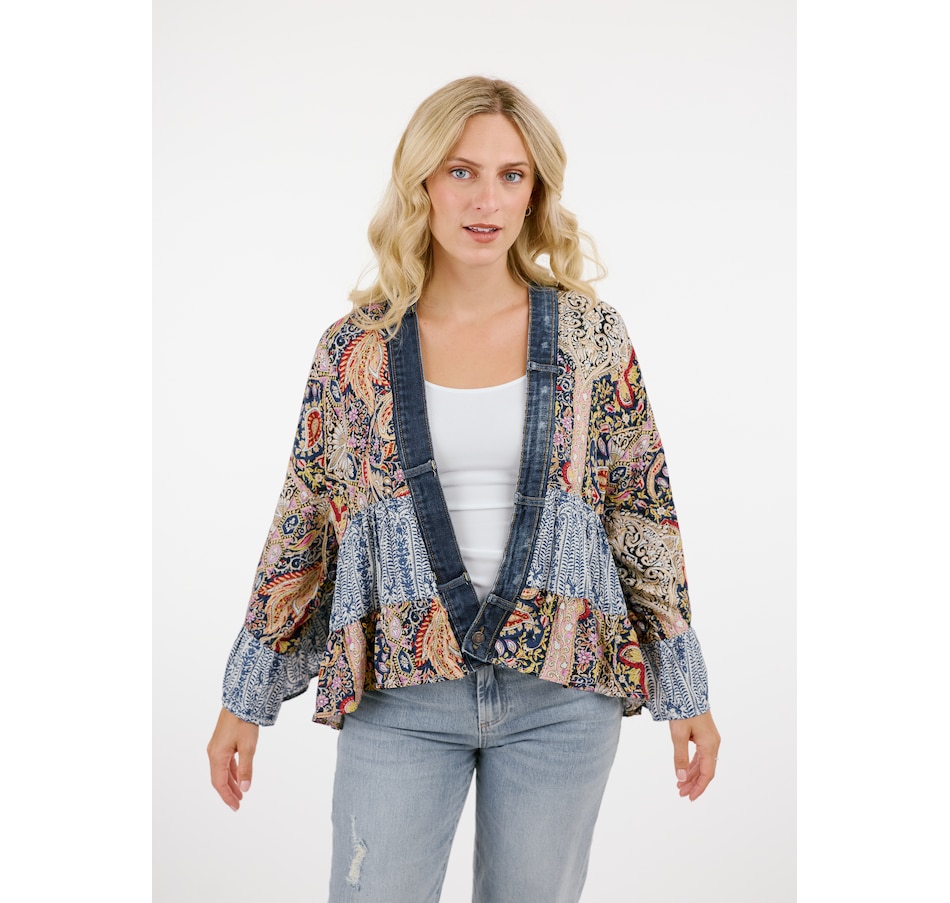 The Tiffany cardigan, one of Shannon Passero's best-sellers, combines a vibrant mix of prints, repurposed vintage denim, and delicate tiered layers to create a beautifully textured, flowy silhouette. It's an exceptional blend of fashion and sustainability!