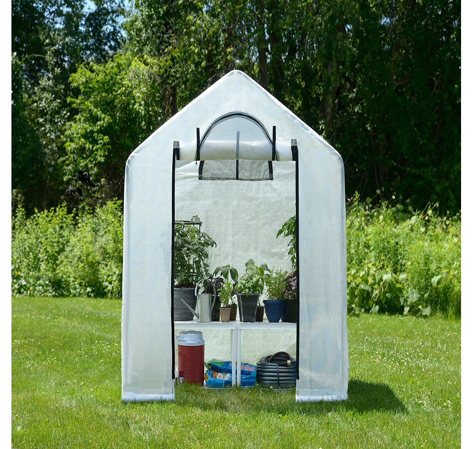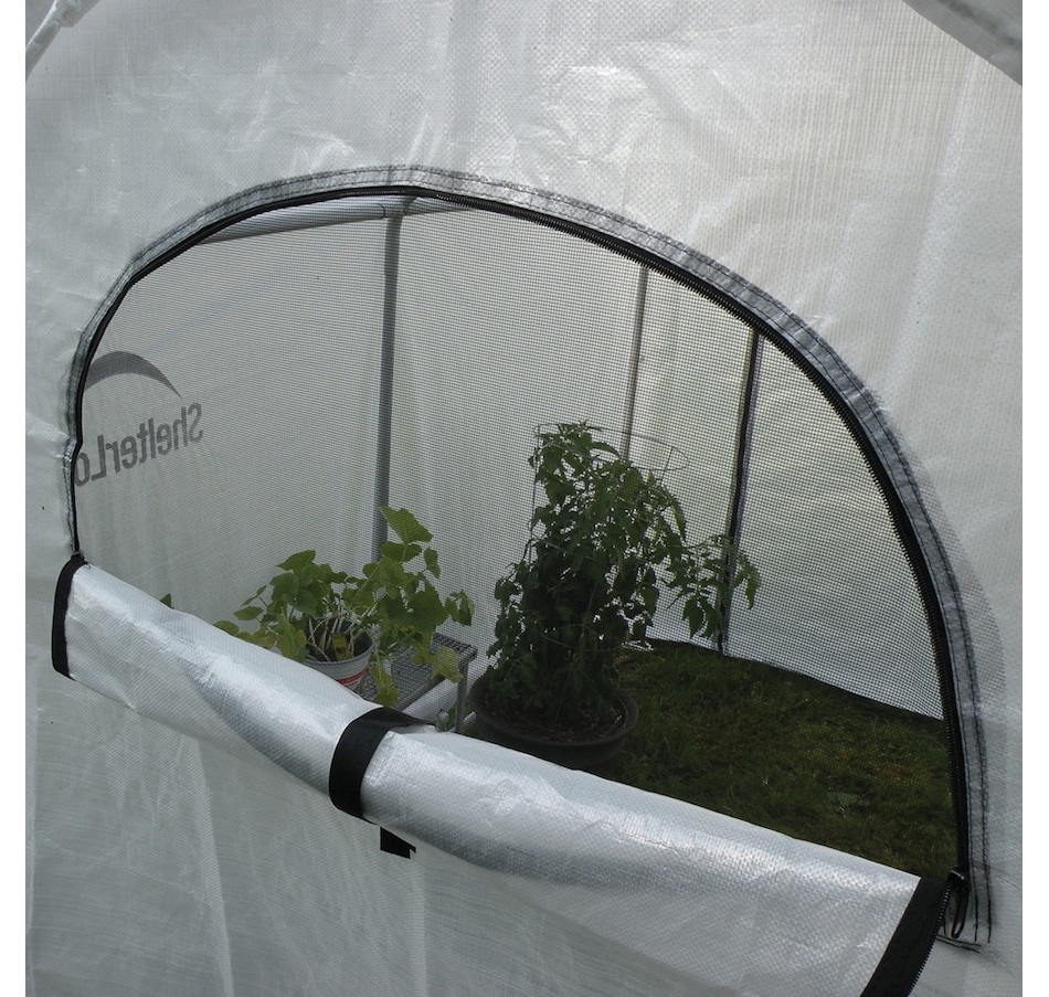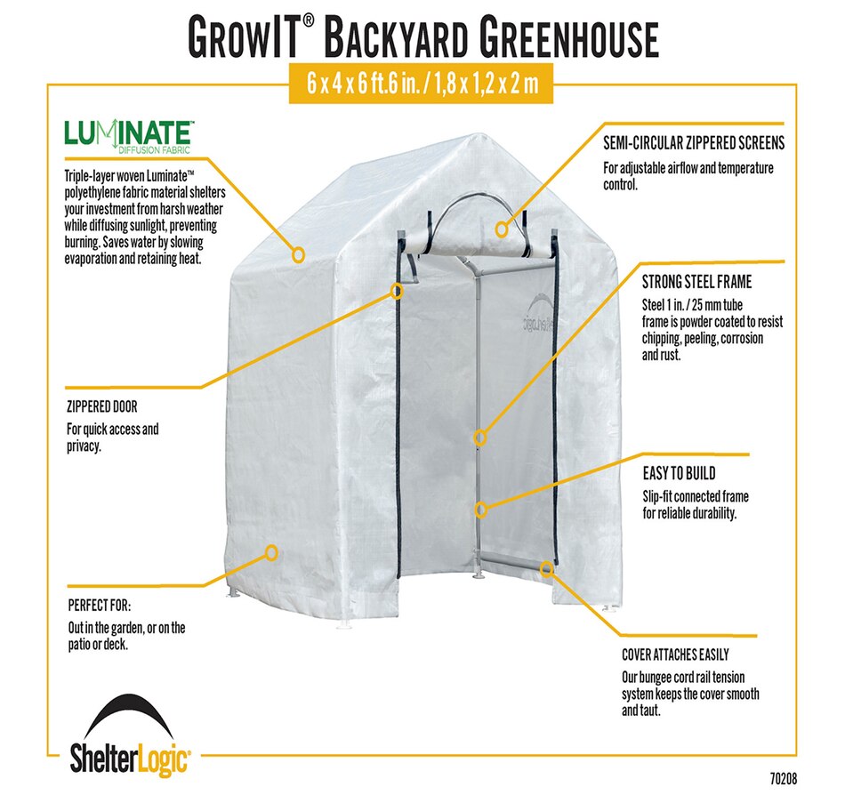 Grow quality plants faster with the GrowIT Backyard Greenhouse 6' x 4' x 6'6", a great accessory for anyone from hobbyist gardeners to professional growers. This compact, durable and functional greenhouse unit will extend your growing season by allowing you to start growing seedlings sooner, and protect plants from frost in the cooler months. Whether you've been growing plants for years, or you're just getting started, the GrowIT Backyard Greenhouse is an excellent backyard growing solution! It's different because The GrowIT Backyard Greenhouse features ShelterLogic's innovative trademark Luminate Diffusion Fabric, which grows quality plants faster thanks to its ability to retain heat and slow evaporation. The front and rear vents allow enhanced airflow and circulation within your greenhouse unit.