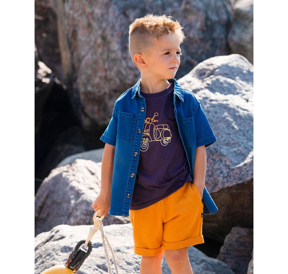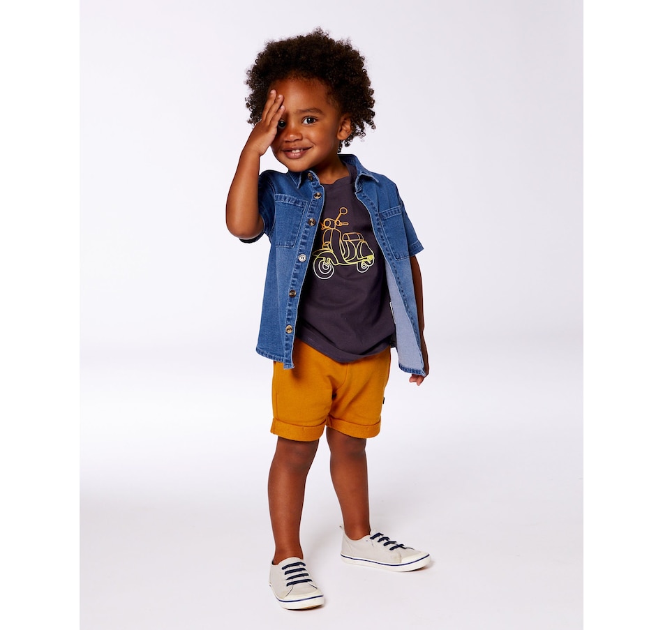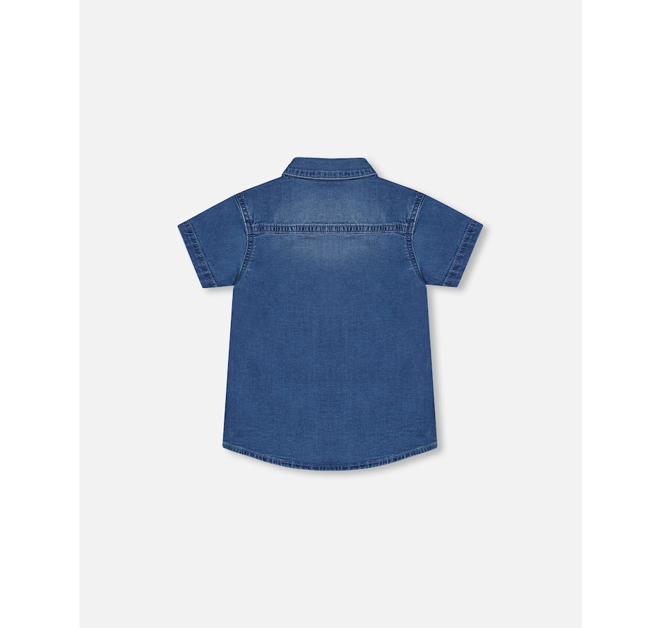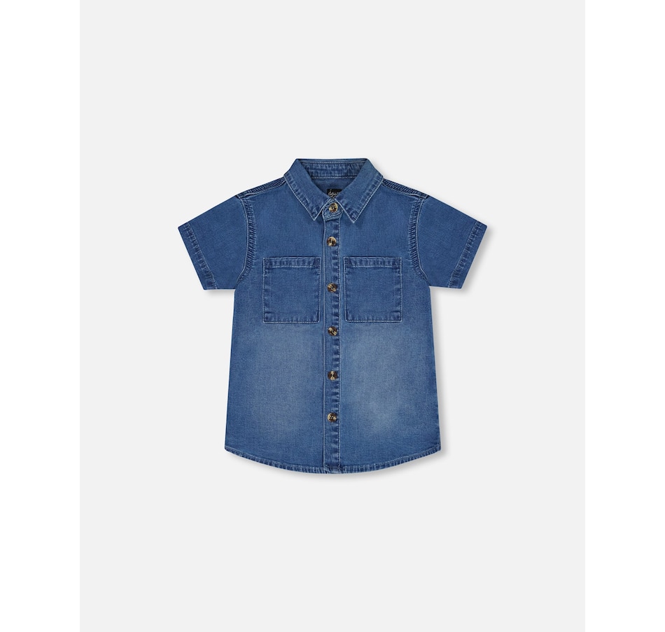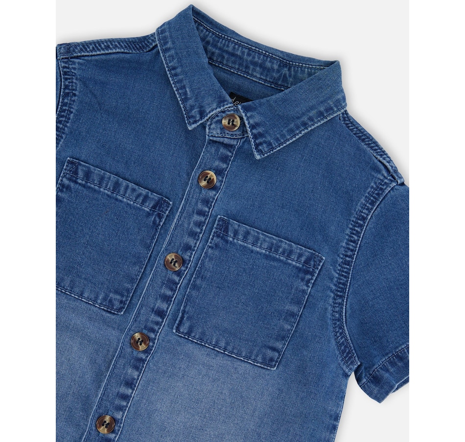 Add a layer of style over any tee shirt with our Short Sleeve Button Down Shirt Dark Denim Blue. This versatile top is made from soft stretch cotton denim and features short sleeves, a button front placket, and two patch pockets on the chest.