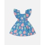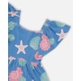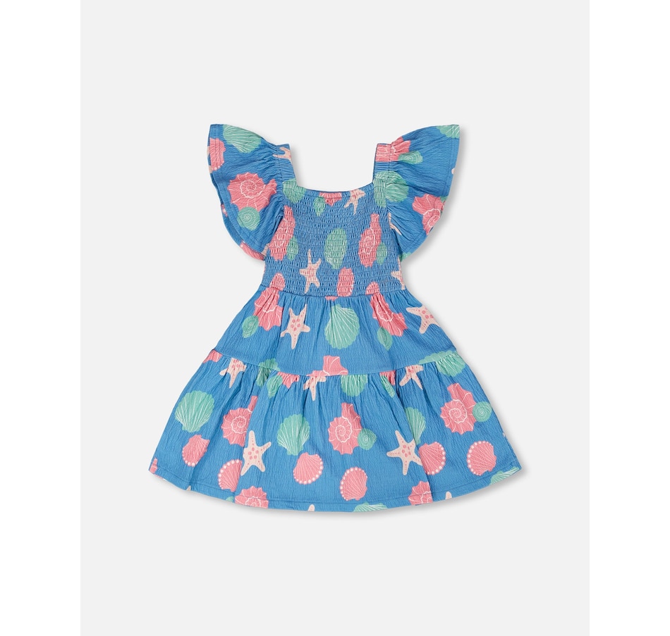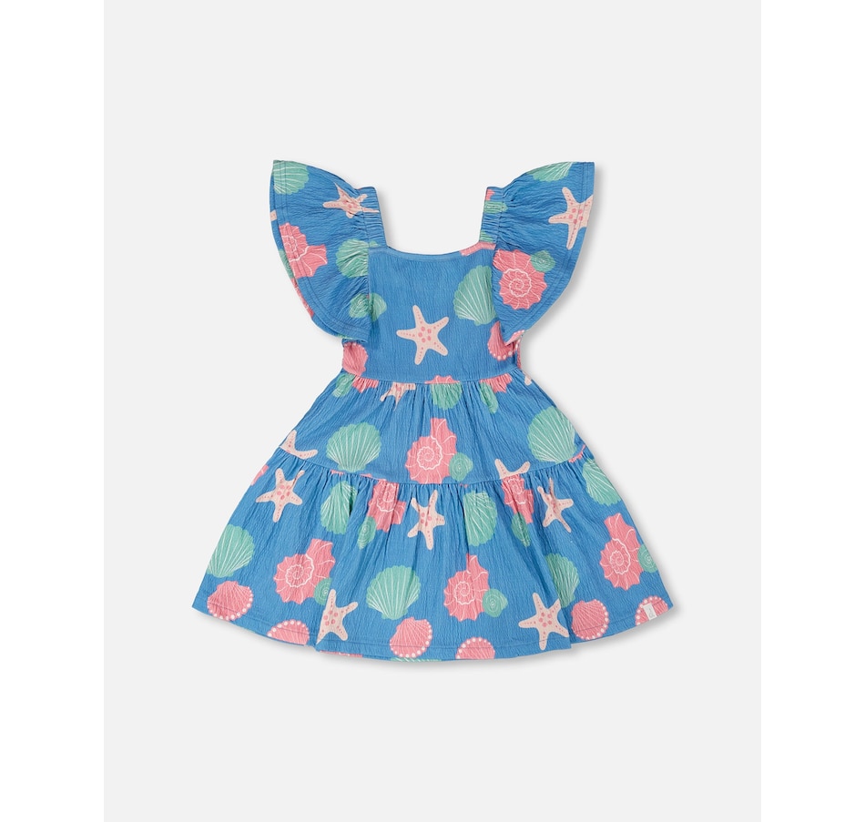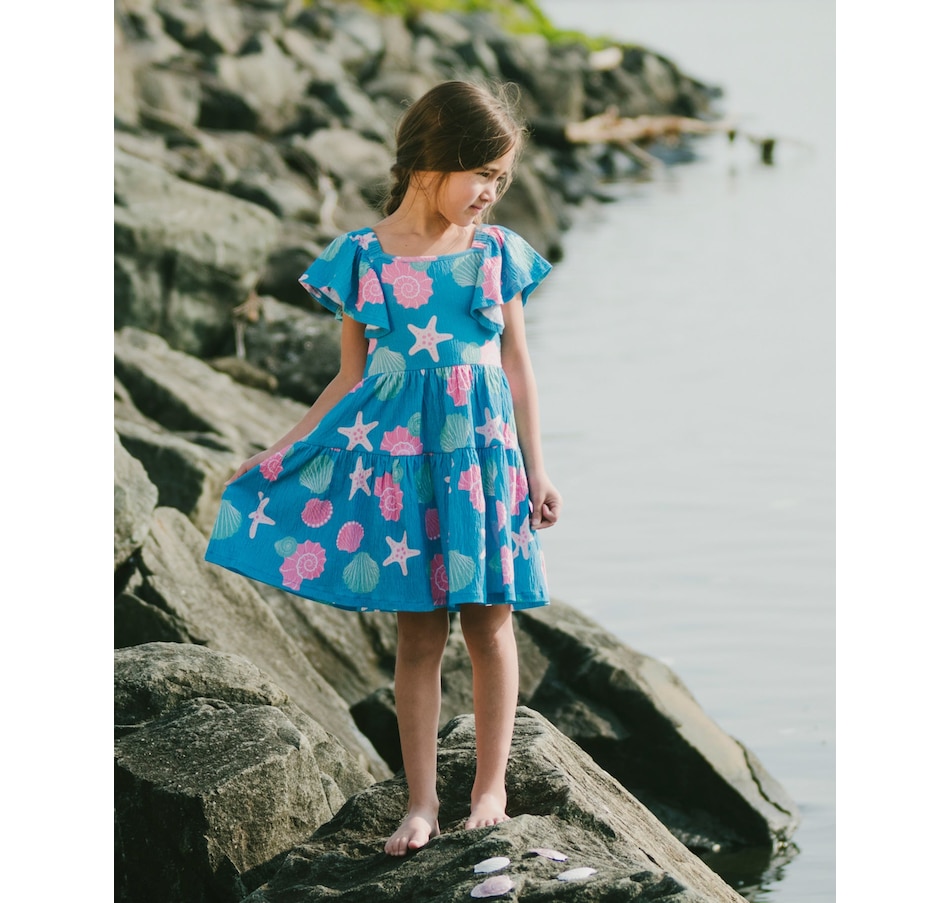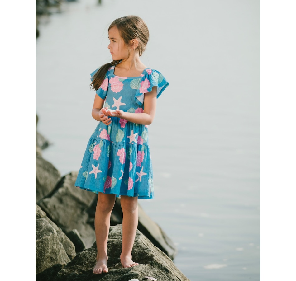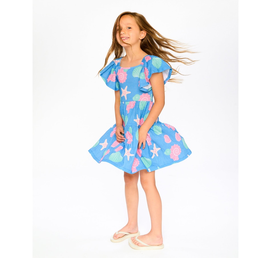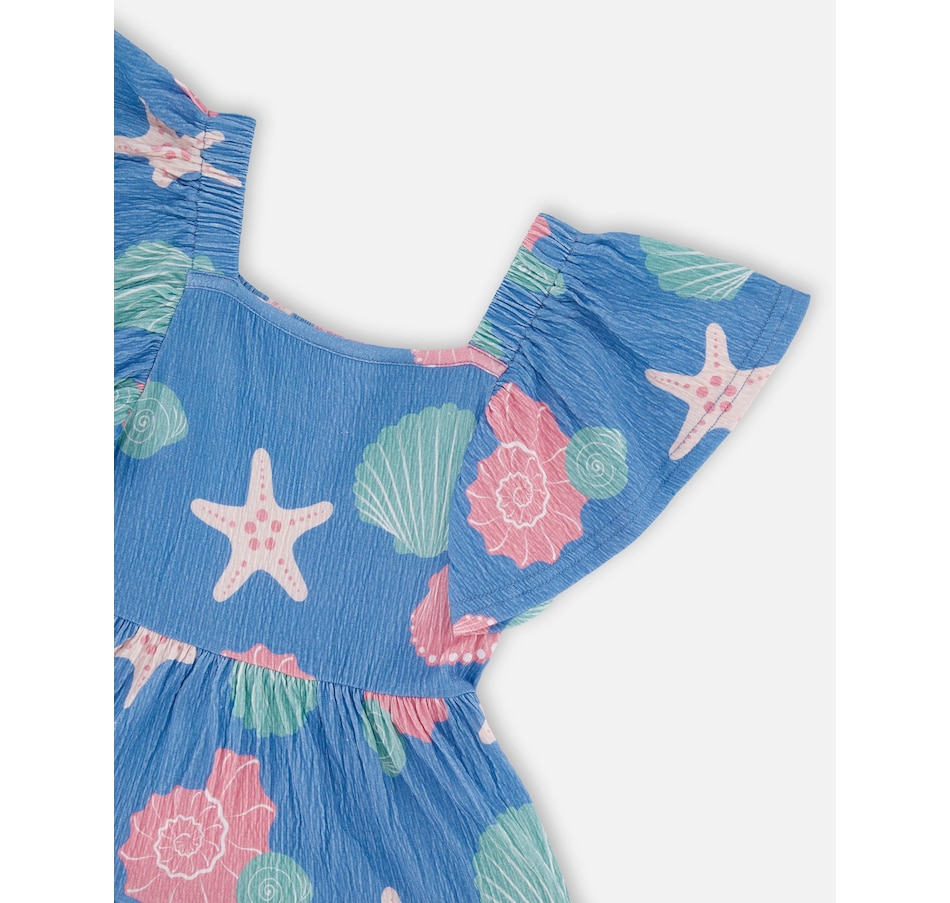 Our crinkle jersey dress blue with shell print is a cheerful style with a breezy summer feel. This A-line dress features a delicate allover print, a square neckline, short flutter sleeves, and tiered layers that create playful volume. The crinkle jersey cotton blend adds softness and stretch, making it an easy favorite from our "Blue Horizon" collection.