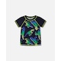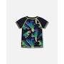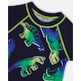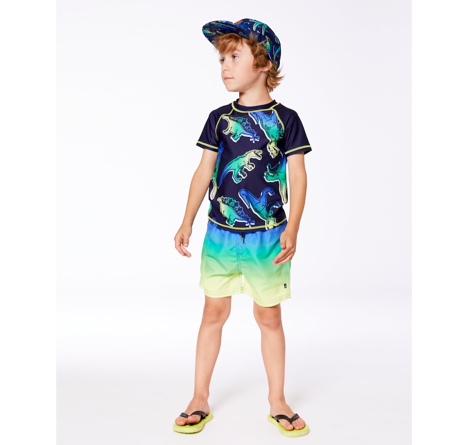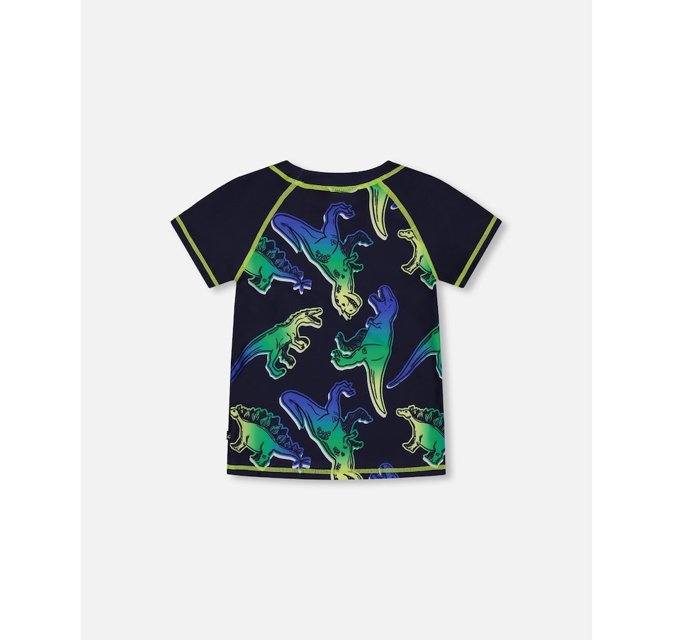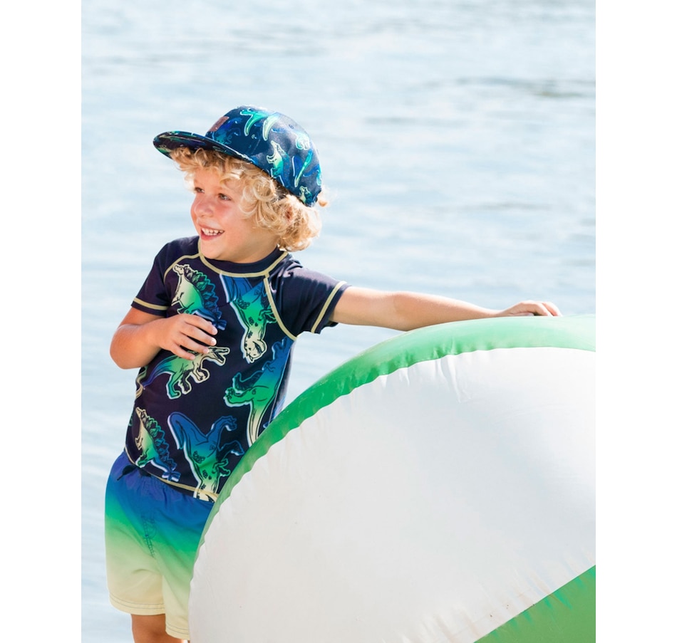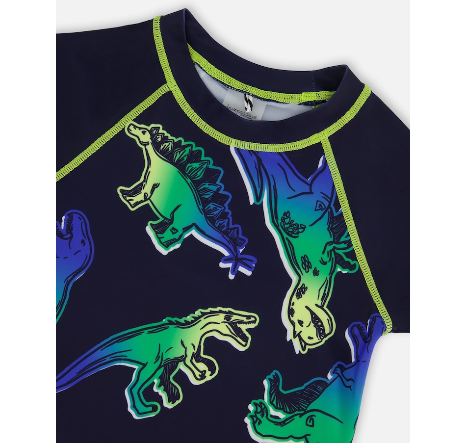 An allover dinosaur print adds bold, bright style to our Short Sleeve Rashguard Blue and Green Dino on Navy. Offering UPF 50 sun protection, this colorful rashguard features short raglan sleeves, a round neckline, a blue and green dinosaur print, and contrast topstitching at the neck, sleeves, and hem.