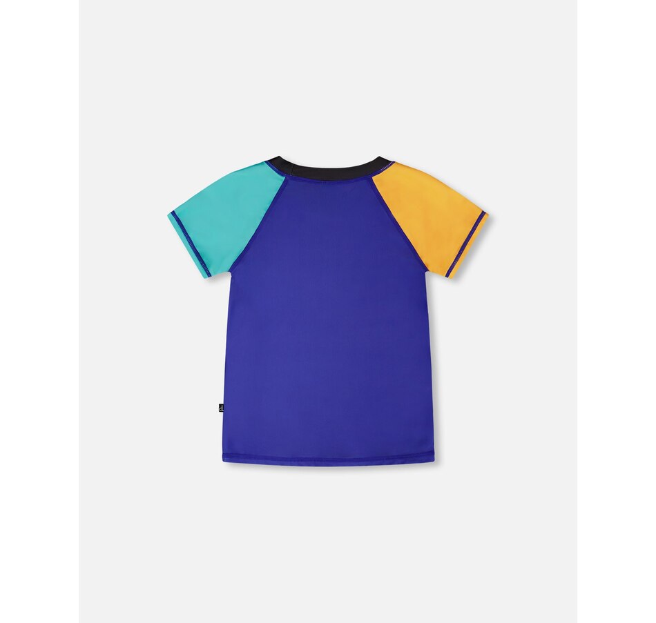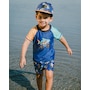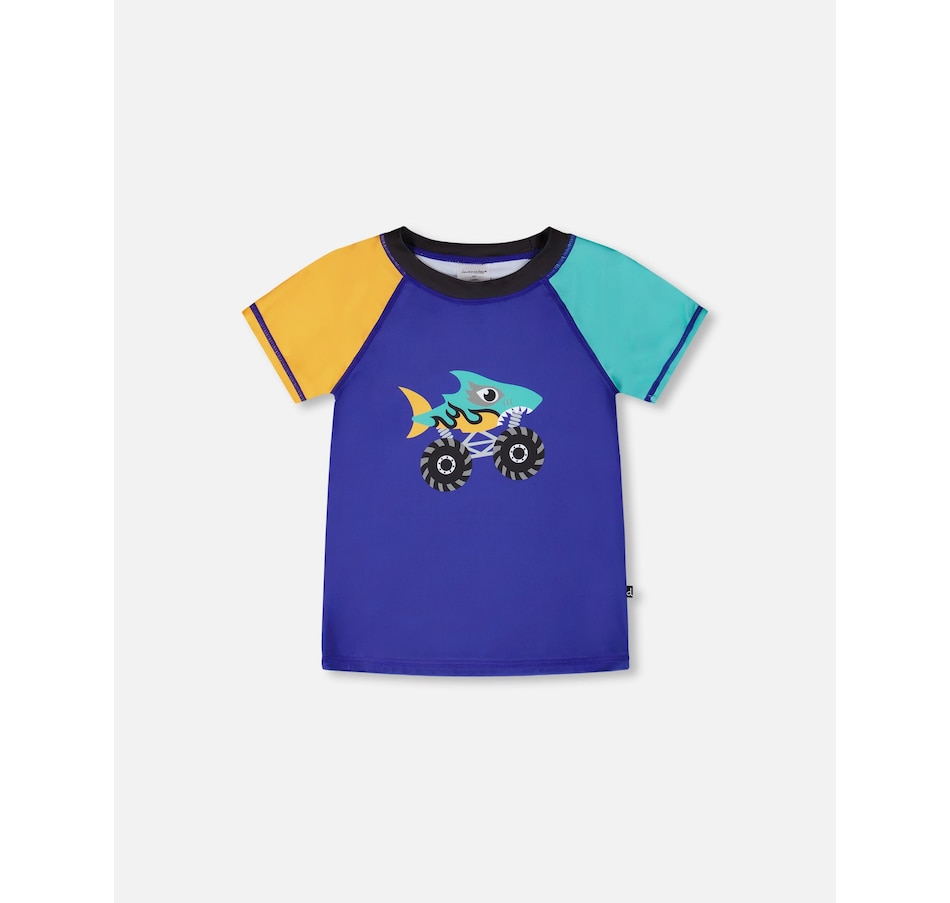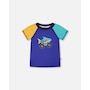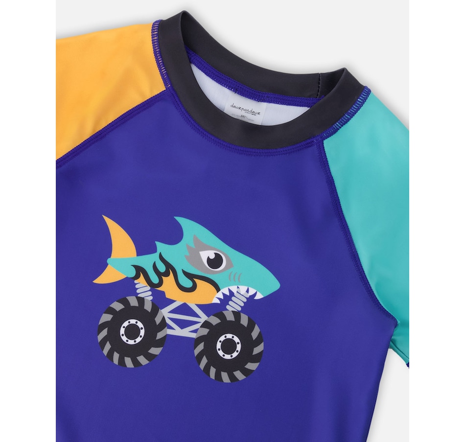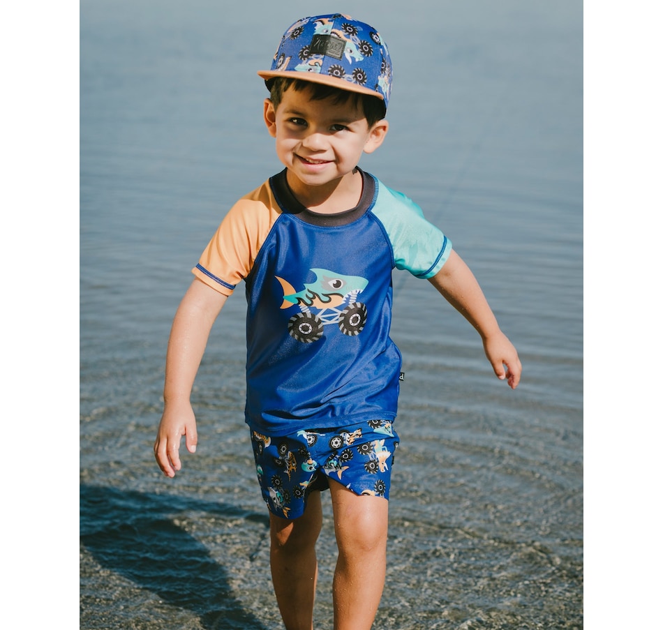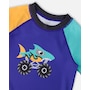 Our short sleeve rashguard in ultramarine blue adds a fun twist to sun-safe swimwear. This swim top features short contrast sleeves and a bold shark monster truck print at the front, crafted from recycled polyester with stretch for easy movement. Quick-drying and comfortable, it offers reliable sun protection for boys during all water adventures.