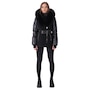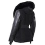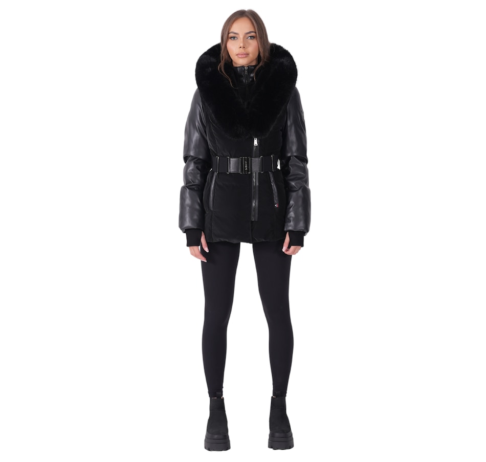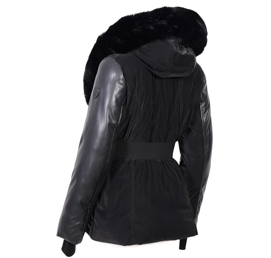 The spectacular Jen jacket from Sicily is composed of memory fabric and boasts a fitted silhouette. It is designed with an asymmetrical front zipper closure, soft faux leather sleeves with a branded logo patch on the left one. It also comes with a Sicily logo elastic belt with faux leather details, knit cuffs with a handy thumb hole, and a dramatic shawl collar hood with removable faux fox fur trim. Layered and filled with premium warmth material, it is water resistant and offers tested temperature protection up to an impressive -37c.