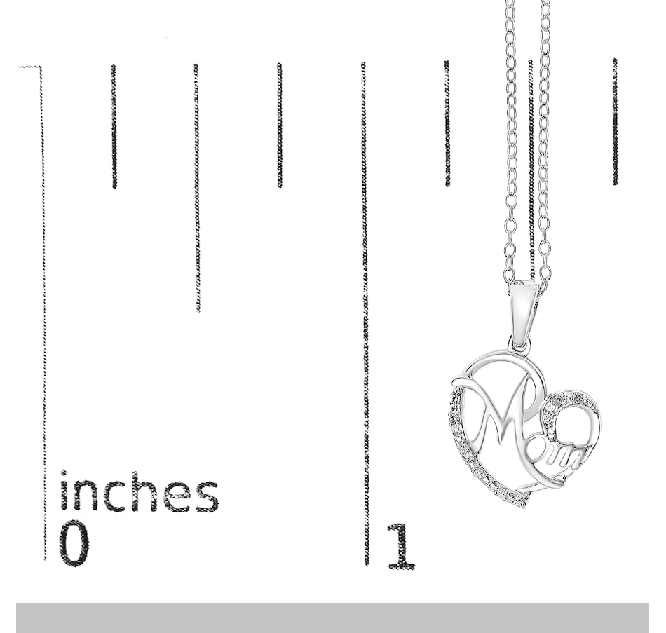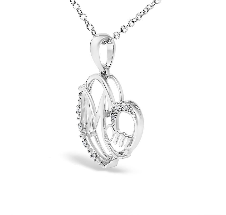 Draped in elegance and heartfelt sentiment, this exquisite necklace pays homage to the cherished word 'Mom', etched in a cursive embrace within a sterling silver heart, polished to a mirror-like sheen with rhodium. Natural diamonds, seven in count, twinkle along the delicate contours, summing up to 0.05 carats of J-K color and I2-I3 clarity, embedding sparks of love with every glance. Nestled on a refined 18-inch rope-style chain and secured by a spring-ring clasp, this pendant exudes grace and appreciation, making it an impeccable tribute to the unparalleled bond shared with a mother. Perfectly sized and crafted to be treasured, it serves as an ever-present reminder of affection and adoration.