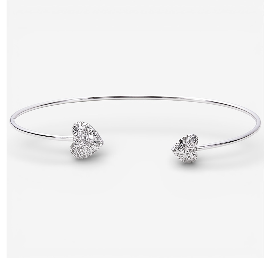 Add a romantic touch to your wrist with this sterling silver bangle from Silver Gallery, featuring delicate heart details for a timeless look. The rhodium plating enhances shine and durability, while the slip-on cuff design ensures easy and comfortable wear. Made in Hong Kong and nickel free, this piece is perfect for everyday elegance.