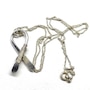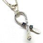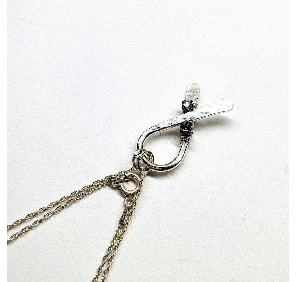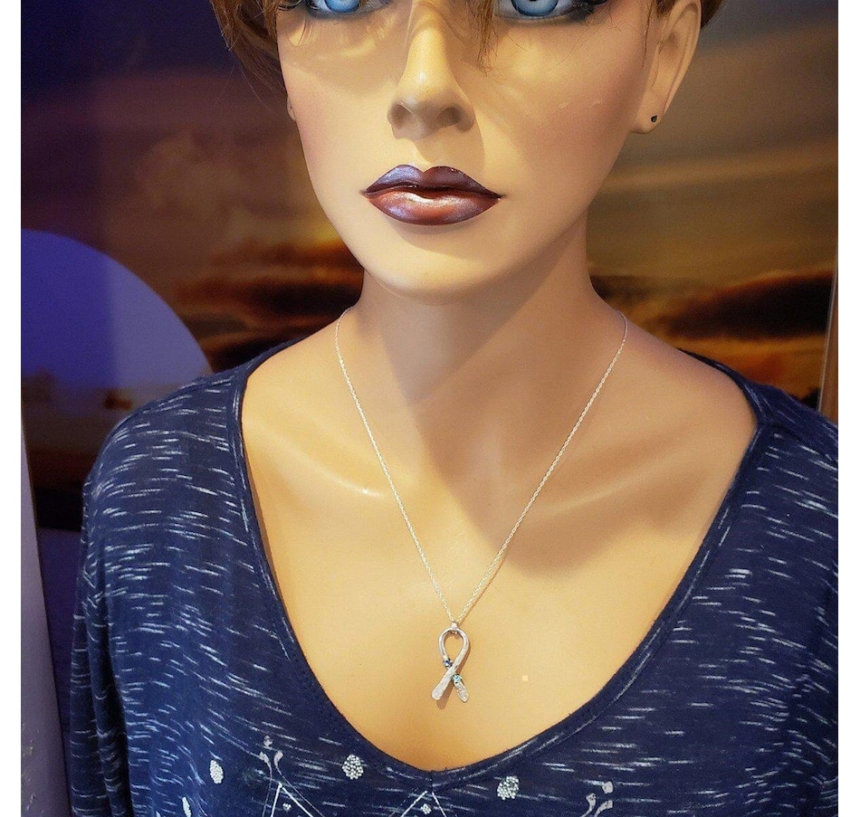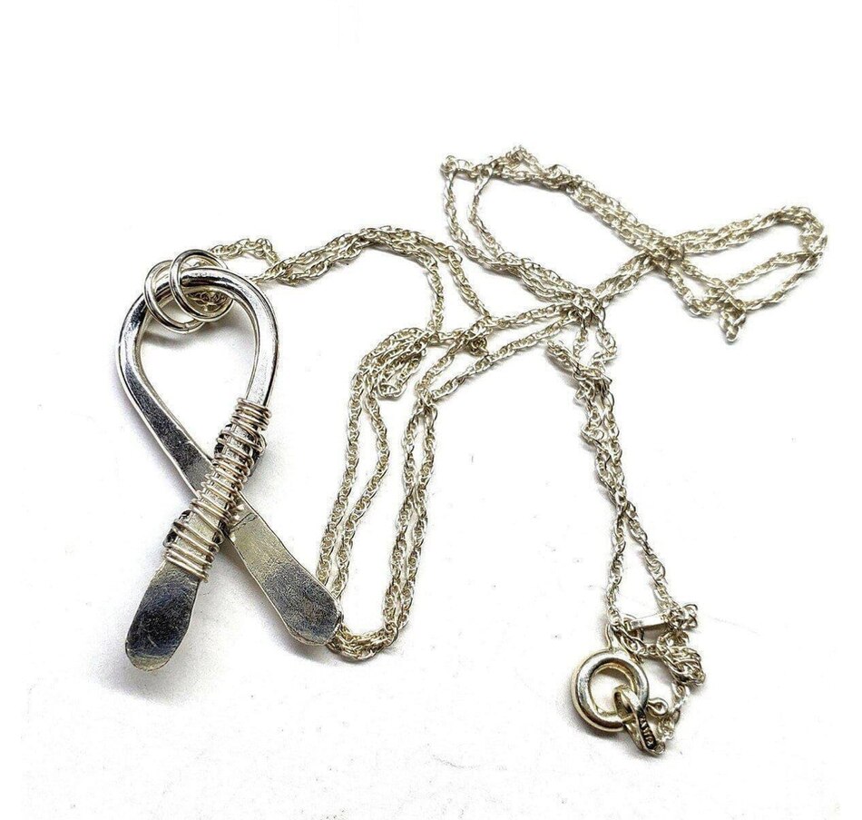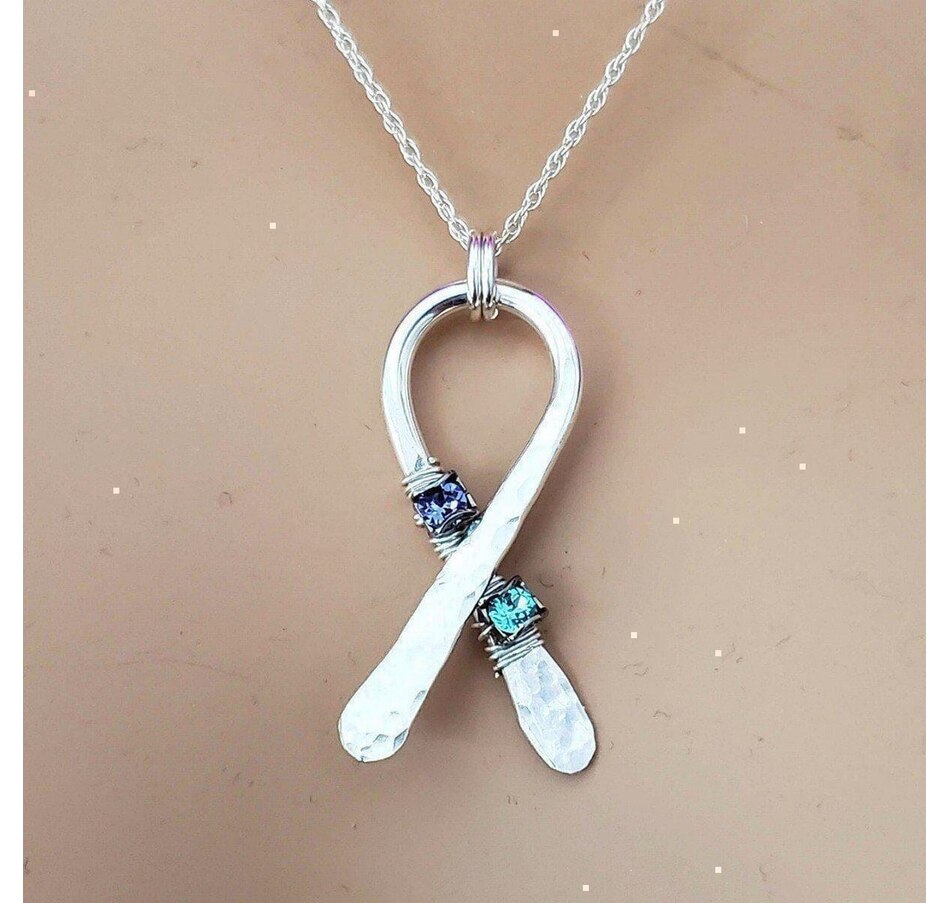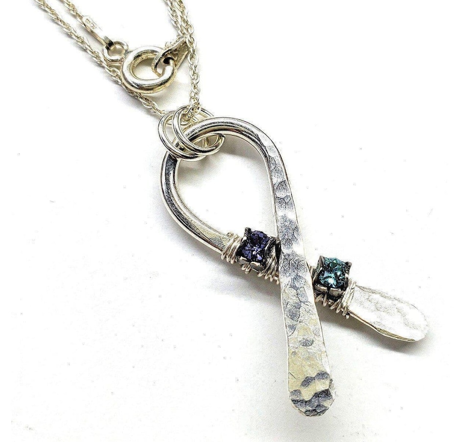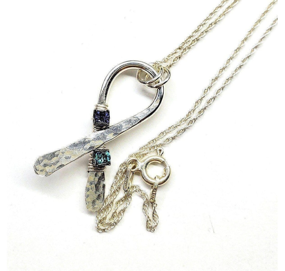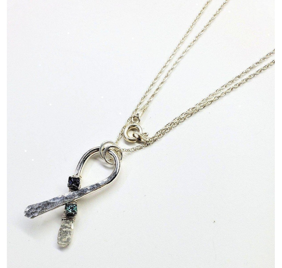 Wear this beautiful Silver Suicide Prevention Awareness Ribbon Necklace as a reminder of hope and comfort. Featuring a handcrafted sterling silver ribbon with purple and teal Swarovski crystals, each uniquely patterned and securely wrapped. Show your support with this 18-inch sterling silver chain necklace.Original Design Butler12 gauge sterling silver wire ribbon charmSculpted, hammer patternedSize is 1-inch x 1/2 inch approx.2 silver metal-encased Swarovski crystals are wired onto the ribbonSwarovski Crystal awareness colors purple and tealSterling silver rope chain with spring closureThe dainty chain is Made in ItalyNecklace length 18 inchesHandmade in Montana FACTS:Before CovidIn the U.S., suicide rates are highest during the spring. Suicide is the 3rd leading cause of death for 15 to 24-year-old's and 2nd for 24 to 35-year-olds. On average, 1 person commits suicide every 16.2 minutes. Each suicide intimately affects at least 6 other people.These suicide prevention awareness ribbon charm necklaces are dedicated to the many lives lost due to depression, self-hatred, childhood trauma, neglect, feel unloved or not wanted, drugs, unstable homes, and so many more reasons.These suicide necklaces are dedicated to the many friends our kids lost during their middle school and high school. May they rest in peace till Jesus returns.