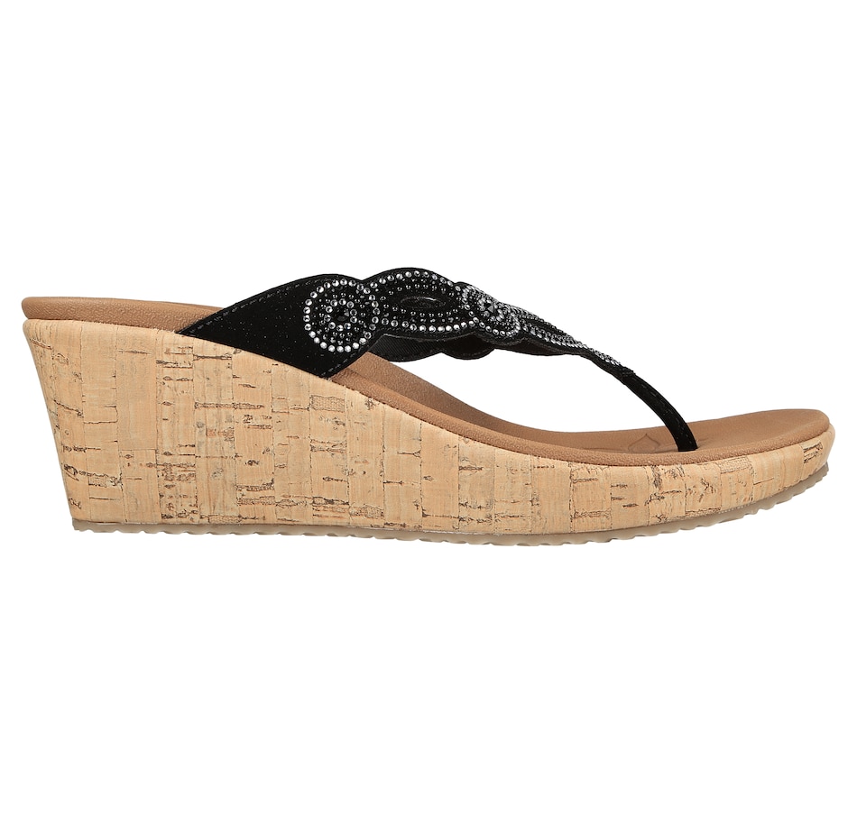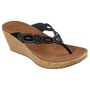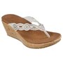 This fashion wedge heeled thong sandal features a rhinestone embellished synthetic upper with a luxe foam footbed.
