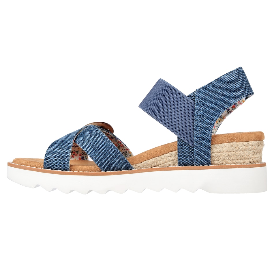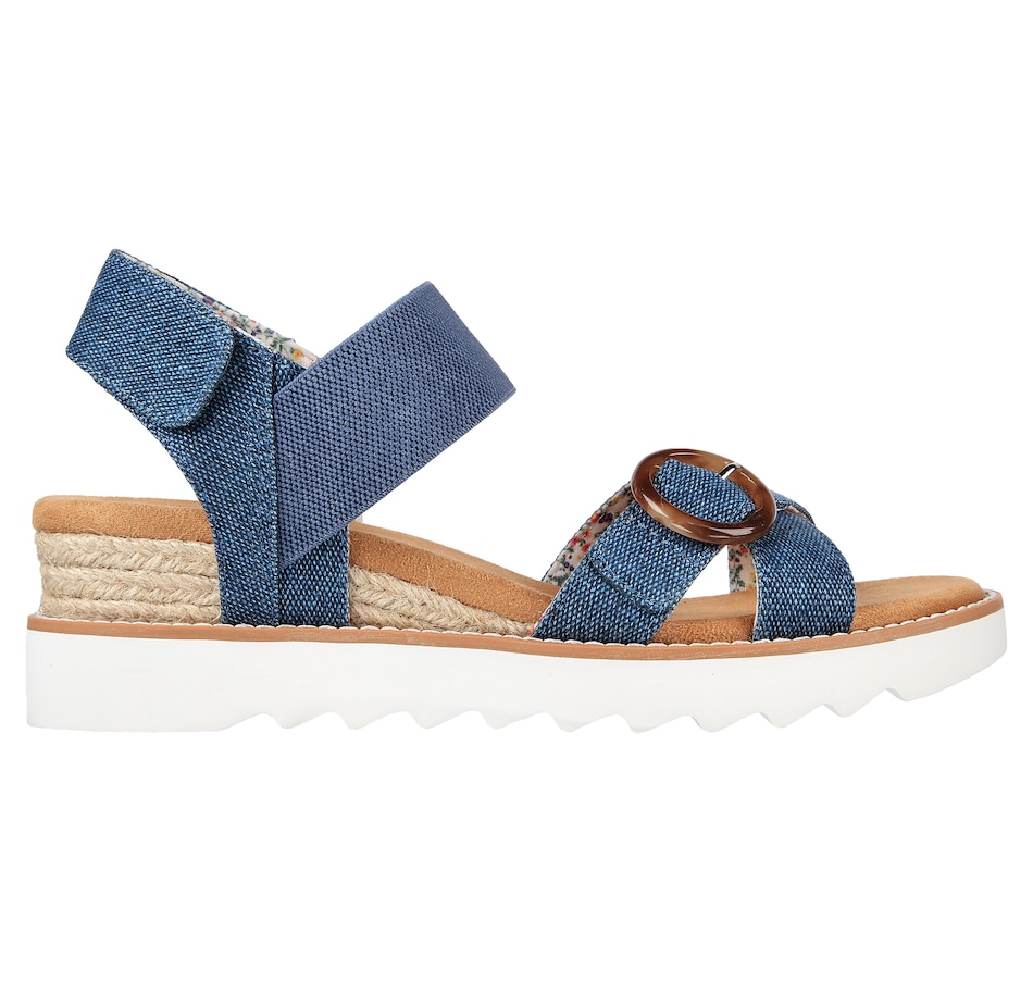 This strappy footwear features a linen and stretch fabric upper, and a cushioned memory foam footbed.